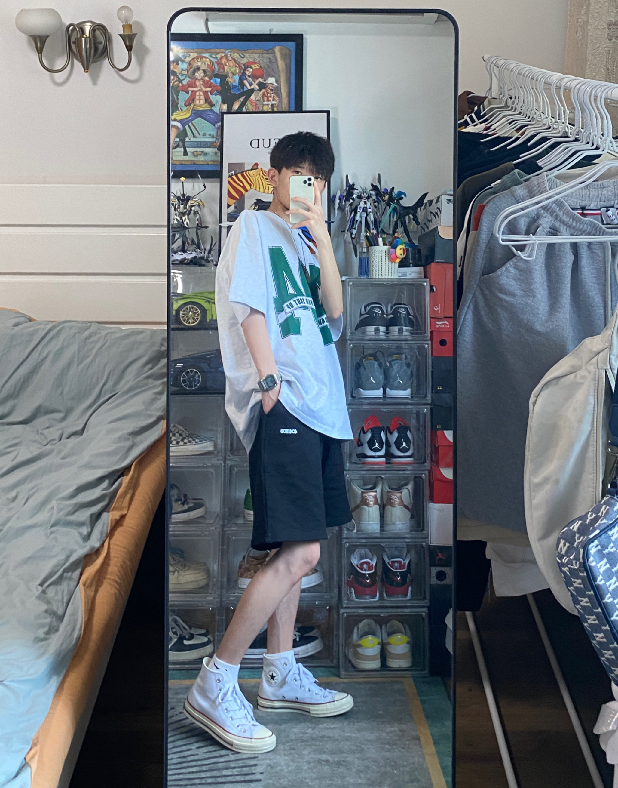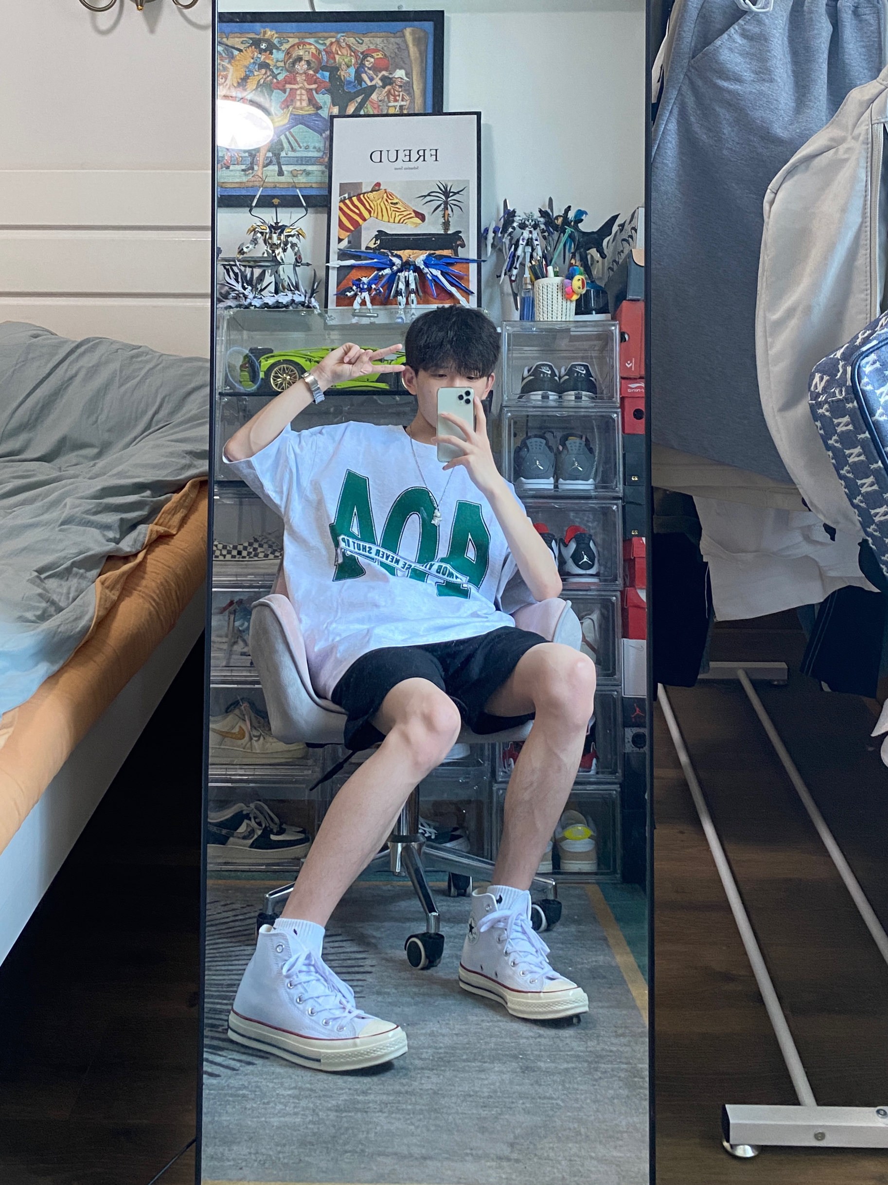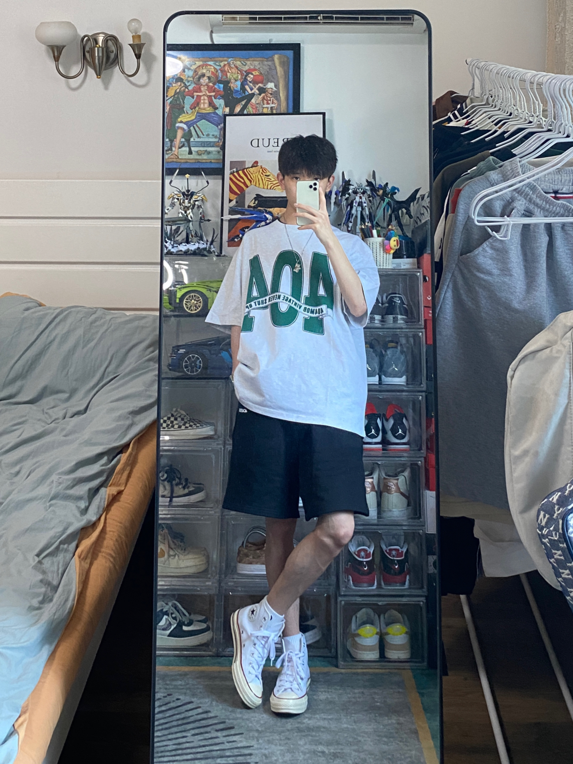 今天的穿搭分享来啦🎉🎉🎉 衣服是一件花灰色宽松短T 因为这几天超喜欢这种oversize风格 所以买的都是宽松大码T恤能盖住屁股的🤩 裤子是一条简单的黑色短裤 左裤腿上有一个小logo非常简约 简单的设计使它能搭配各种风格的衣服🥳 今天上脚的鞋子是匡威的白色基础款 它采用的面料是帆布的透气性很好 中低包裹的橡胶层有一条红线点缀 正因为是基础款所以价格很实惠 并且基础款也是百搭的代言词 这个夏天何不...