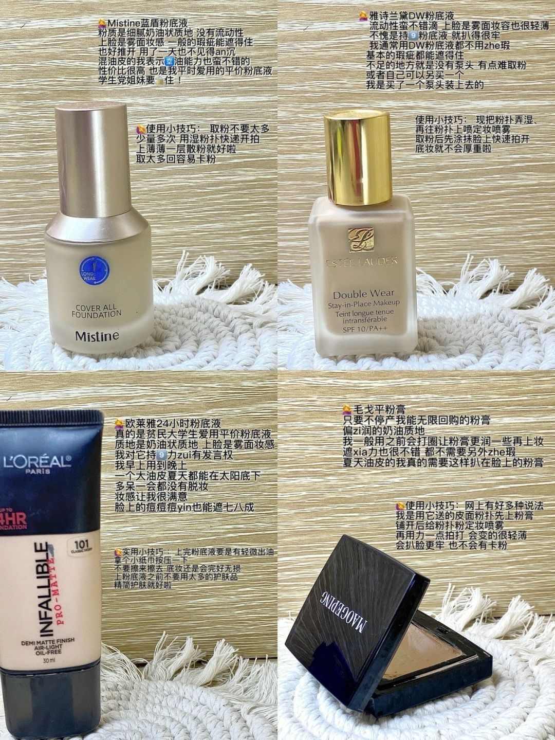 混油皮夏天必入4⃣️款粉底液|详细色号选择👇|||⚪️Mistine蓝盾粉底液 中性一白LF100:颜色明亮适合白皮以及黄一白的 中性二白LF110: 轻微偏橄榄,亮度适中,适合大部分姐妹们的色号啦~ 粉调二白LP110:色调偏红,比较适合红皮和粉皮的姐妹 黄调二白NN120:黄调深肤色的姐妹可以试~ ⚪️雅诗兰黛DW粉底液 1W1黄调一白:适合暖白皮 黄1白用这个色号比较不容易踩雷 1W2黄调二...