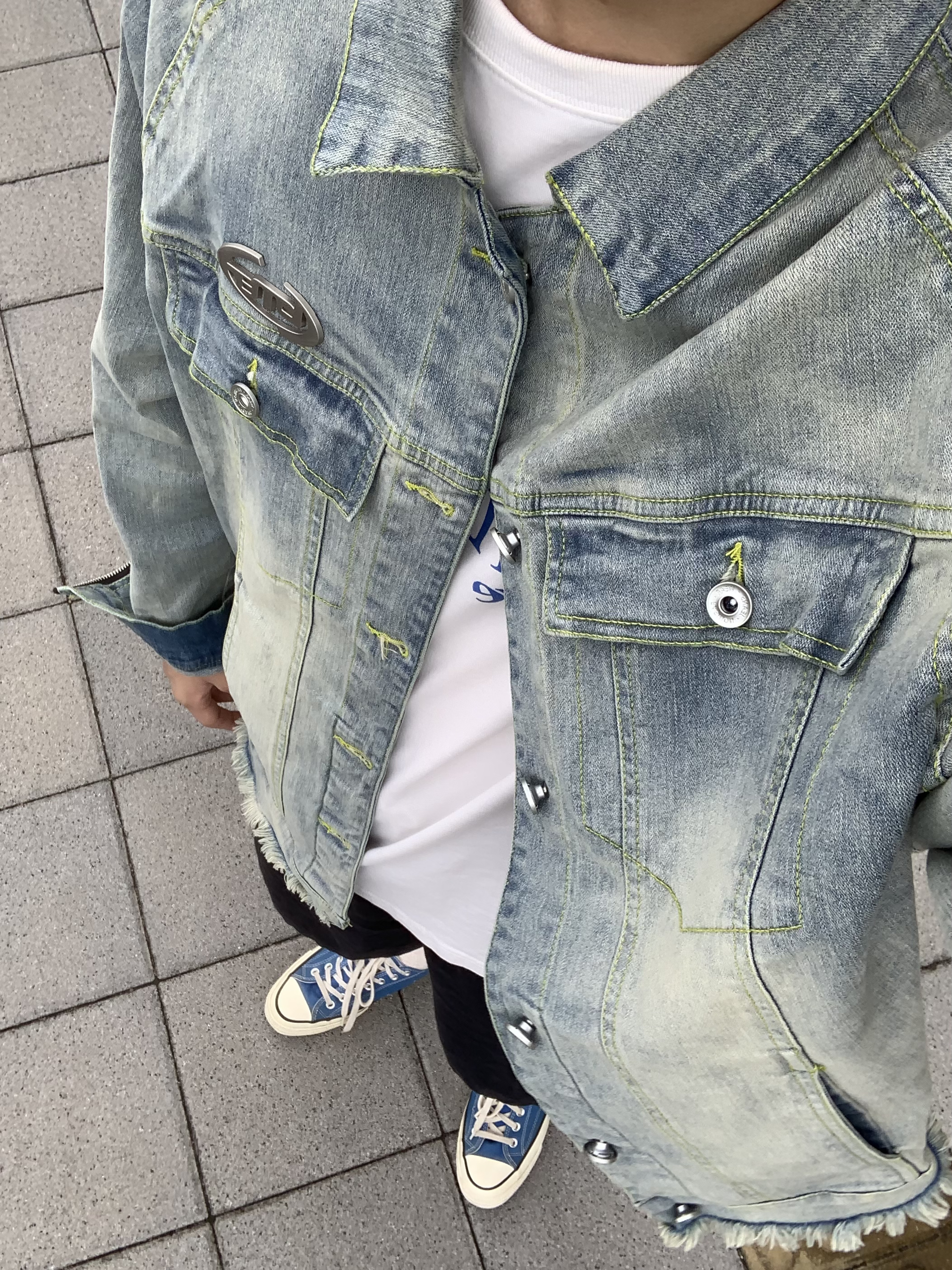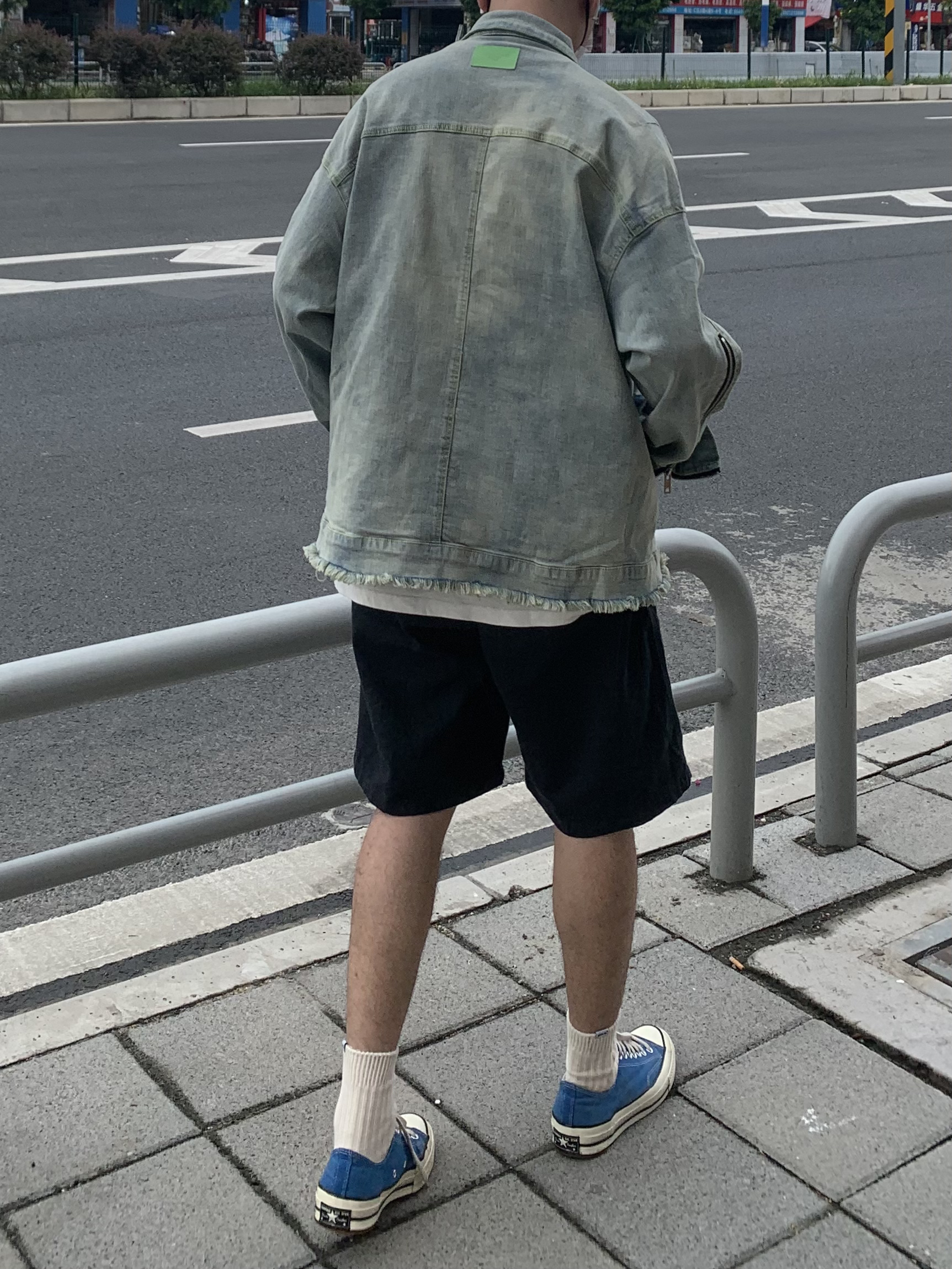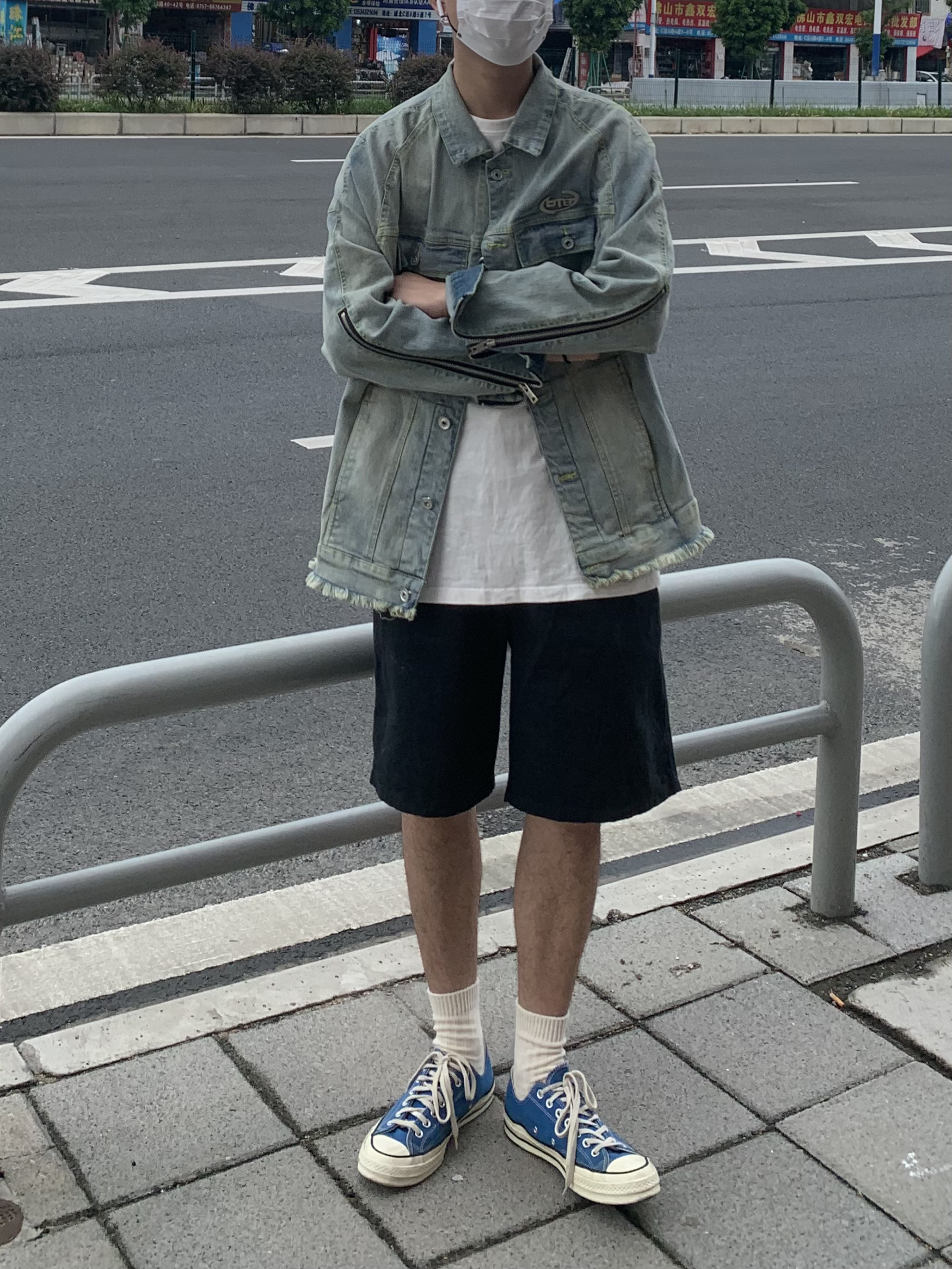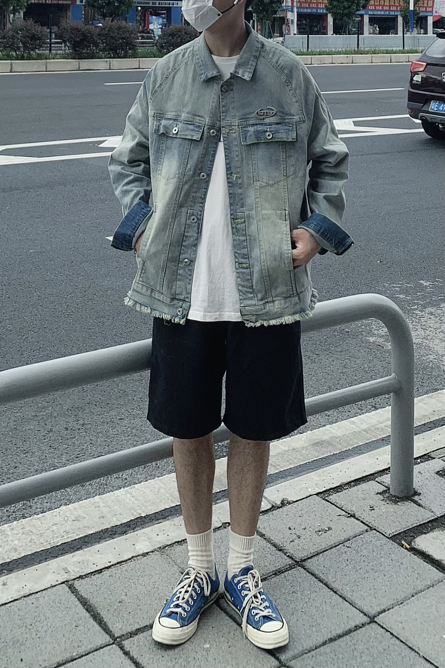 阴天配牛仔🤠 以前对牛仔外套一直都比较难接受 真香了 做旧宽松版型 厚度对于现在入秋来说正好不过 内搭一件简约的白色蓝印花tee 呼应一下牛仔外套的颜色 黑色的纯色五分休闲短裤 百搭神器了 一双湖水蓝匡威 休闲又舒适~