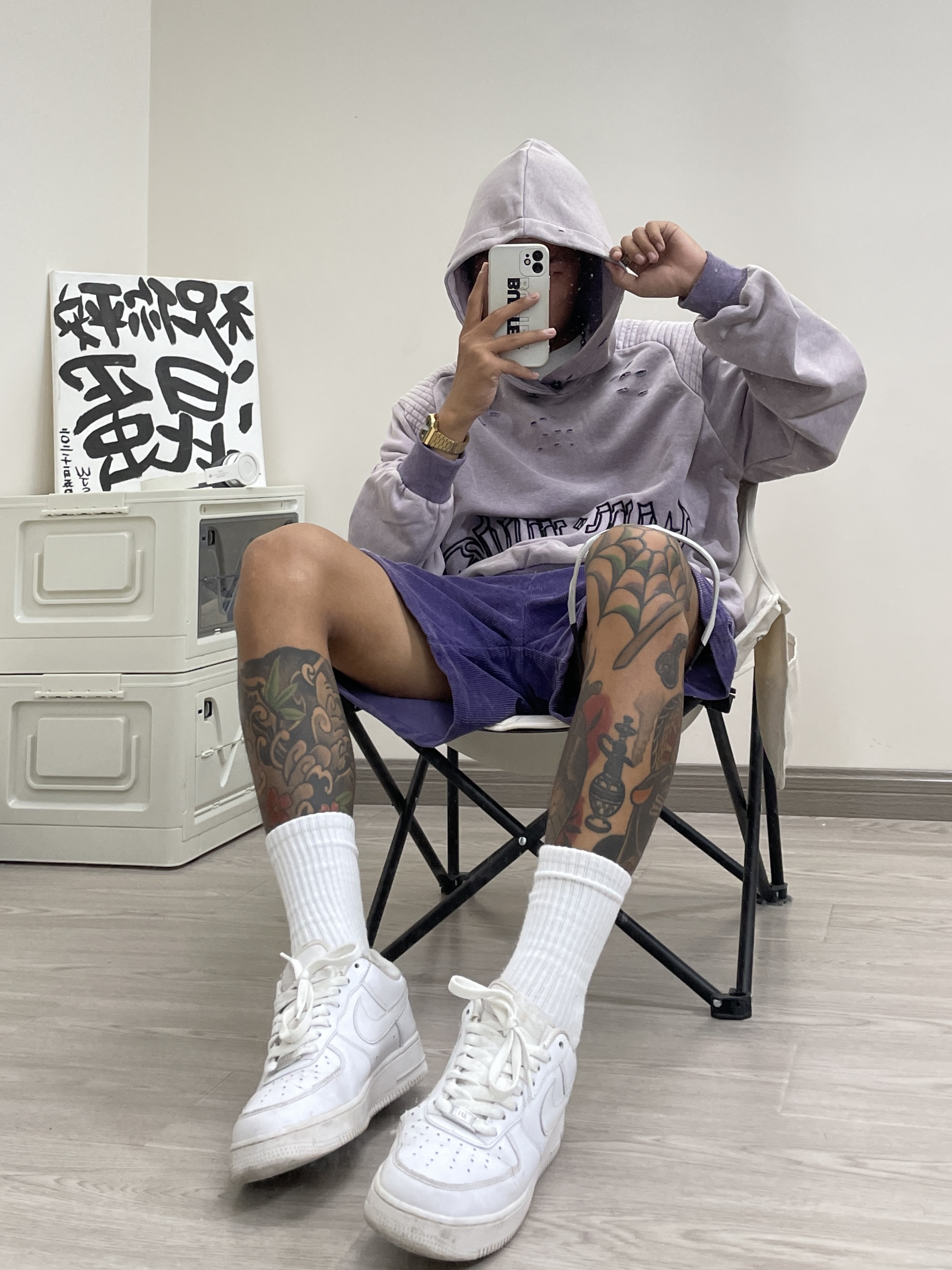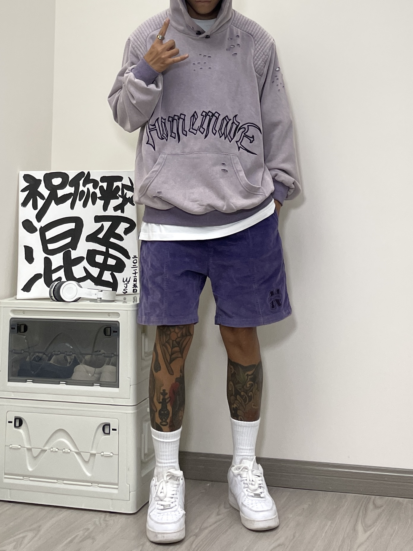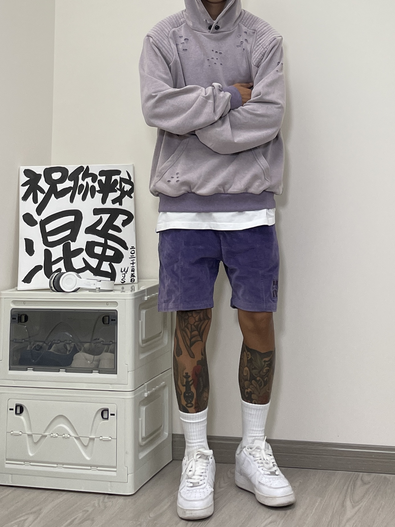 美式复古了解一下~ 👔 上衣是一件做旧破坏水洗帽衫,水洗的淡紫配色、多处破话细节复古味儿十足,肩膀处的加厚垫肩设计拿捏住我这个小塌肩了!帽子也够深。 🩳 搭配上衣选择了一条同样色系的短裤,灯芯绒材质整体视觉看上去更为复古,合身的版型美式风格很浓了。 👟 永远百搭的纯白AF1 衣服/BLACKBESS黑贝丝 短裤/chiggalab 鞋子/AF1