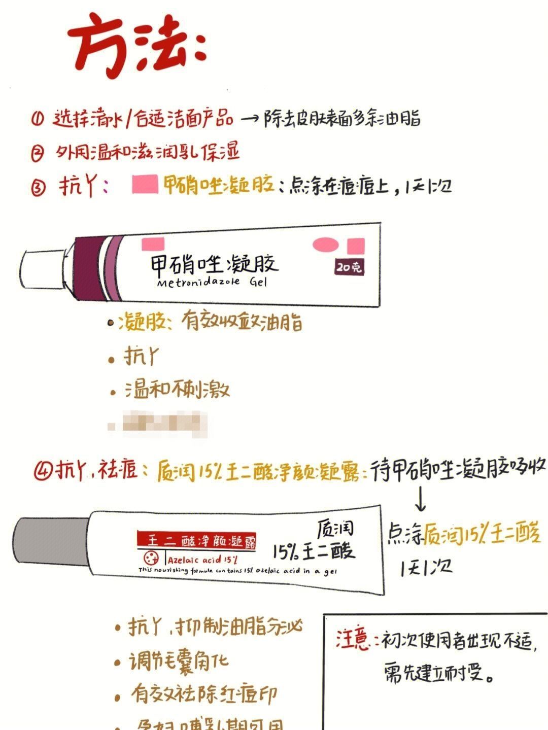 |🙋好发于青少年, 与青春期雄激素水平上升,或雄激素与雌激素水平失衡,导致皮脂腺分泌增加,从而导致的一系列症状(具体机制请看图二)。 👉最好发于面颊、 额部,其次是胸部、 背部及肩部,多对称分布。一-般无明显症状,Y症明显时可有疼痛部分,可遗留红色痘印/色素沉着。 👉方法: 可选择清水/合适洁面产品洗脸,除去皮肤表面多余油脂。 外用: 先点涂甲硝唑凝胶消Y, 等待皮肤吸收后, 再点涂质润15%壬二...