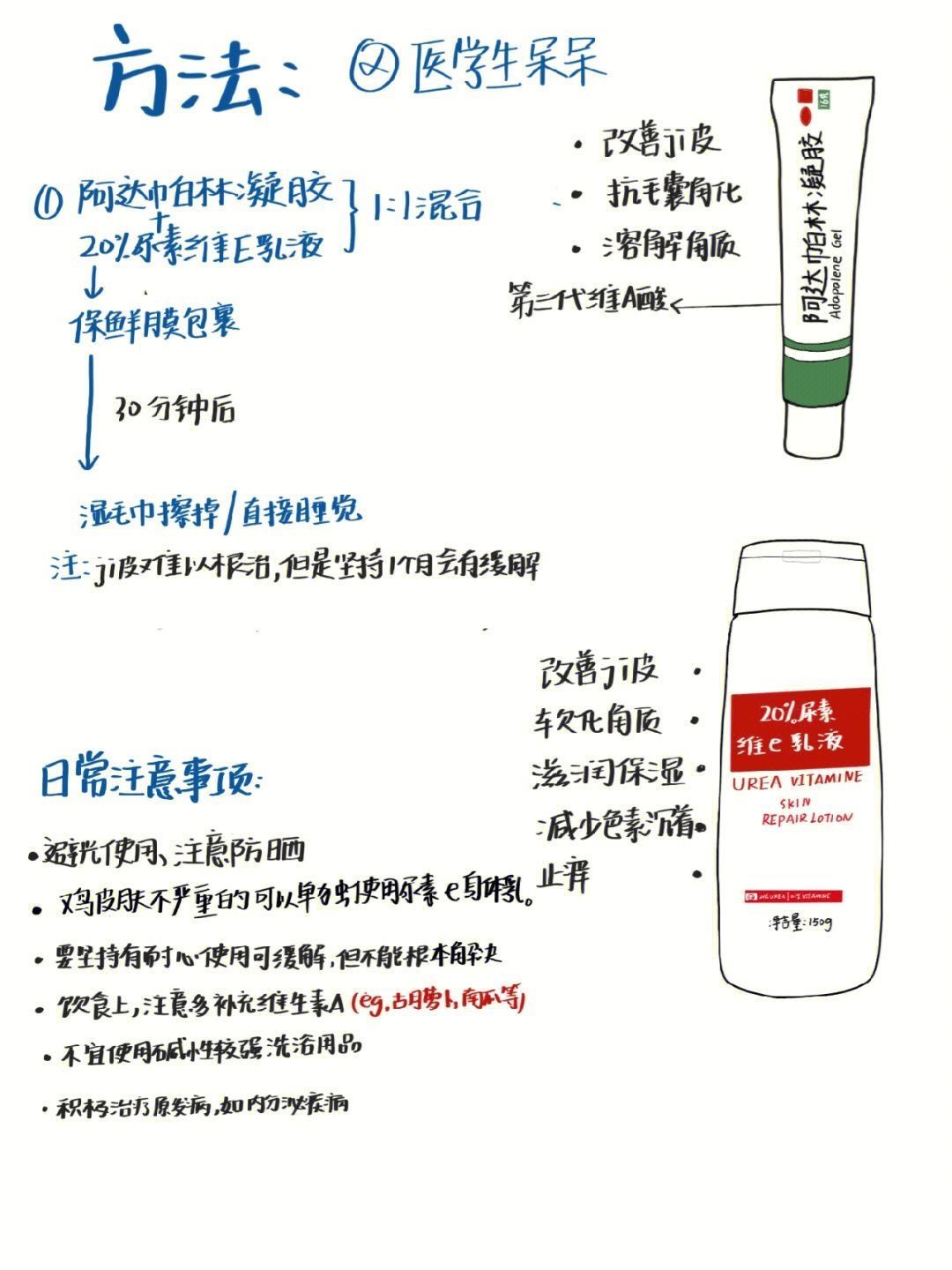 夏天到了,好多朋友为鸡皮肤而困扰。鸡皮肤也称为毛周角化,病因和机制未明,但可能遗传因素、维生素A缺乏、代谢障碍或甲状腺功能低下等相关内分泌因素有关。 典型表现:好发于上臂及大腿,也可见于臀部,肩胛,面部,小腿等处对称分布,青春期时明显成年后缓解。皮肤粗糙感,摸上去麻麻赖赖。皮损为针尖大小毛囊性丘疹—水疱—脓水疱,通常无症状,有时微痒。 缓解方法:阿达帕林凝胶和20%尿素维E乳液1:1混合涂抹。 日...