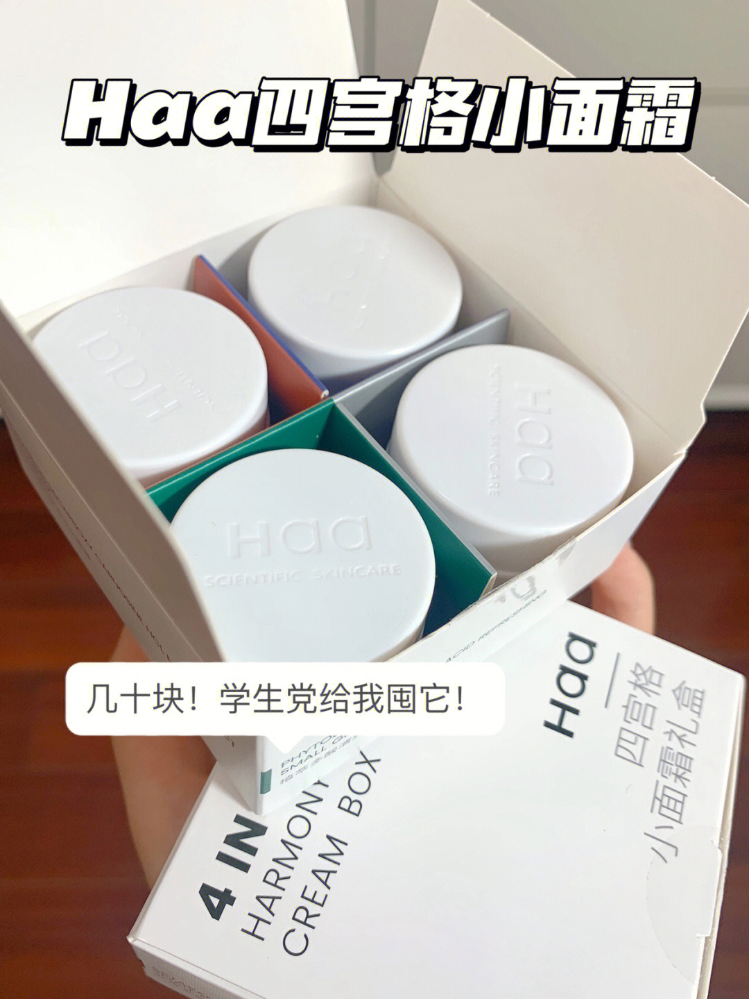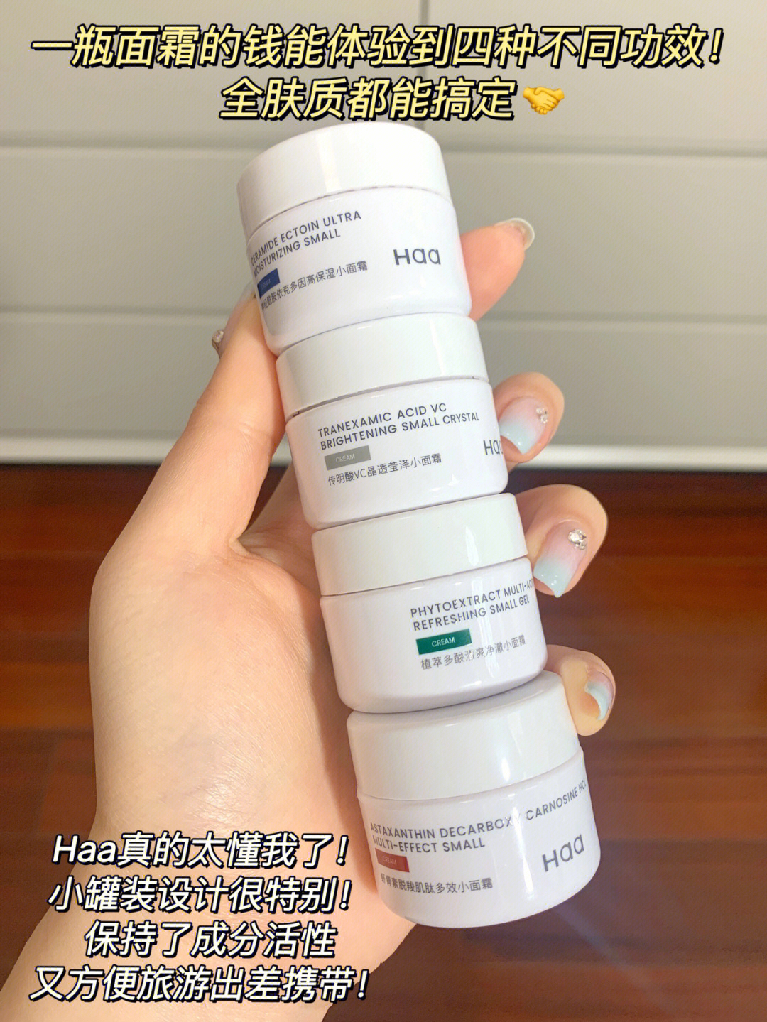 看我又挖到啥好东西了!! 我愿称这套面霜为小众黑🐎面霜! 💚Haa四宫格小面霜做得也太可爱了吧! 贼迷你!四小个一只手就能握下! 四罐功效都不同,分别针对不同肤质☑️ 再也不用头疼选很久面霜了!! - 🔥神经酰胺小面霜【保湿修护】 适合所有肤质!敏感肌和干皮也放心用! 主打神经酰胺和依克多因这俩cp! 修护皮肤屏障的同时做到高保湿! 还含有b5泛醇和积雪草提取物来舒缓泛红肌肤、锁住水分~ 🧡虾青素...