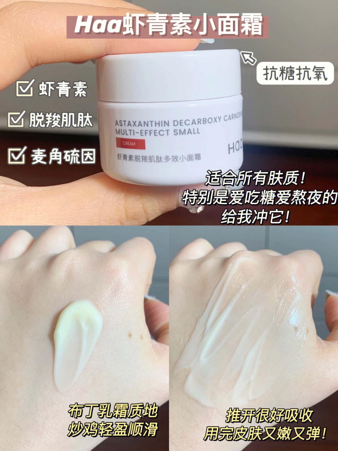 本篇笔记关联了【小样】Haa 虾青素脱羧肌肽多效面霜 高保湿紧致舒缓抗氧化改善暗沉痘印细腻毛孔 虾青素、【小样】Haa 虾青素脱羧肌肽多效面霜 高保湿紧致舒缓抗氧化改善暗沉痘印细腻毛孔 神经酰胺、【小样】Haa 虾青素脱羧肌肽多效面霜 高保湿紧致舒缓抗氧化改善暗沉痘印细腻毛孔 植萃多酸等商品,为用户提供真实的使用体验和购买参考。