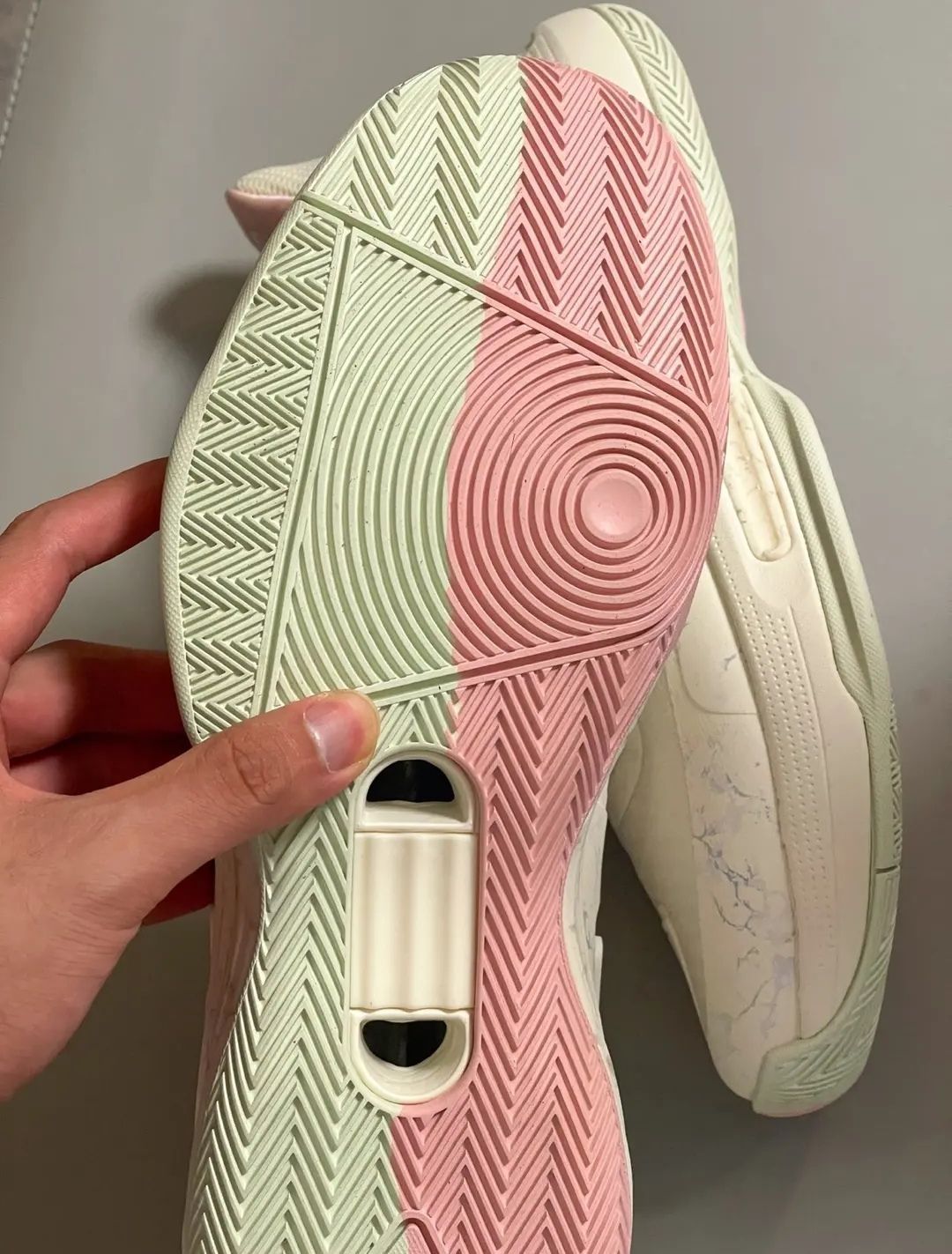 这双鞋以帆布白配色为主色调,鞋头采用和上一代一样的匹克三角 logo 。 鞋面同样采用高性能复合网布材质,搭配大面积热熔压胶,带来不错的包裹性,鞋面支撑性和透气性,后跟增加脚踝填充,防止出现上一代的掉跟问题。外底采用了不规则纹路,能提供很好的防滑和抓地。 抗扭上采用双层 TPU ,中底材质上层内置长方形尼龙板,下层是外置“H”型的 TPU ,能提供非常不错的抗扭。 中底采用了一模双密,前掌超级魔弹...