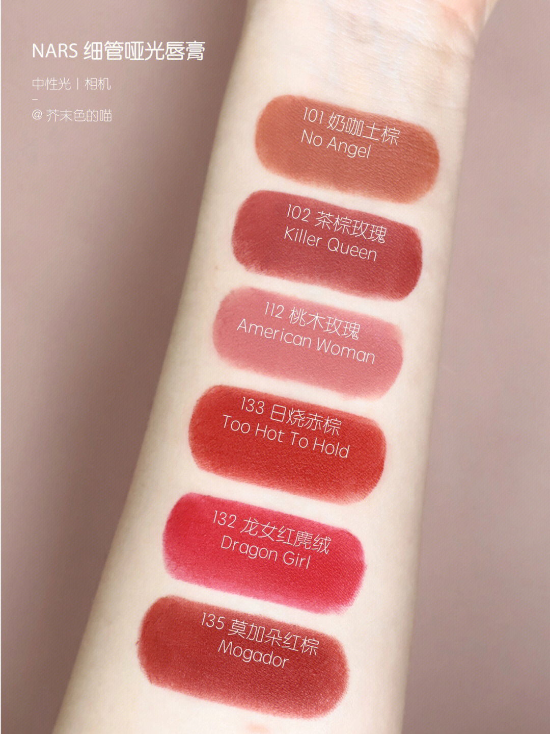 本篇笔记关联了NARS/娜斯 秋冬磨砂细管口红 哑光雾感持色 1.5g 101奶咖土棕no angel、NARS/娜斯 秋冬磨砂细管口红 哑光雾感持色 1.5g 135莫加朵红棕mogador 、NARS/娜斯 秋冬磨砂细管口红 哑光雾感持色 1.5g 102茶棕玫瑰killer queen等商品,为用户提供真实的使用体验和购买参考。
