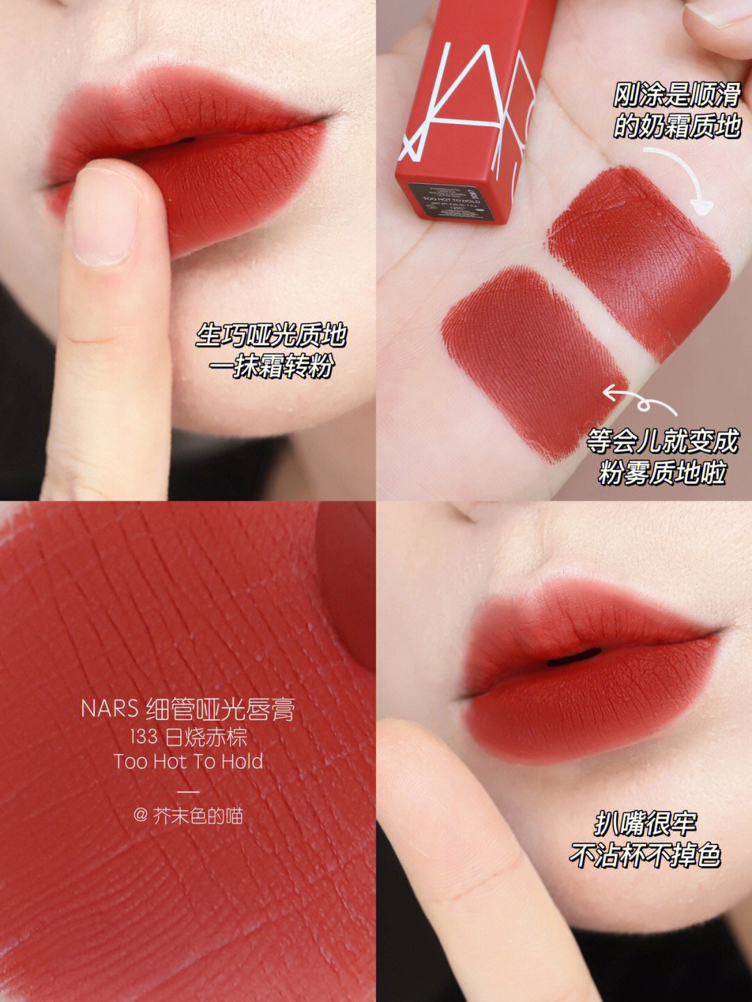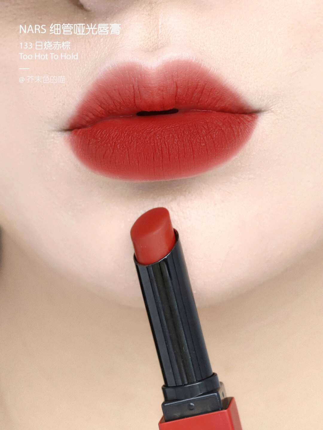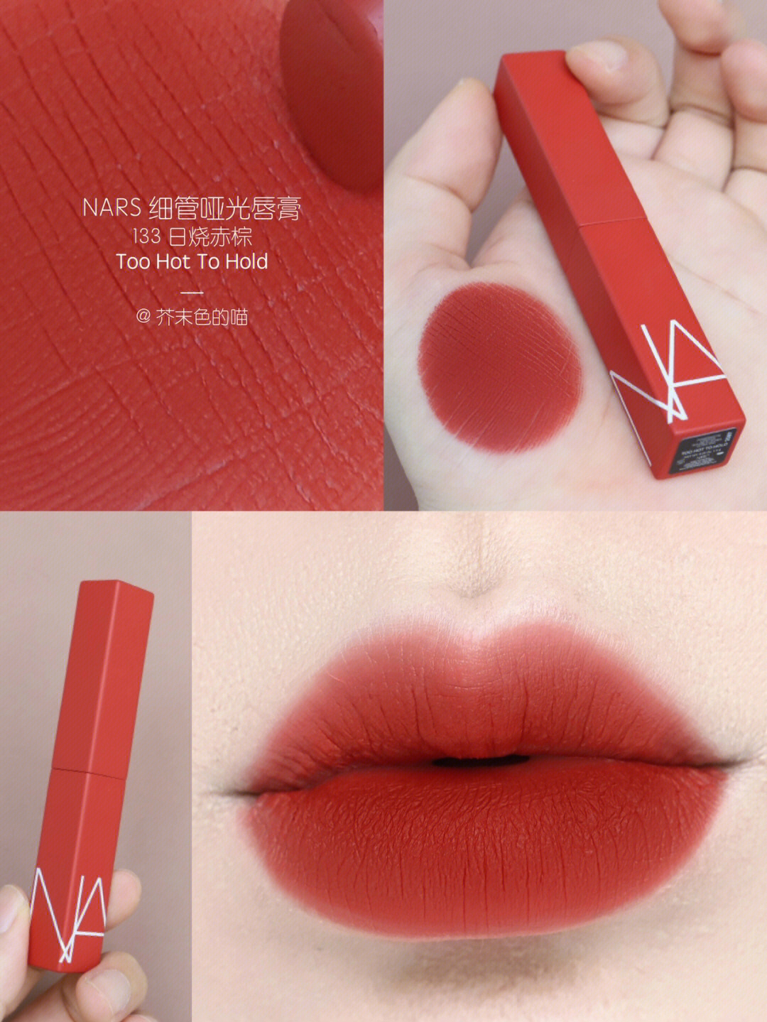 口棕女孩看过来!交作业了交作业了! 💋NARS哑光细管真是让人惊喜的新品! 整个系列都好能打!毫无鸡肋可言! 每一只都是神来之笔! 自己卷自己NARS你可真行! - 质感刚涂上是非常顺滑的👉霜感 等一下就变成很扒嘴很高级的👉哑光粉雾感! 又好涂又很持色 不沾杯! 包装是沉甸甸的金属管! 管身的颜色也和膏体一致,真的太方便了! - 🌅133 日烧赤棕 Too Hot To Hold 这只日暮暖棕色真...