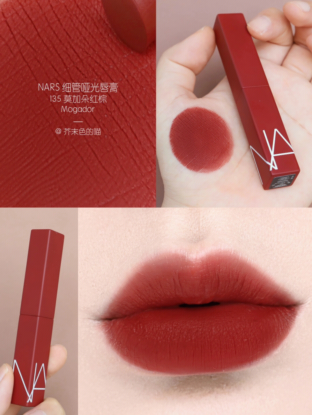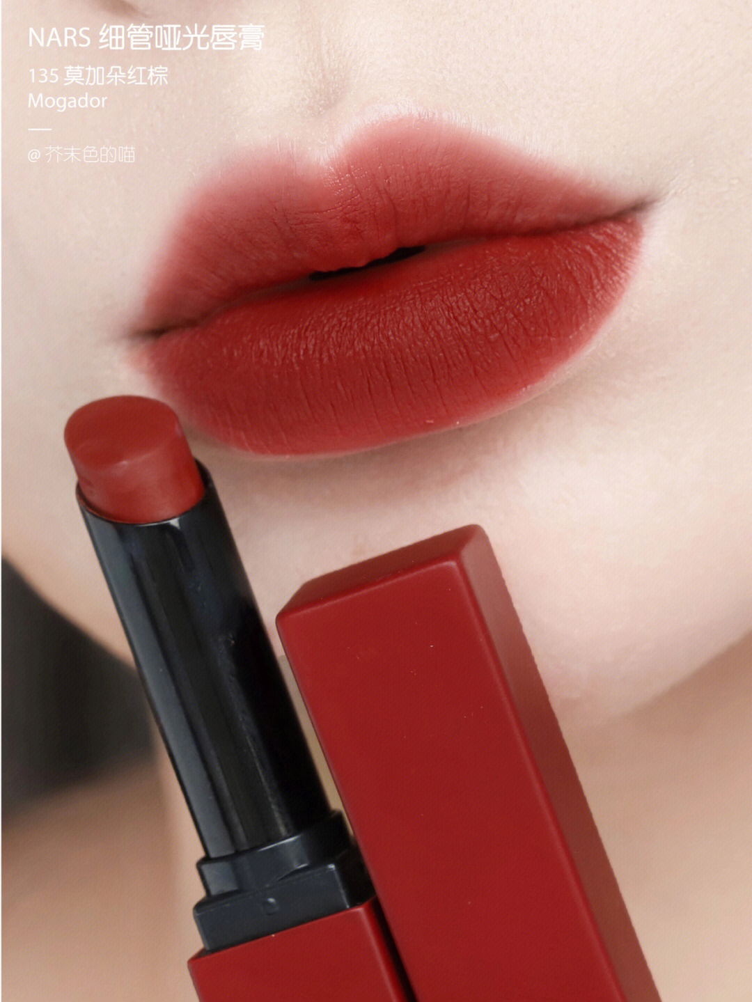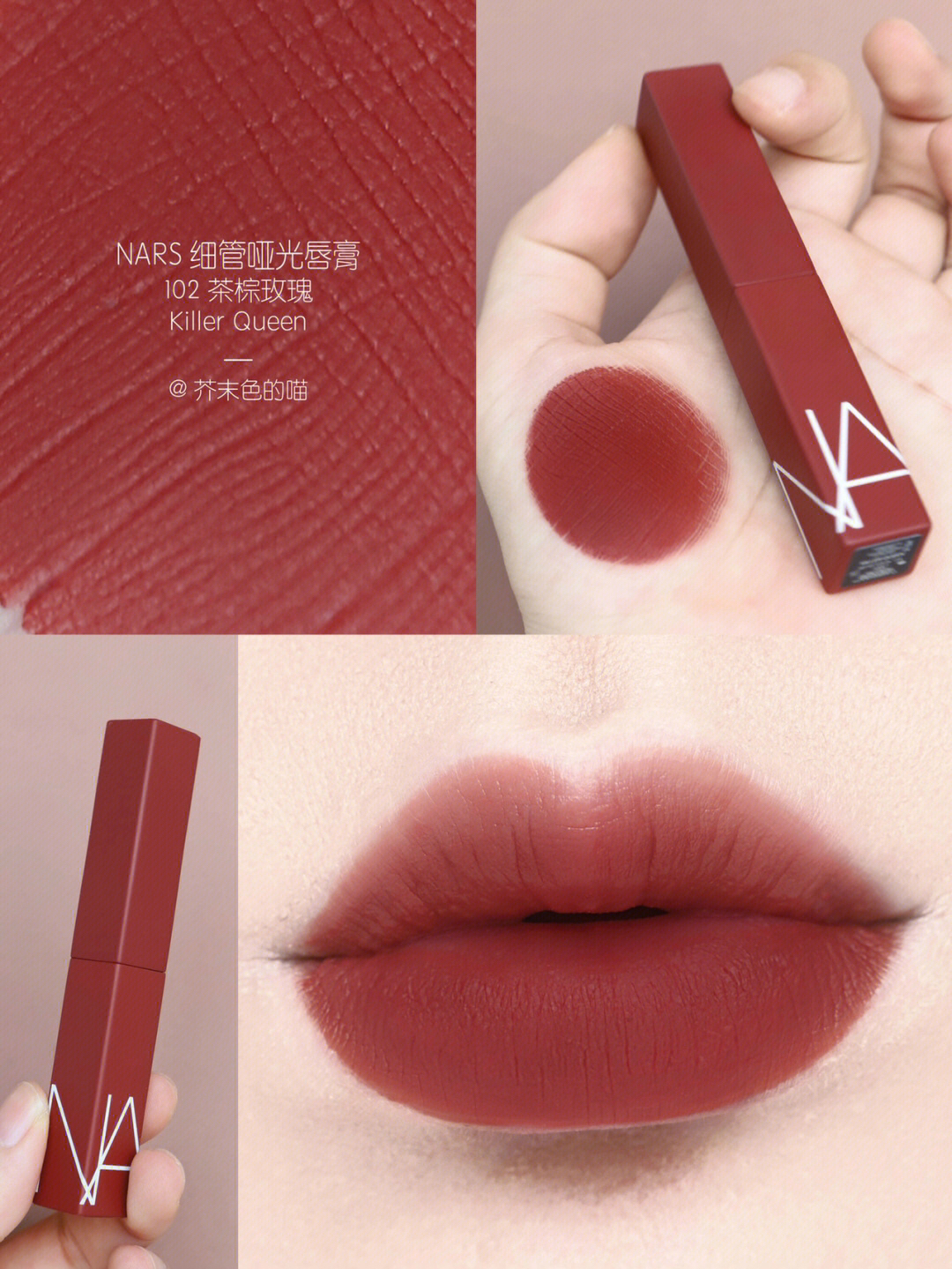 口棕女孩看过来!交作业了交作业了! 💋NARS哑光细管真是让人惊喜的新品! 整个系列都好能打!毫无鸡肋可言! 每一只都是神来之笔! 自己卷自己NARS你可真行! - 质感刚涂上是非常顺滑的👉霜感 等一下就变成很扒嘴很高级的👉哑光粉雾感! 又好涂又很持色 不沾杯! 包装是沉甸甸的金属管! 管身的颜色也和膏体一致,真的太方便了! - 🌅133 日烧赤棕 Too Hot To Hold 这只日暮暖棕色真...