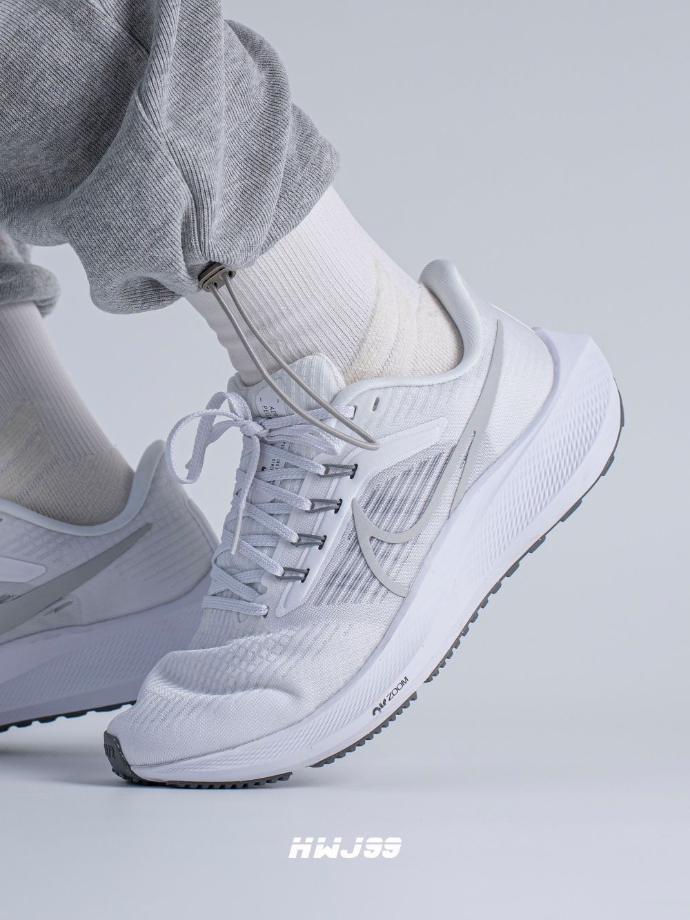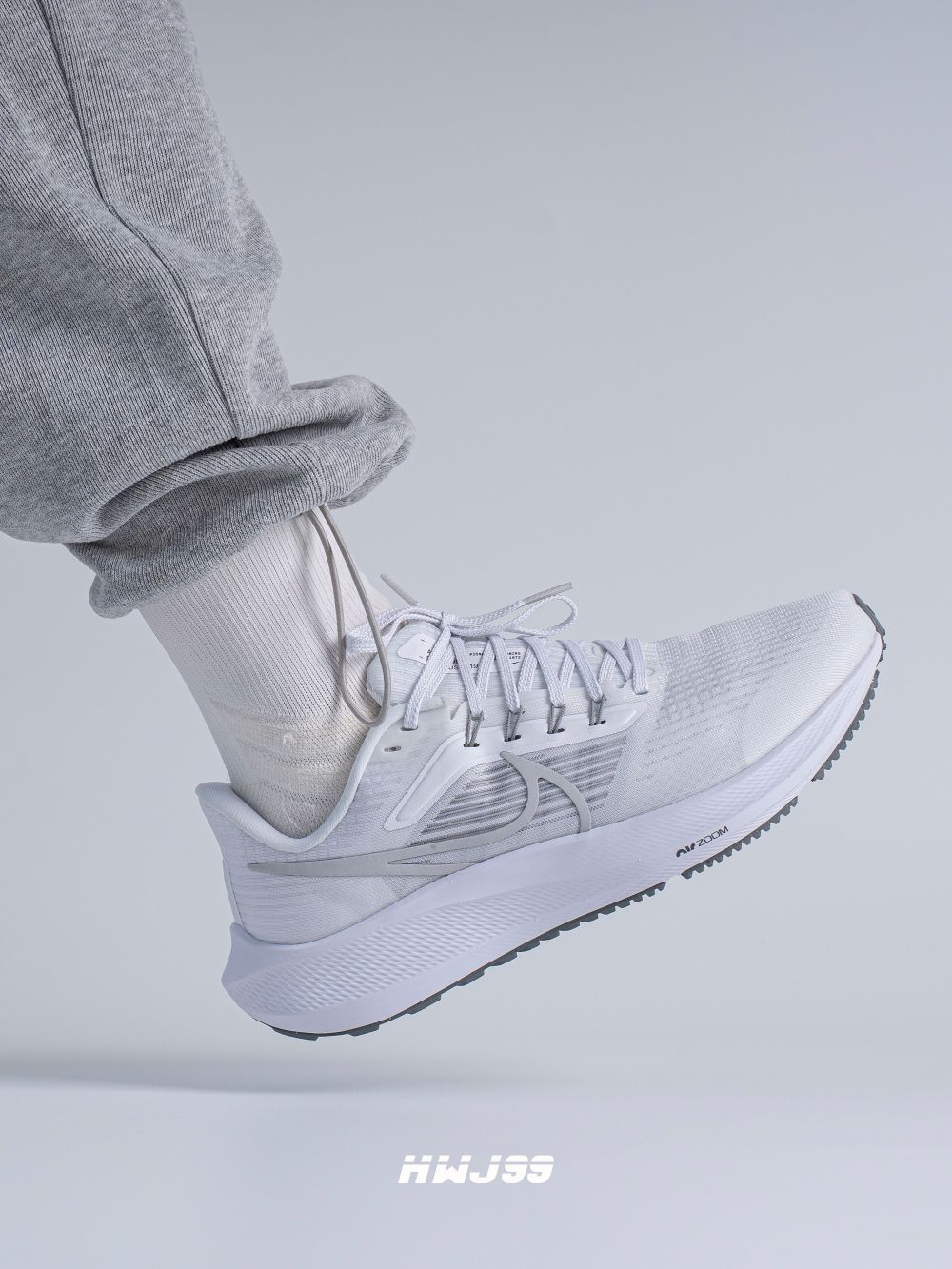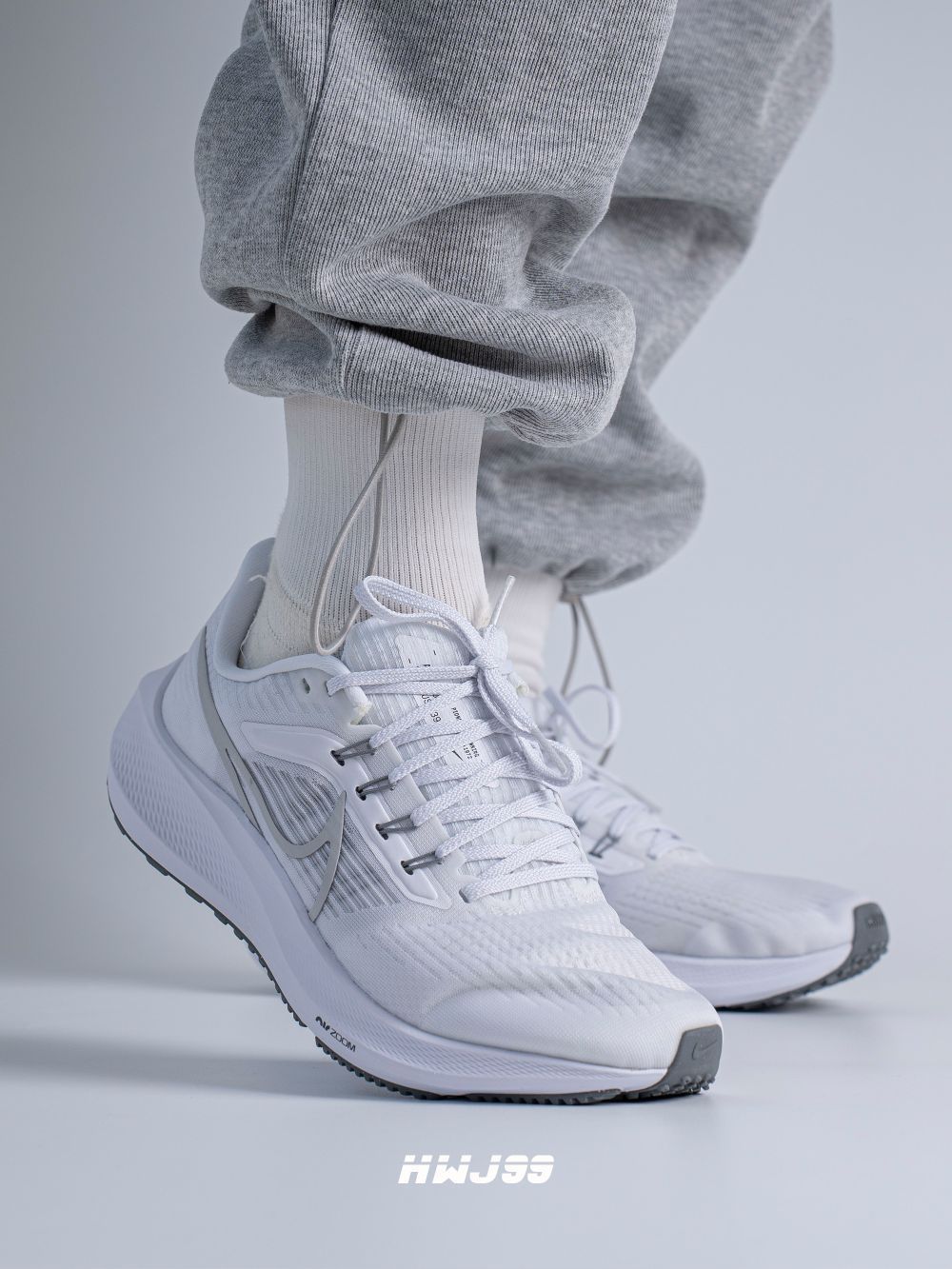 这款飞马39采用了纯白加淡灰配色,颜值是真不错,可也真的容易脏! 鞋子的鞋面很轻薄透气性方面还是非常不错的。系带设计,包覆感很强,并且有些不错的支撑,鞋底橡胶颗粒覆盖,防滑耐磨,前后两个ZOOM Air气垫,缓弹力极强。 说到底如果让我选择他去跑步,我真下不了脚,真怕脏!如果让我日常穿搭,我还是会选择的,毕竟脚感哇塞,颜值在线!