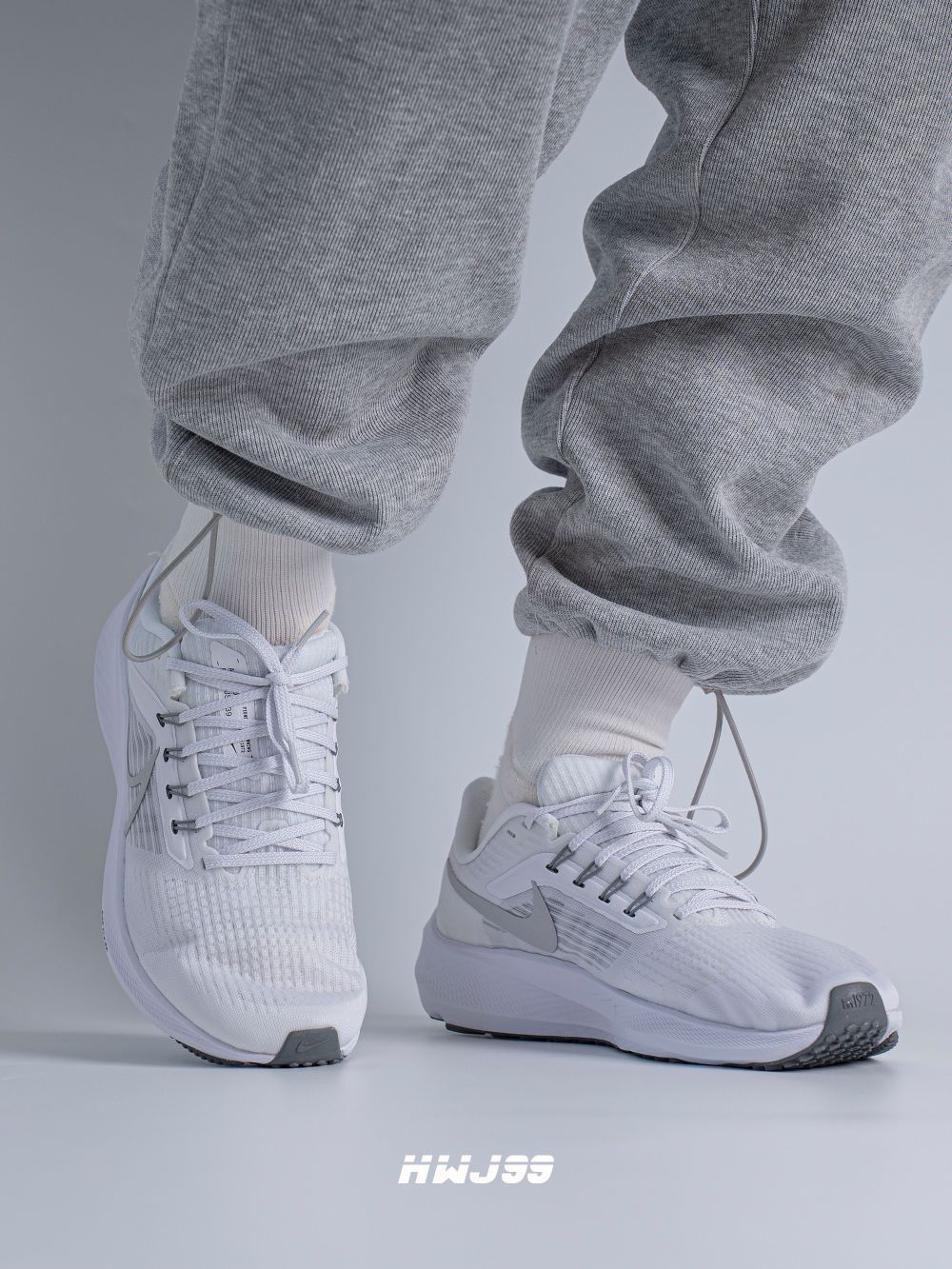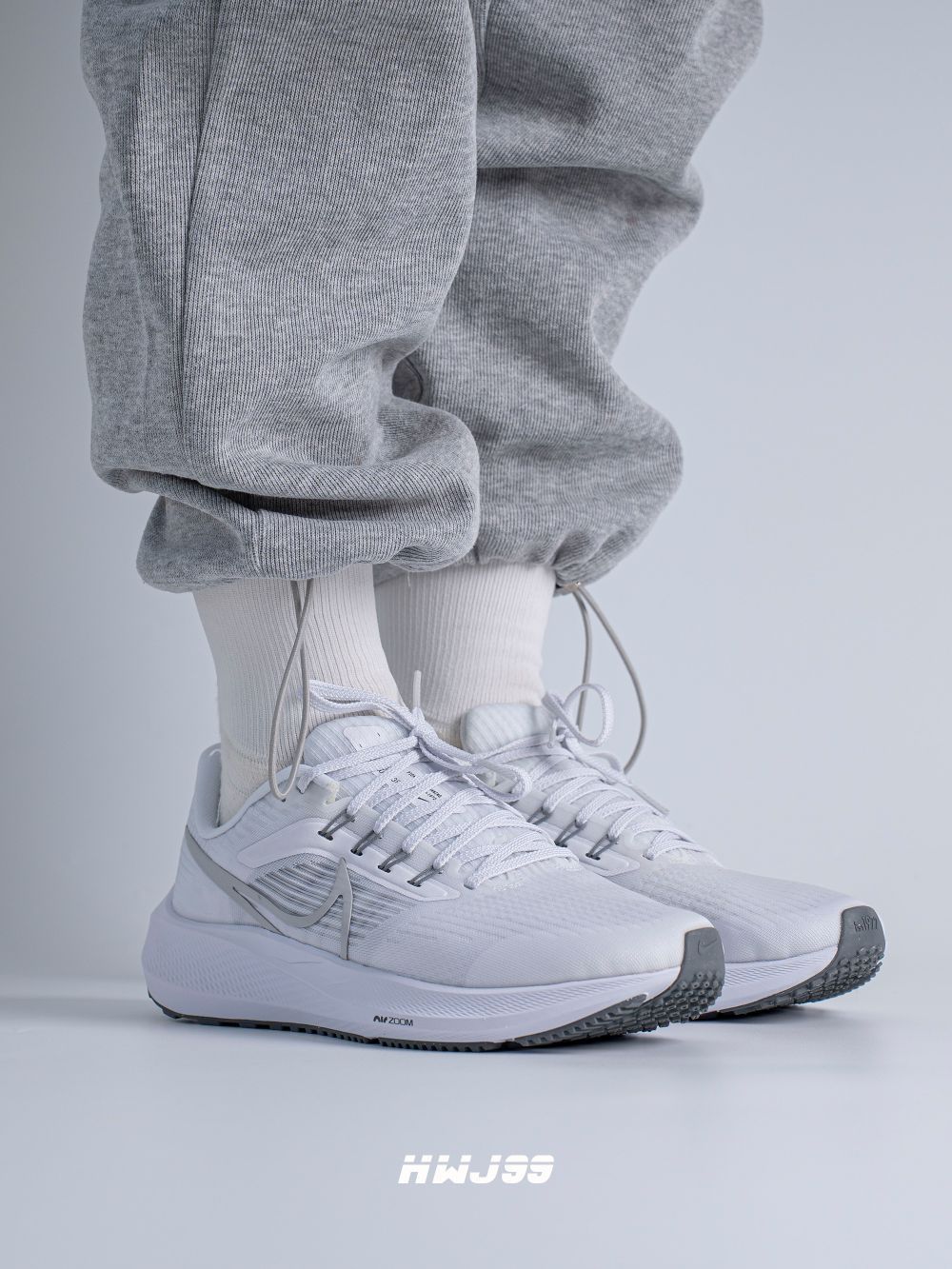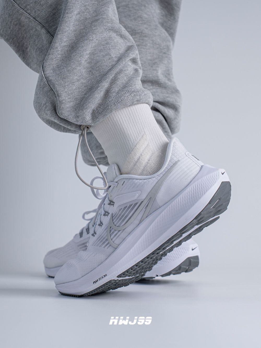 这款飞马39采用了纯白加淡灰配色,颜值是真不错,可也真的容易脏! 鞋子的鞋面很轻薄透气性方面还是非常不错的。系带设计,包覆感很强,并且有些不错的支撑,鞋底橡胶颗粒覆盖,防滑耐磨,前后两个ZOOM Air气垫,缓弹力极强。 说到底如果让我选择他去跑步,我真下不了脚,真怕脏!如果让我日常穿搭,我还是会选择的,毕竟脚感哇塞,颜值在线!