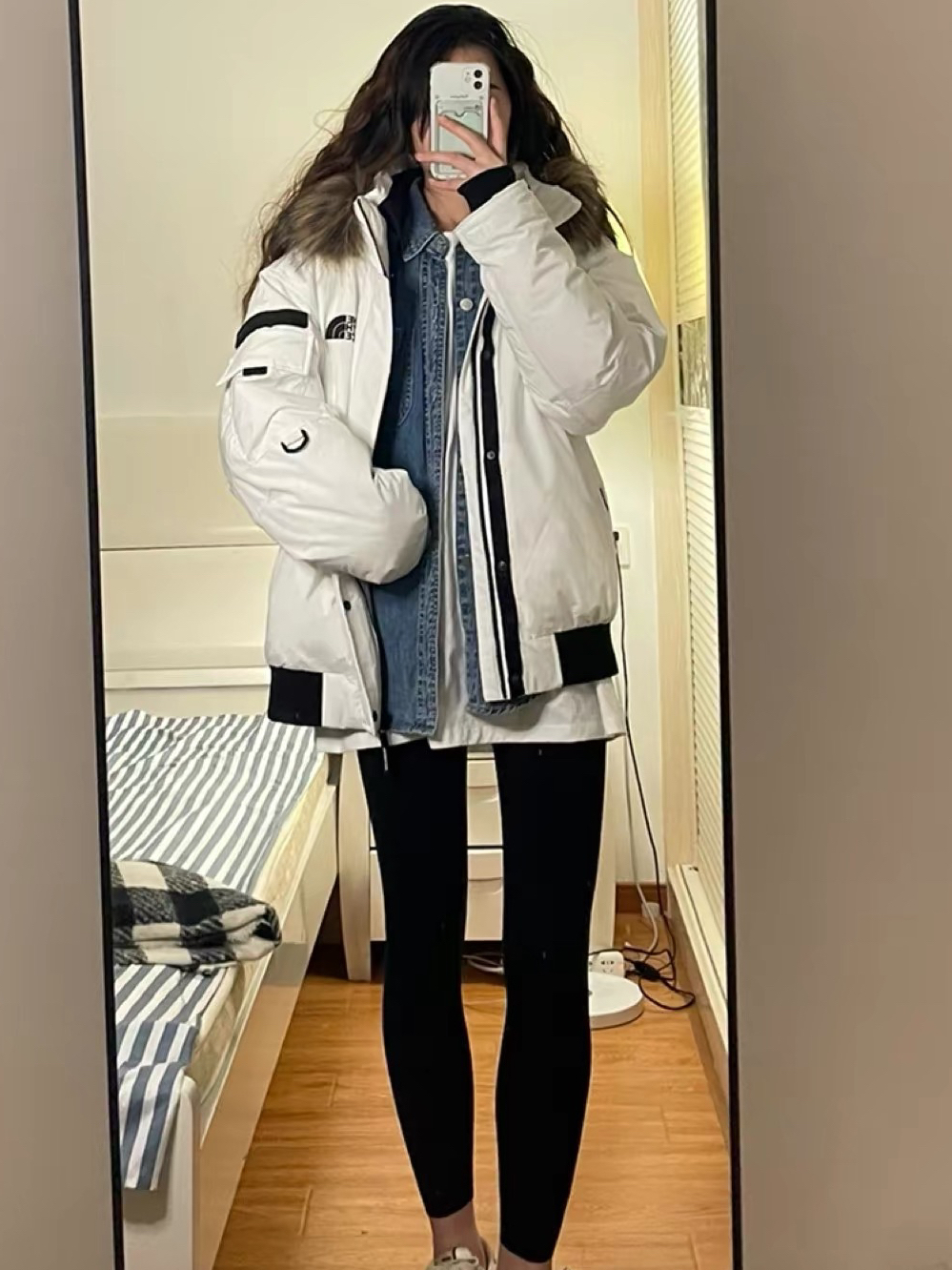 这个白色的短款羽绒服真的太百搭了!裹个围巾就是妥妥的韩系美女啦~ 衣服外面是那种皮革类型的,很厚实 超级暖暖和,怕冷星人闭眼入 搭配紧身打底裤,更绝了,超显瘦 我真是太爱啦❤️ (图片来自网络,侵删)