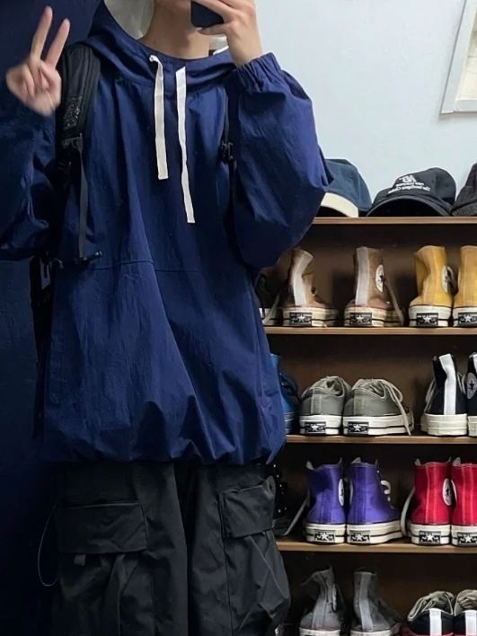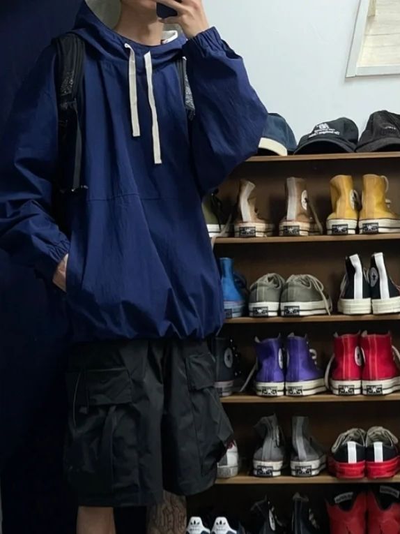 秋季冲锋衣安排上,今日穿搭上身藏蓝套头冲锋衣,裤子一条黑色短裤,鞋子穿了一双红色板鞋。 冲锋衣质感和版型都很不错,喜欢这样的颜色。穿搭有质感。