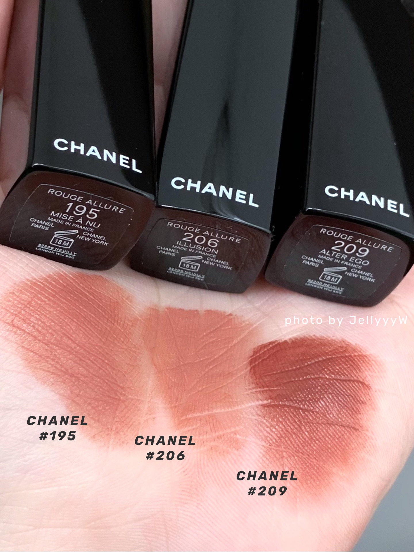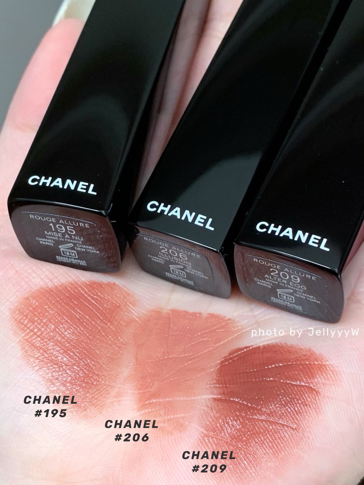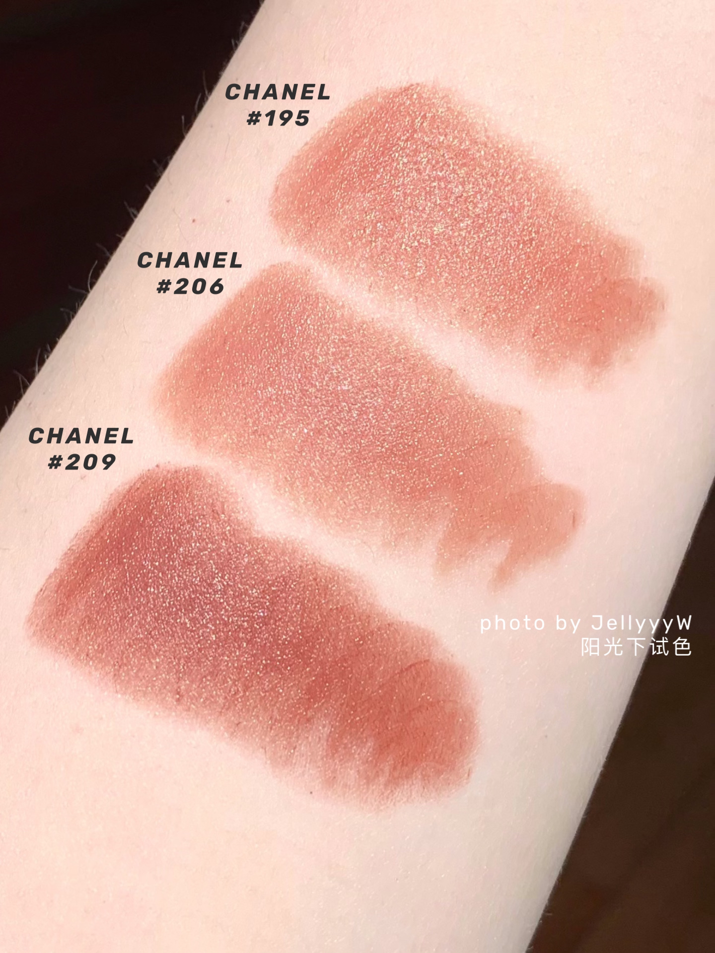 这三支颜色放一起就很舒服 把温柔刻在dna里了 又是我买了没发的过季新品 色号依次:chanel 195 mise a nu 206 illusion、209 alter ego 195和206第一眼看起来确实很像 但其实一个粉一点一个就是奶一点 两只都算蛮好看的但上嘴确实差距不大