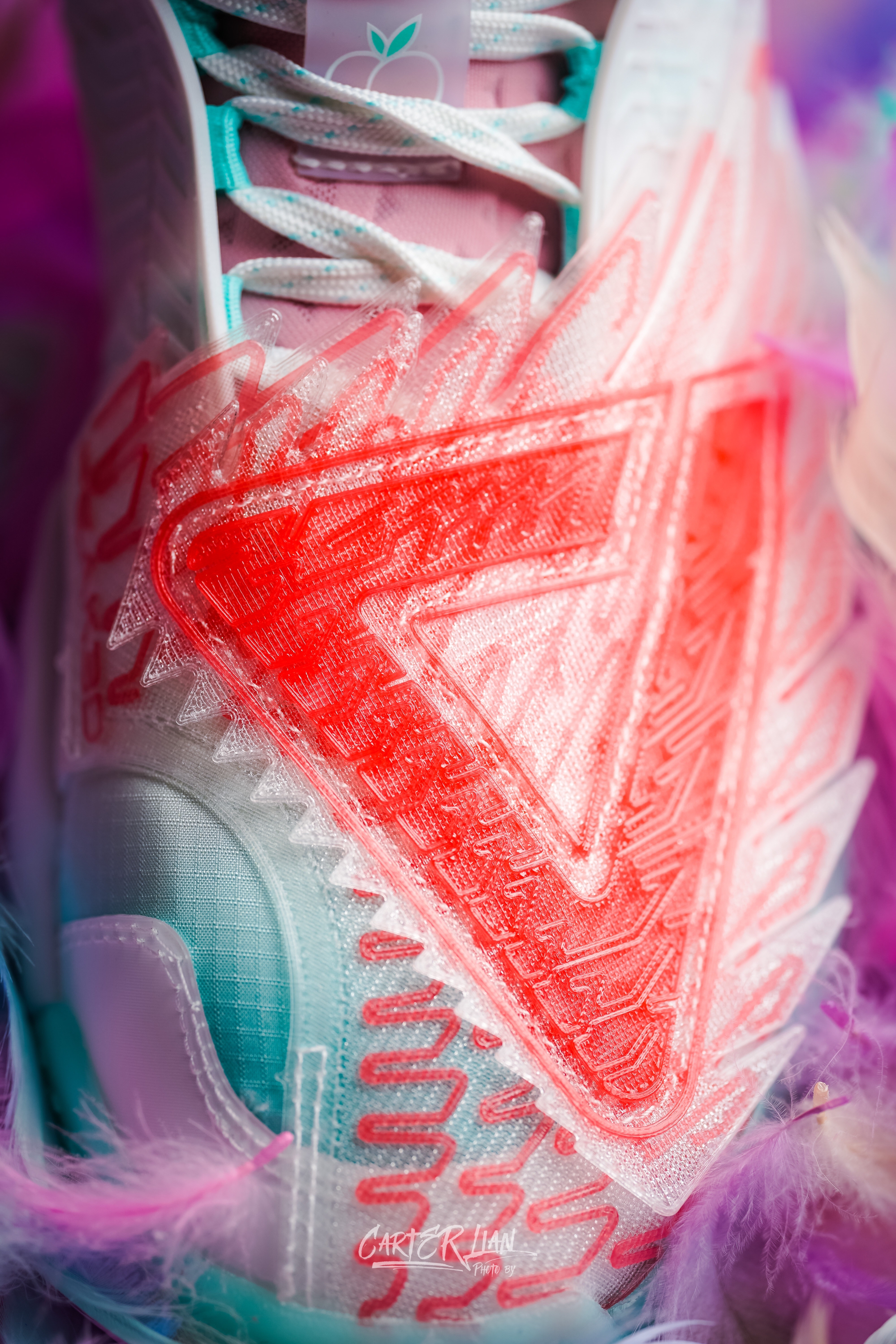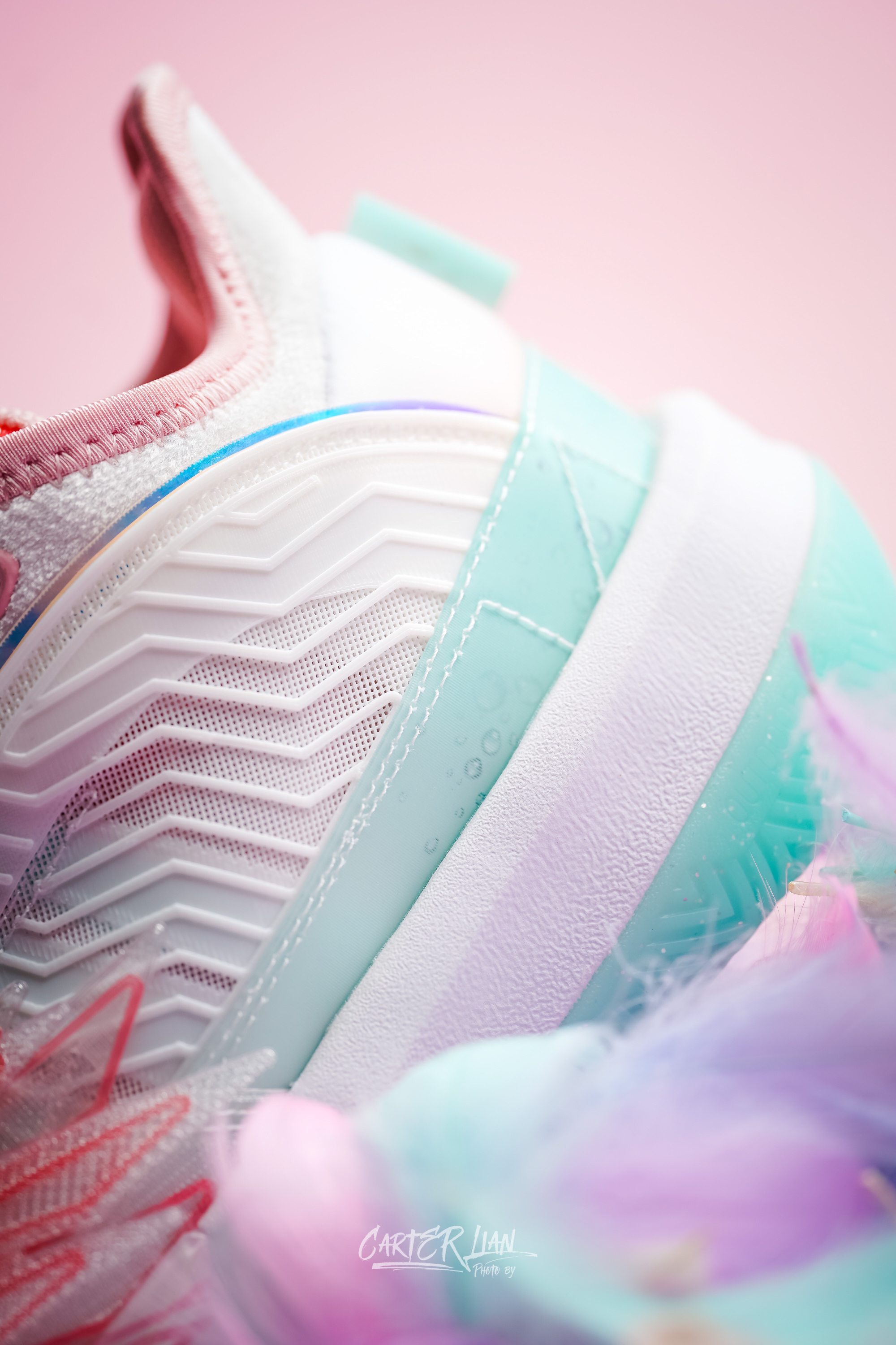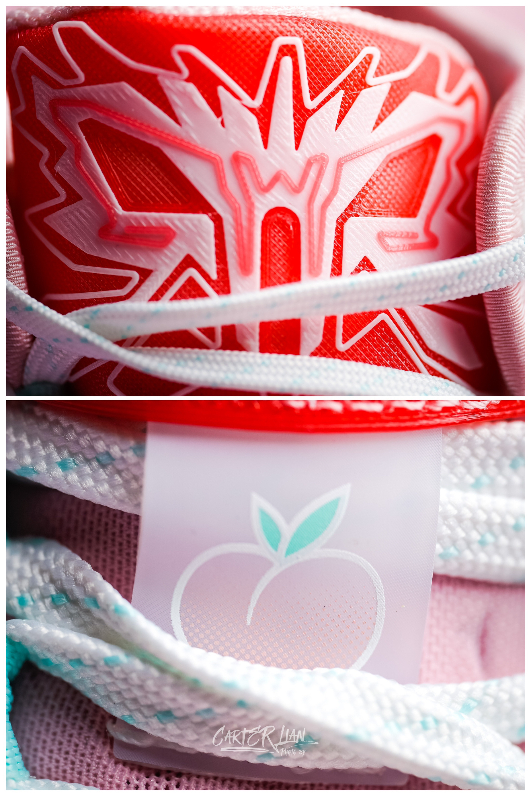 这双是匹克为李月汝准备的个人PE配色,态极大三角是李月汝前往国际赛场首选的篮球战靴,李月汝代表中国力量走向世界,匹克特此为其打造了融合尖端3D打印技术的态极大三角,在配色方面也采用了可以代表她“可盐可甜”性格的水蜜桃粉白色。 整体细节👀:整体以以“夏日水蜜桃”为设计灵感,用透明色的3D材料营造桃子果肉晶莹剔透的质感,冷暖搭配的清爽配色,带着一丝的夏日清凉。鞋舌处和鞋盒上都有桃子🍑的元素,后跟的皮革...