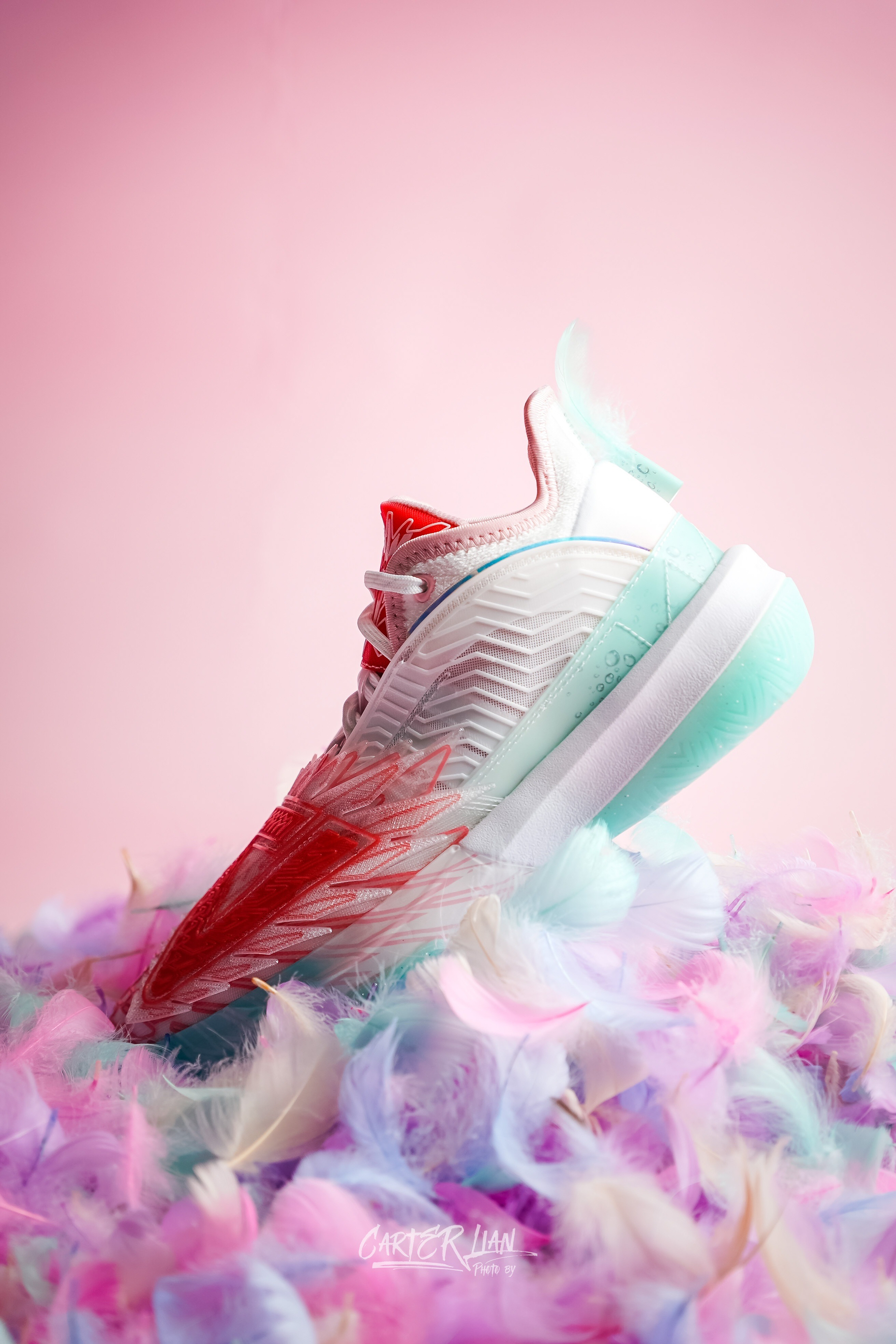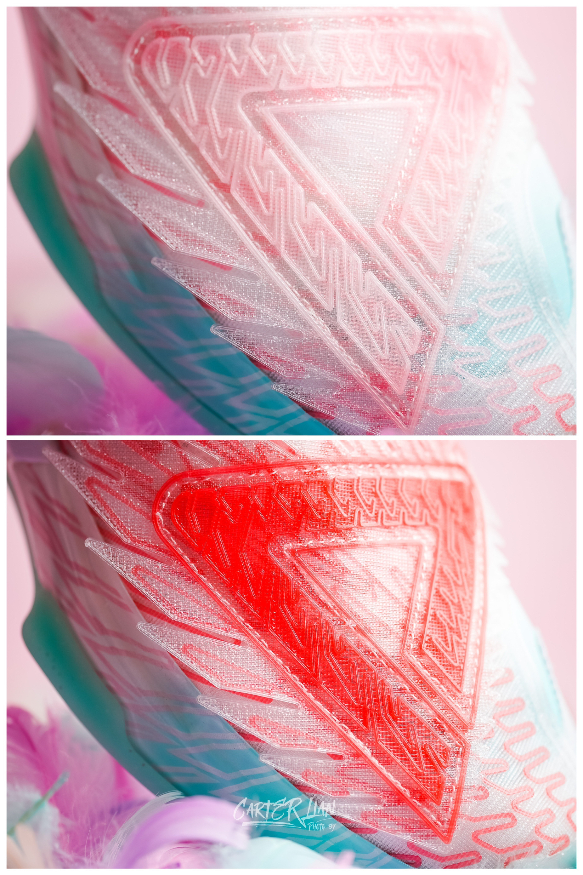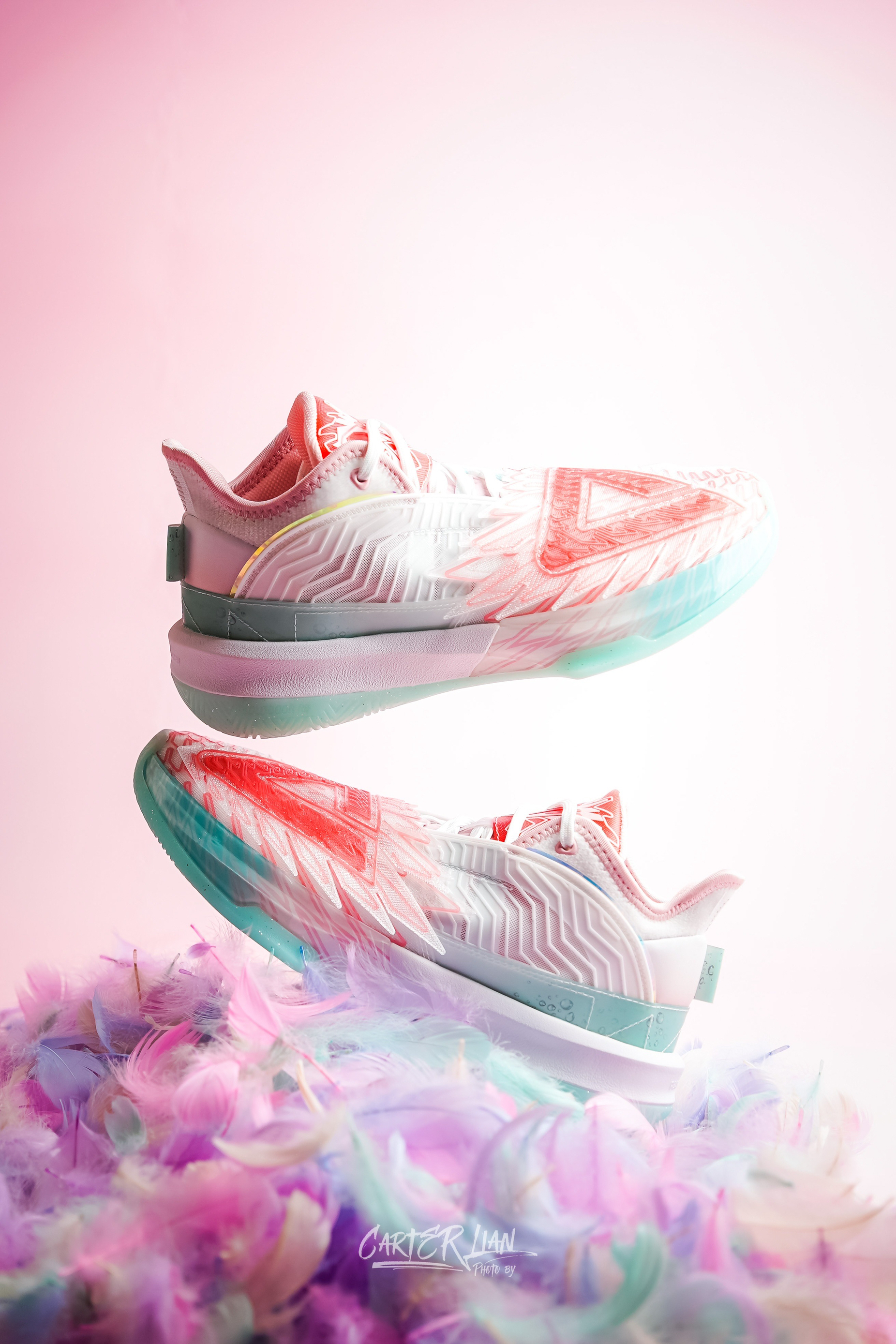 这双是匹克为李月汝准备的个人PE配色,态极大三角是李月汝前往国际赛场首选的篮球战靴,李月汝代表中国力量走向世界,匹克特此为其打造了融合尖端3D打印技术的态极大三角,在配色方面也采用了可以代表她“可盐可甜”性格的水蜜桃粉白色。 整体细节👀:整体以以“夏日水蜜桃”为设计灵感,用透明色的3D材料营造桃子果肉晶莹剔透的质感,冷暖搭配的清爽配色,带着一丝的夏日清凉。鞋舌处和鞋盒上都有桃子🍑的元素,后跟的皮革...