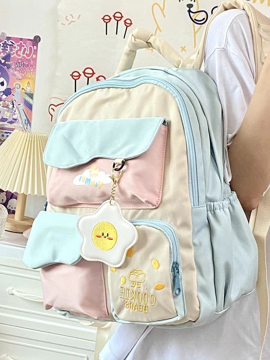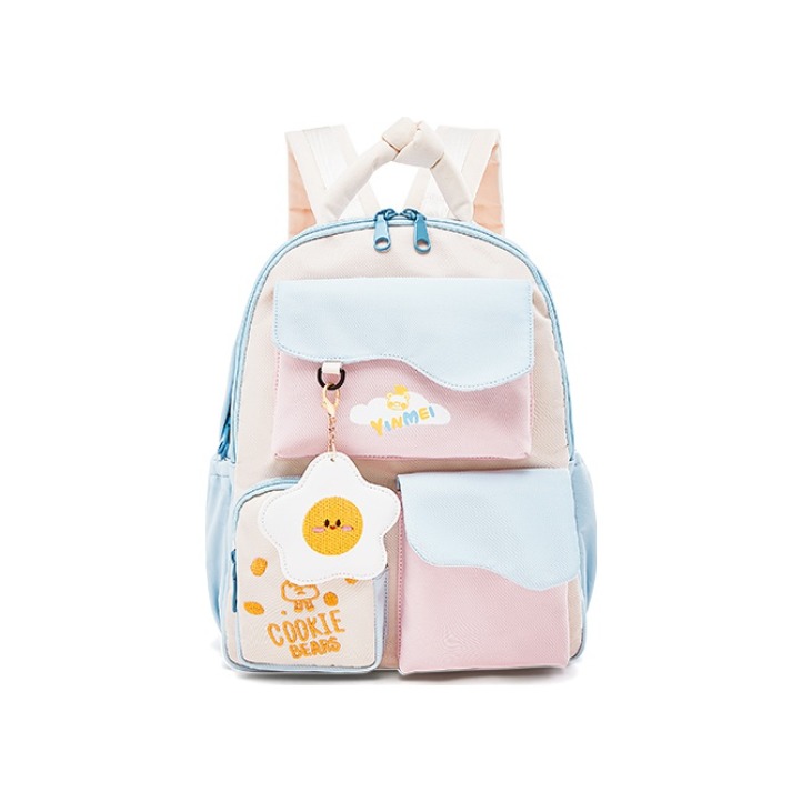 品牌名称:YMEET/音魅 奶fufu的双肩包真的好可爱😍整个包包都采用了马卡龙色系的拼接设计,整体看起来和谐又可爱🥰还有一个花朵形状的荷包蛋吊坠,让整个包包更加可爱了 包包的容量也很大,巨能装!学生党背这个风格完全合适,成年人背就秒变甜妹🥳质感超棒,面料很厚实,摸起来贼舒服✔️