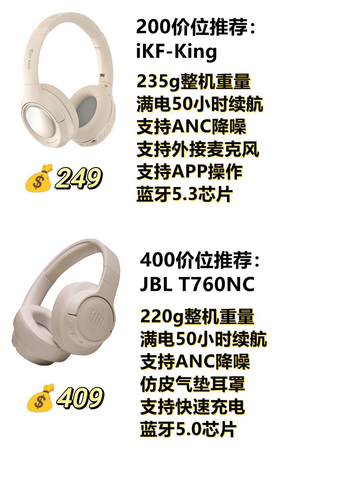 上段时间给大家分享了入耳式和半入耳式的蓝牙耳机,今天就给大家分享一下各价位段的头戴式蓝牙耳机~ - 💰200档 iKF King,支持ANC主动降噪和ENC通话降噪,蛋白皮加记忆海绵,配戴感很舒适,支持最新的蓝牙5.3协议,连接非常稳定,可以外置无线插麦,耳机可以通过手机APP操作使用,整体性价比比较高,适合学生党的朋友~ - 💰400档 JBL T760NC,支持Anc主动降噪和通话降噪,耳机采...