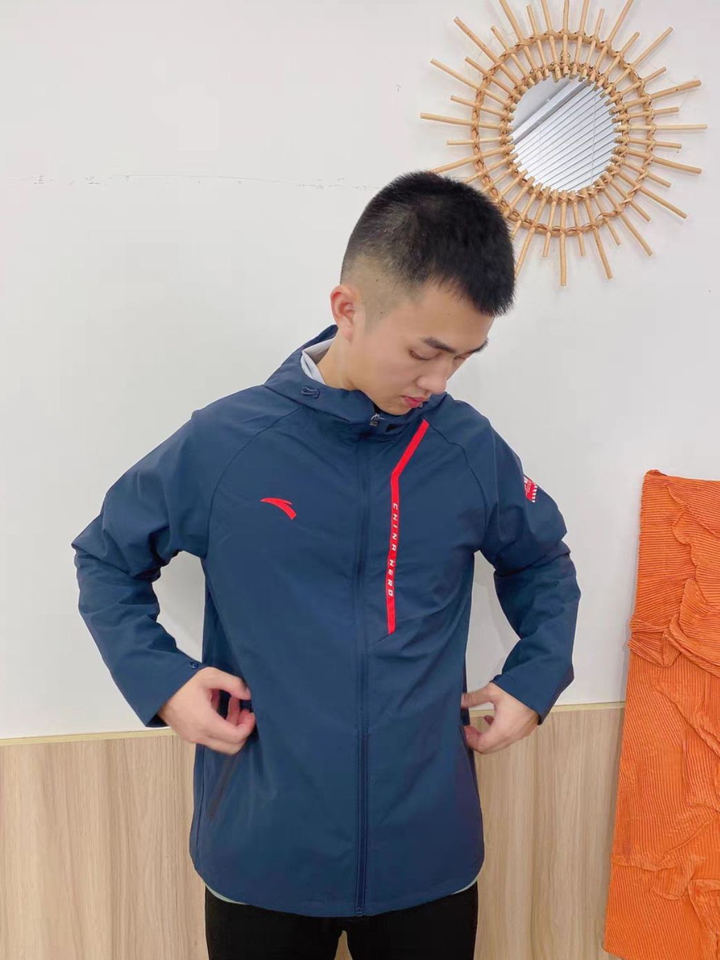 👾穿搭公式:Anta连帽外套冲锋衣+黑色卫裤+中筒袜+运动鞋 这款是运动风格的搭配,男生穿着运动跑步🏃很可以哦! ✨适合人群:男生女生都可以hold的一款, 深蓝色也很百搭,上面几何条纹的设计很特别,正面安踏logo简约🤟 图源网络侵删