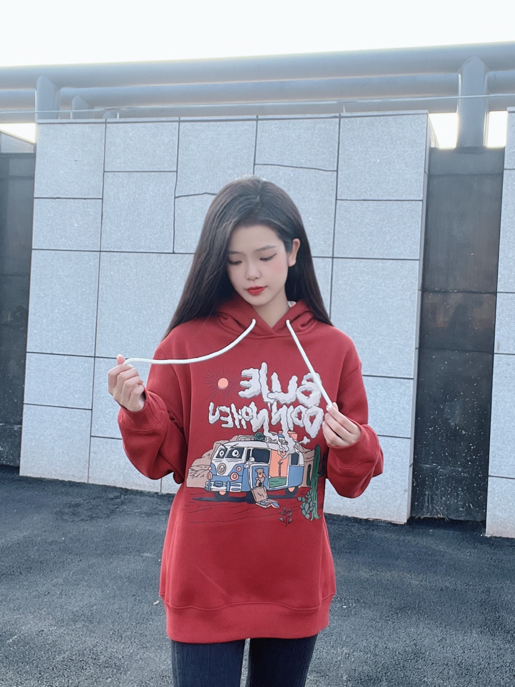 女神穿搭来喽!这一款红色卫衣的颜色还是比较温柔的,这款卫衣的红色得饱和度不是那么高,所以会很显气质 这一款红色卫衣,其实也是很百搭的款式,可以像这个小姐姐一样搭配一条微喇牛仔裤 最重要的是这一款卫衣的印花图案特别可爱,非常得巨有设计感哦 (图源来自网络)