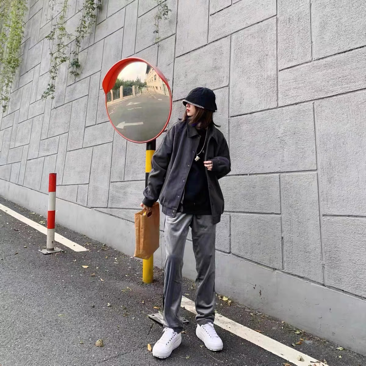 BLINGMYTHING也是一家非常不错的品牌,它家的衣服质量什么的都非常帮,这一款是他家的麂皮绒logo印花翻领夹克外套 这一款衣服的质感真的是非常不错,版型也很好看,穿上身的效果也很棒 图中的小姐姐搭配了一件比较简单的休闲长裤,但是也有一种很酷的感觉 (图源来自网络)