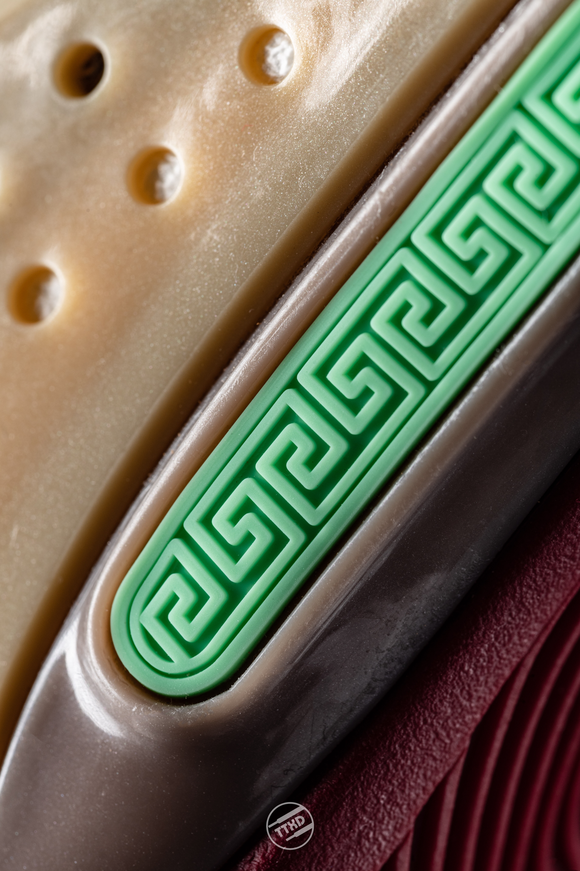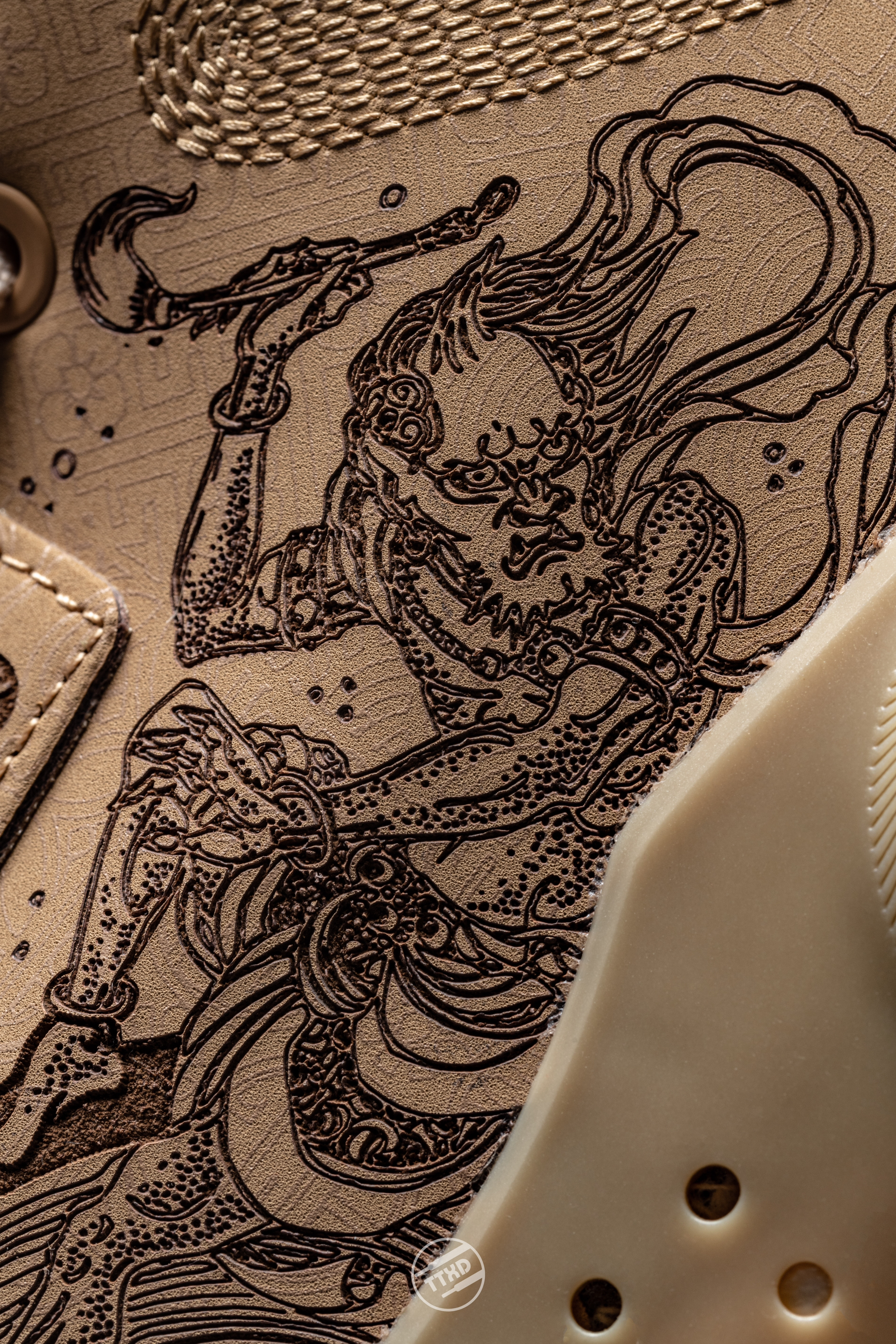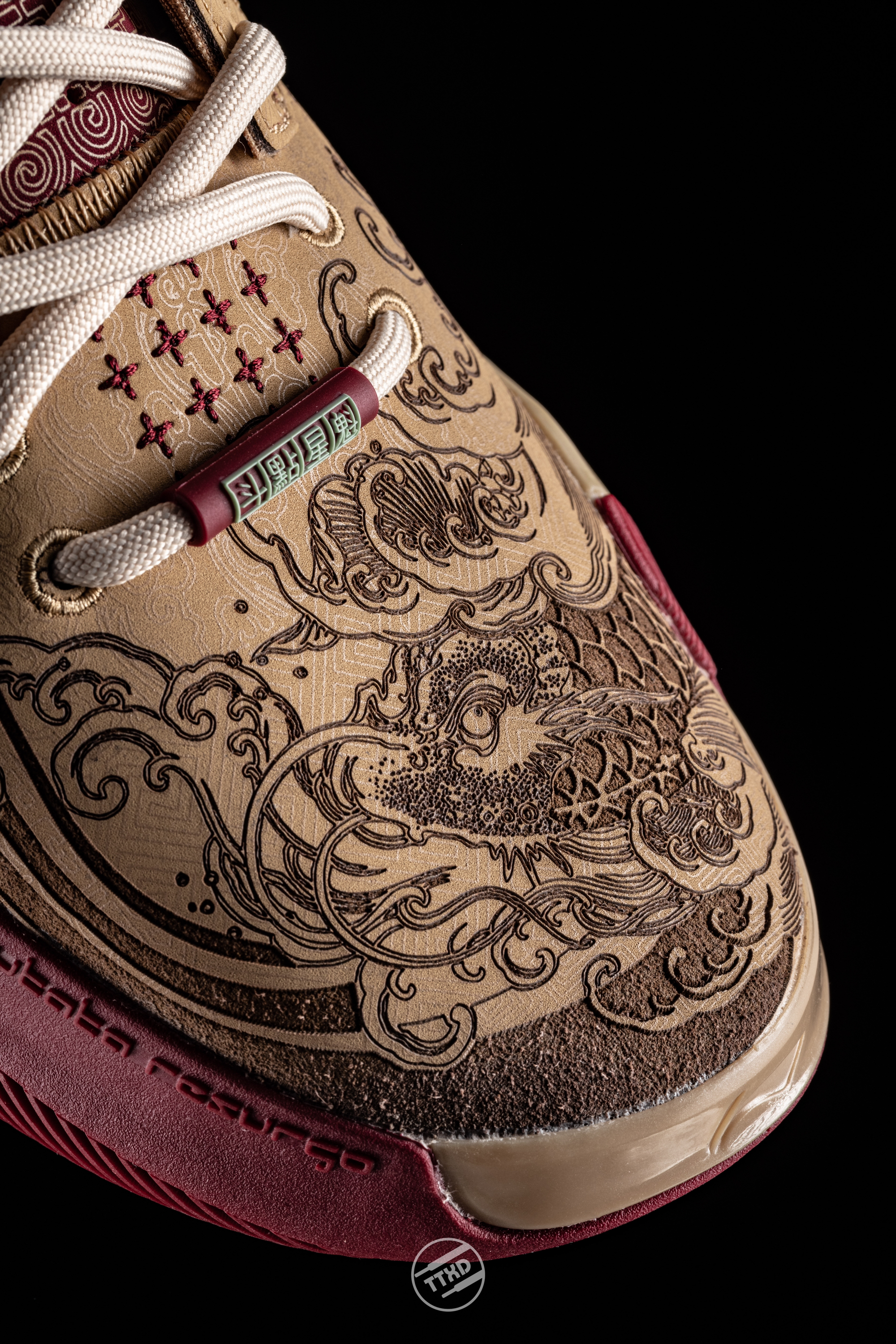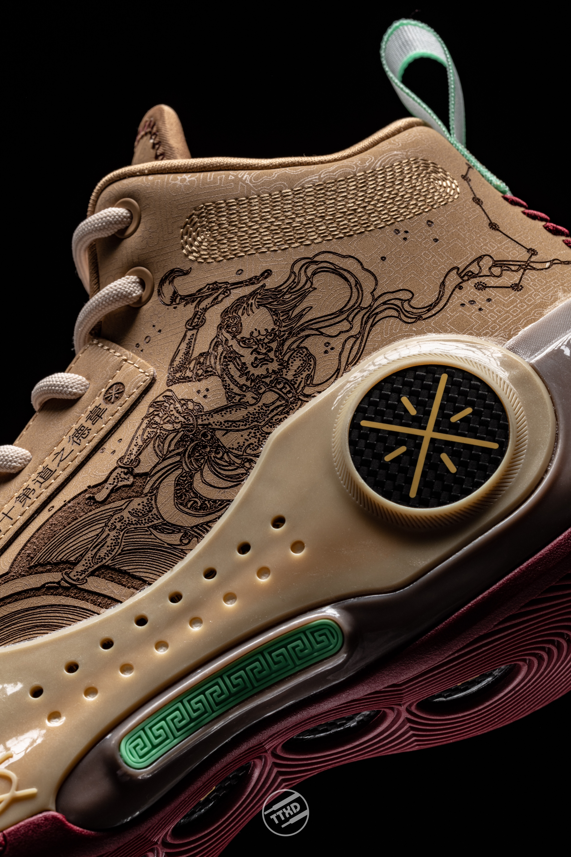 Wow10截至目前最炸裂的配色。纯皮鞋面+电雕工艺,刻画出“魁星点斗”的图案。魁星挥舞朱笔,文思泉涌妙笔生花。 鞋舌的刺绣韦德个人Logo十分精美,中底侧面的TPU改为祥纹图案,十分中国。 左右脚鞋橡胶带扣分别有"魁星点斗""独占鳌头"字样,点名鞋款配色的主题。 此款配色由抓哥&花青tattoo 联袂呈现