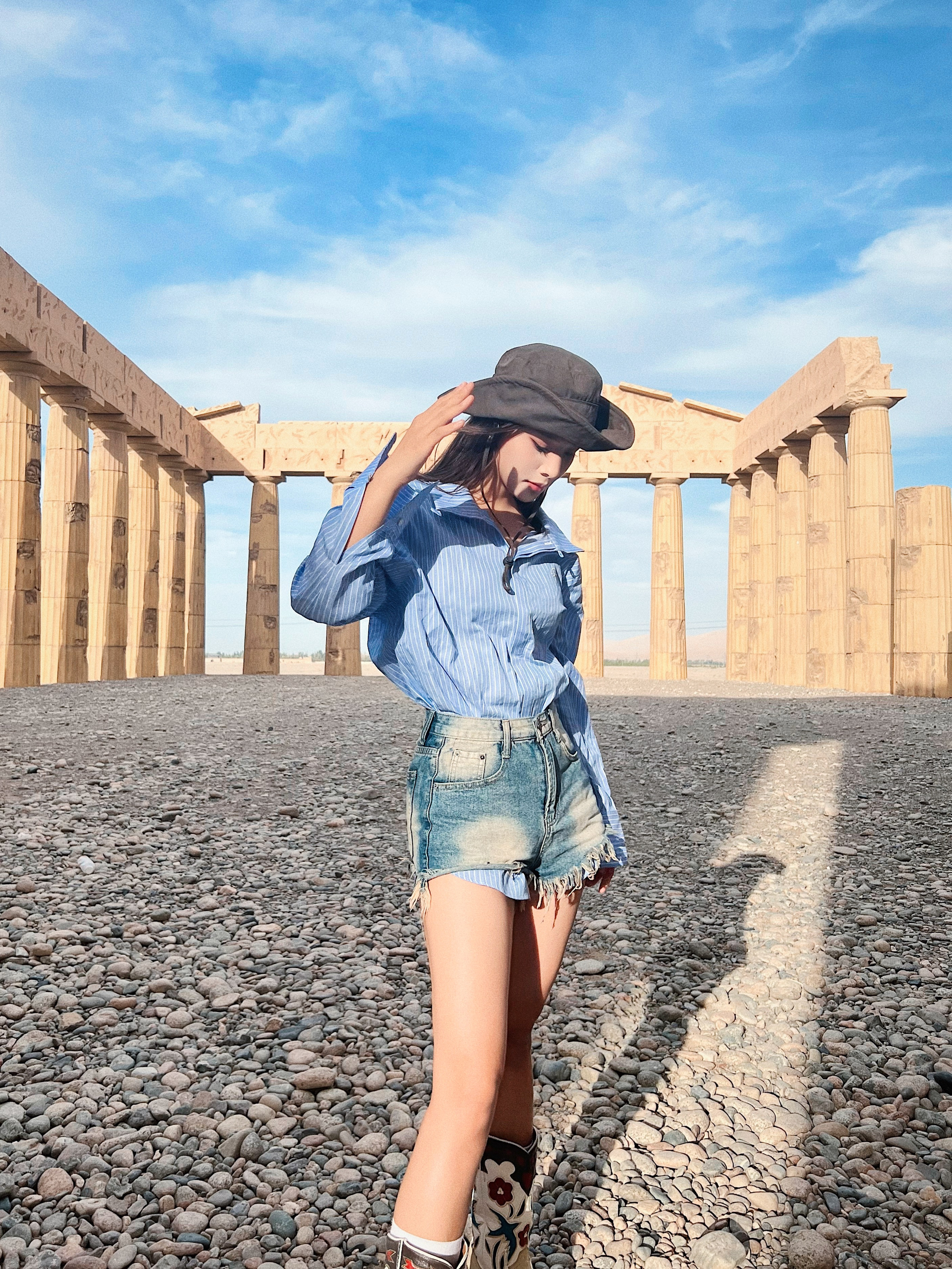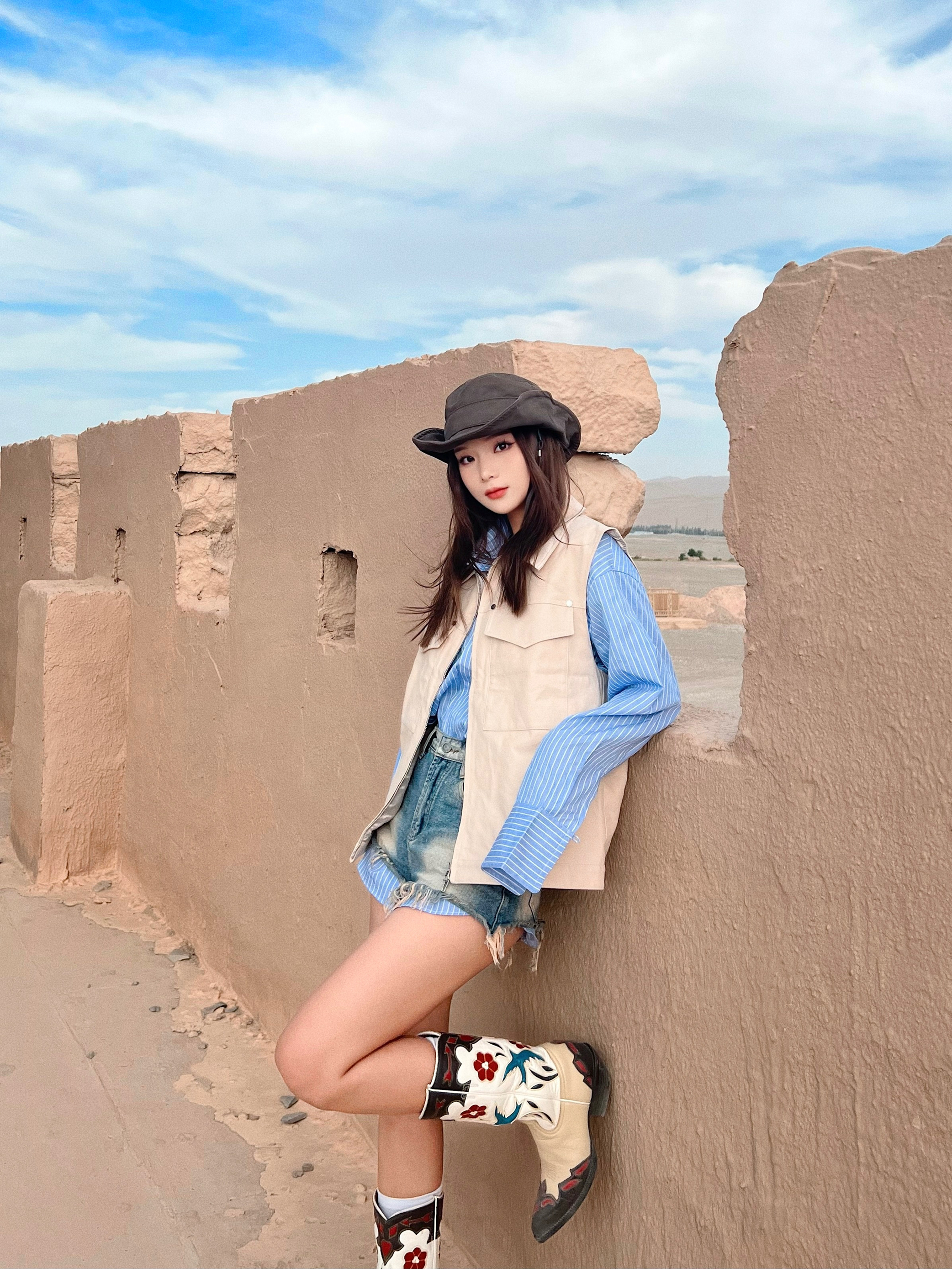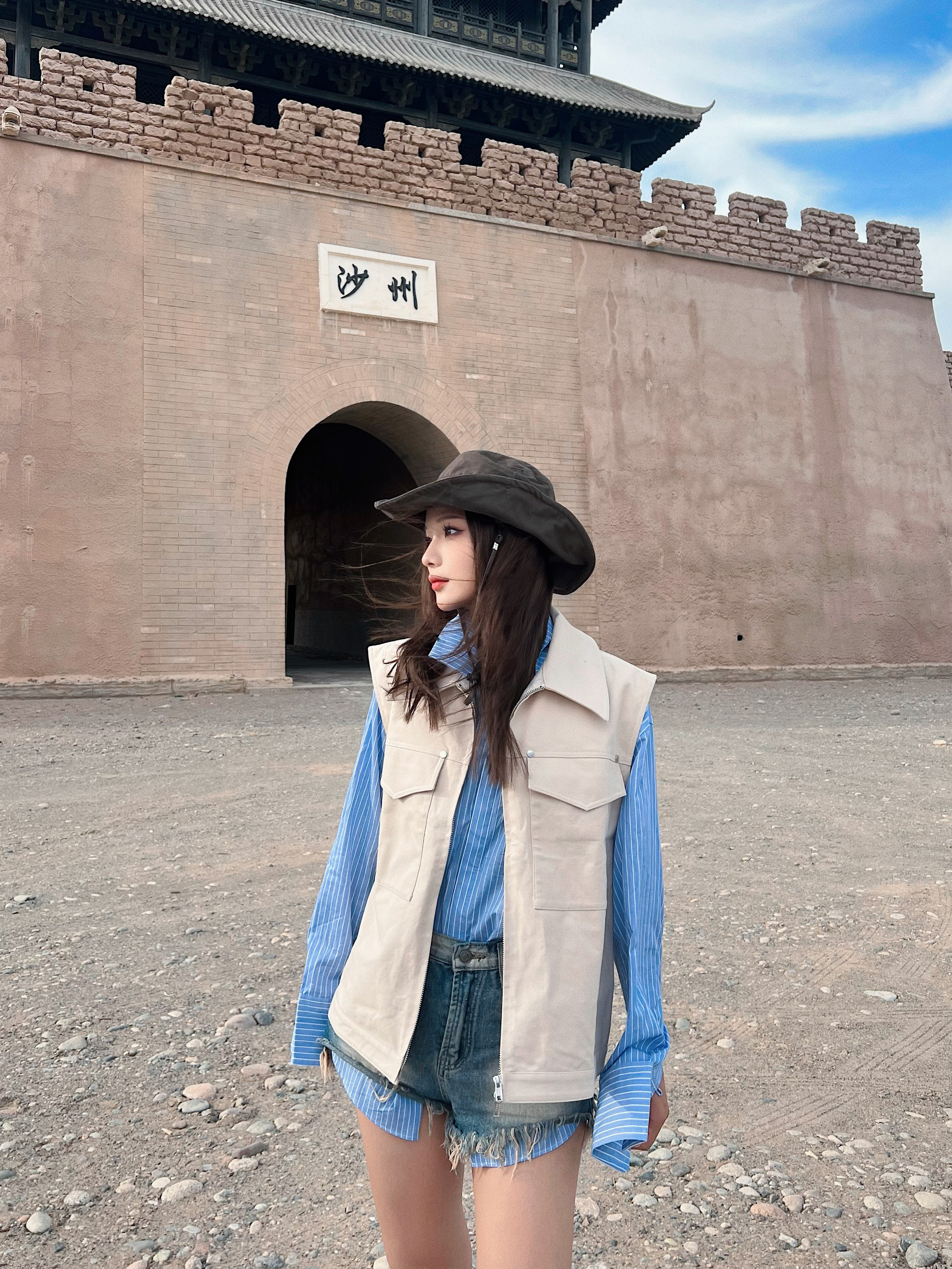 显瘦显腿长还得是热辣超短裤🔥 - 💡穿搭灵感: 🏜️沙漠穿搭少不了牛仔和西部靴 超热短裤➕复古靴yyds!显腿长又显瘦✌🏻 蓝条纹衬衫➕卡其色马甲 沙漠配色拿捏 还可以增加层次感 🥷🏻宽沿帽去沙漠必备啊啊啊啊!太显脸咯~ - 👔:OPICLOTH 👕:OPICLOTH 👢:Vintage