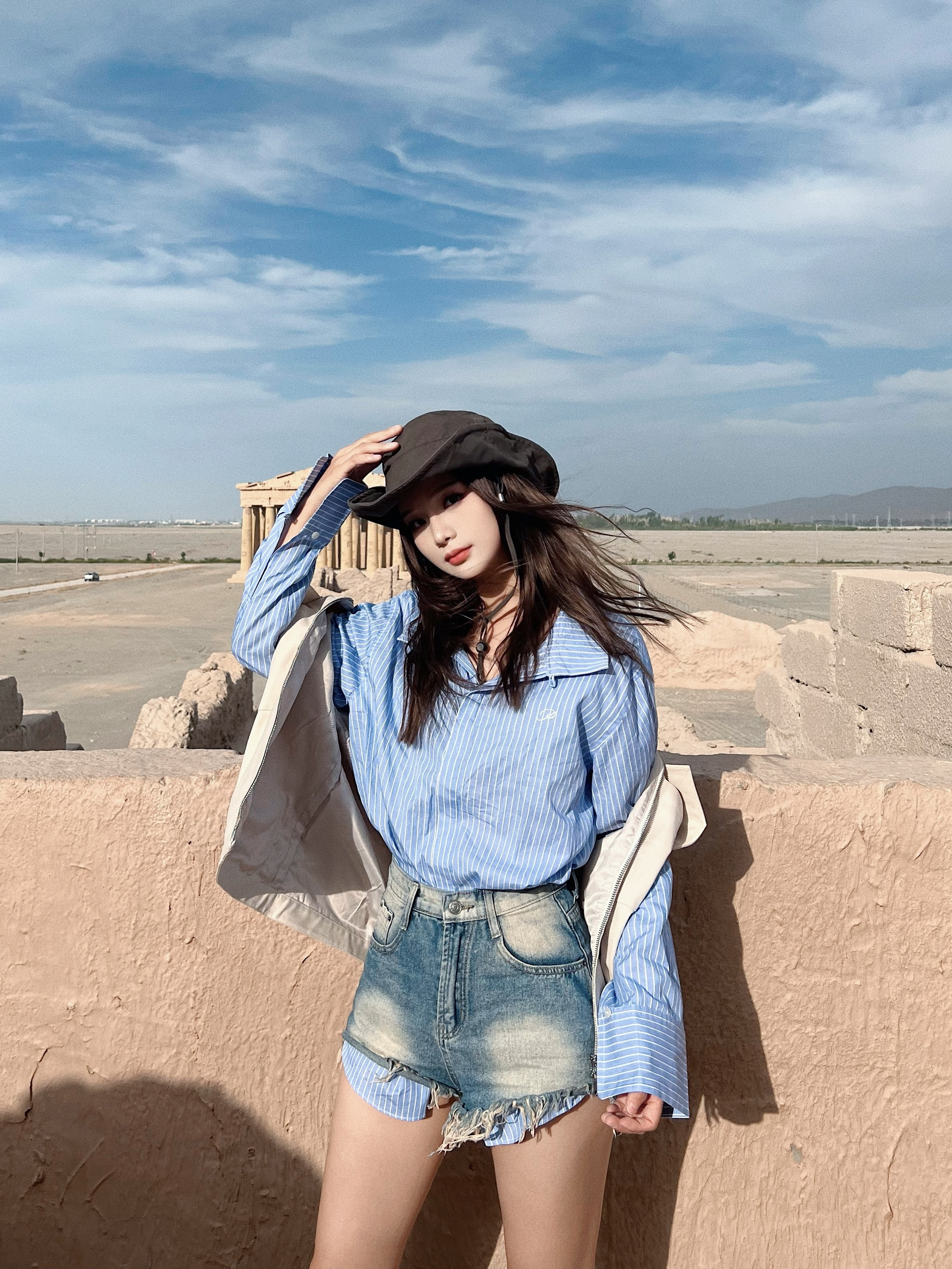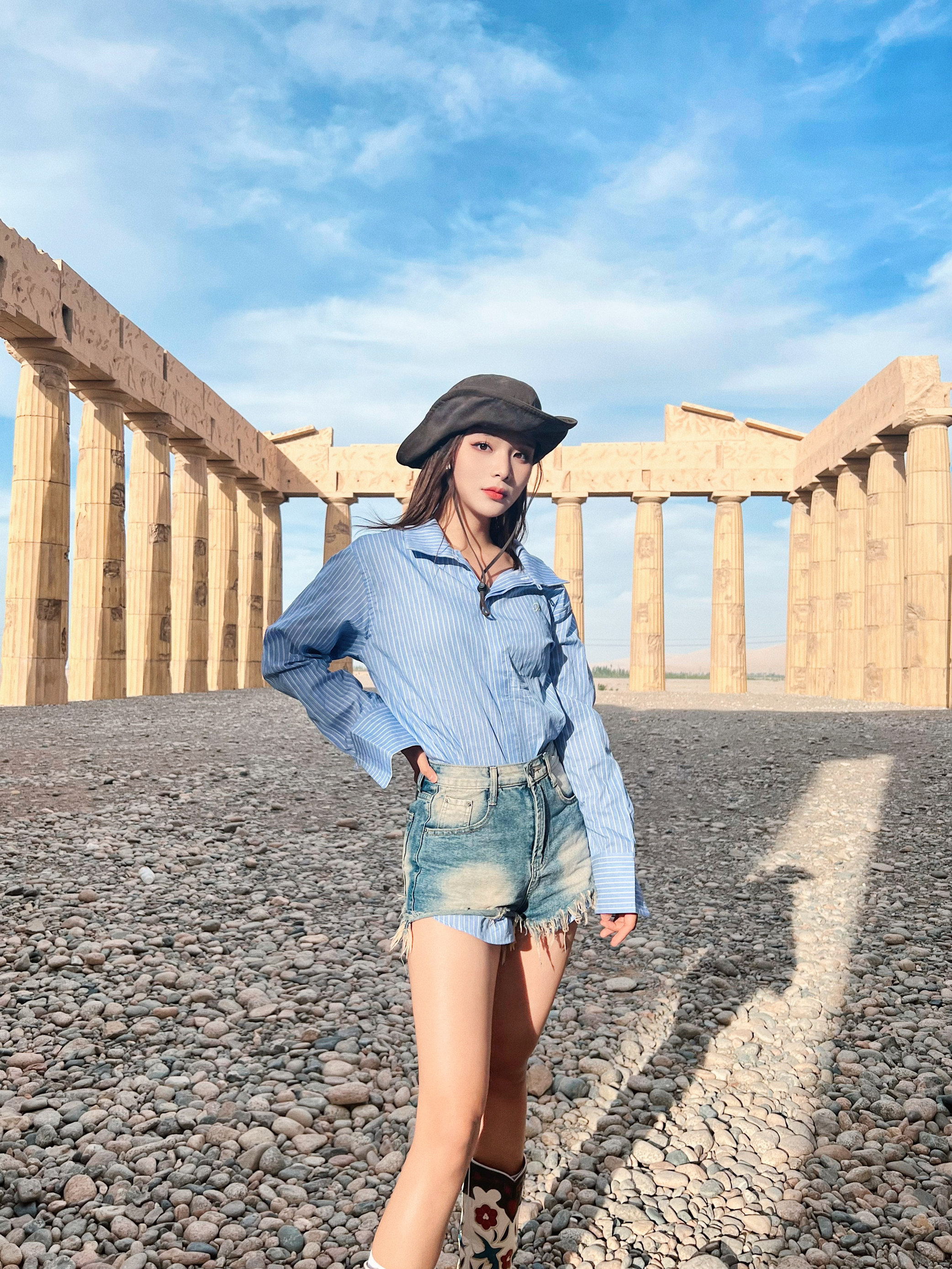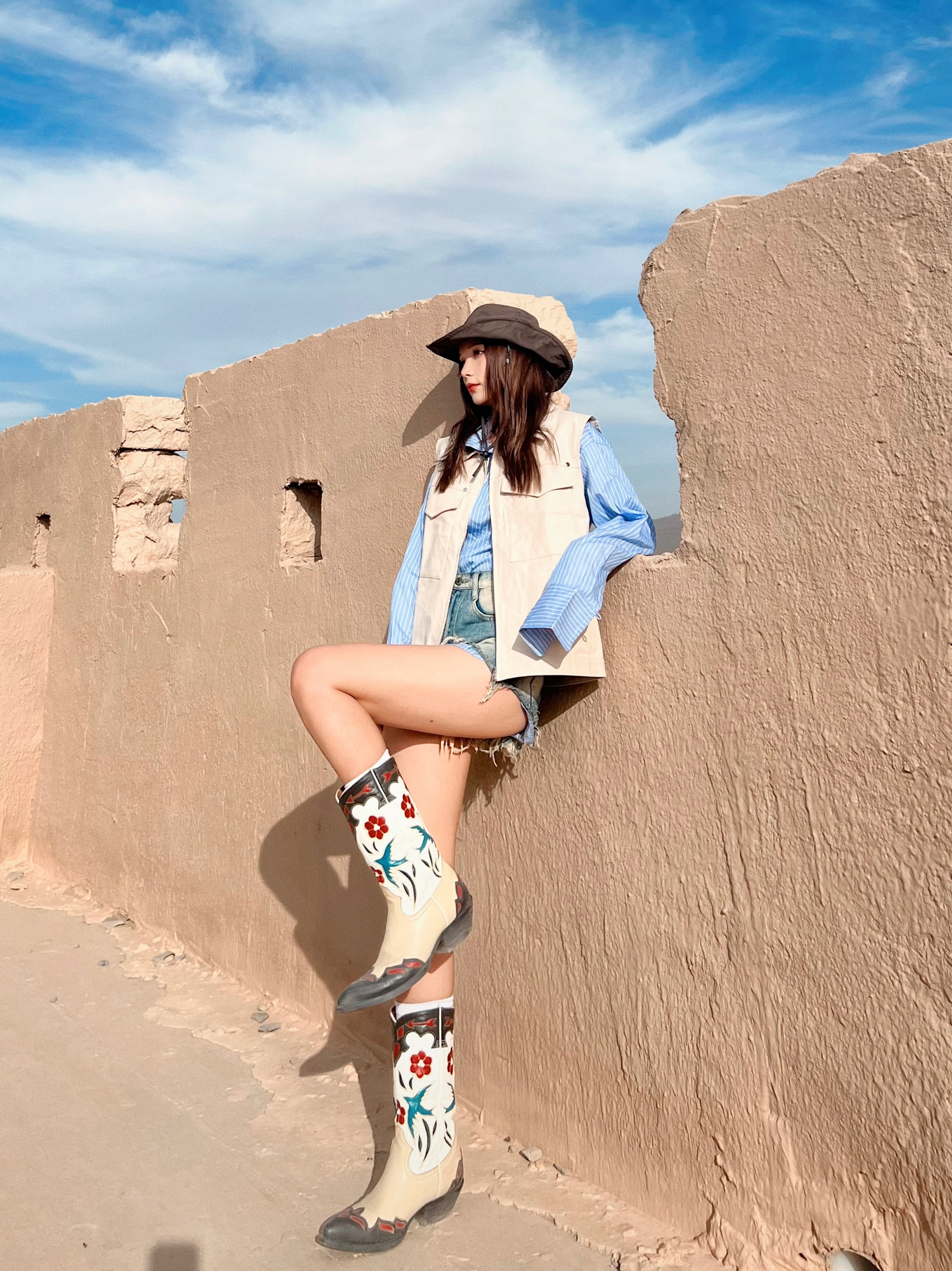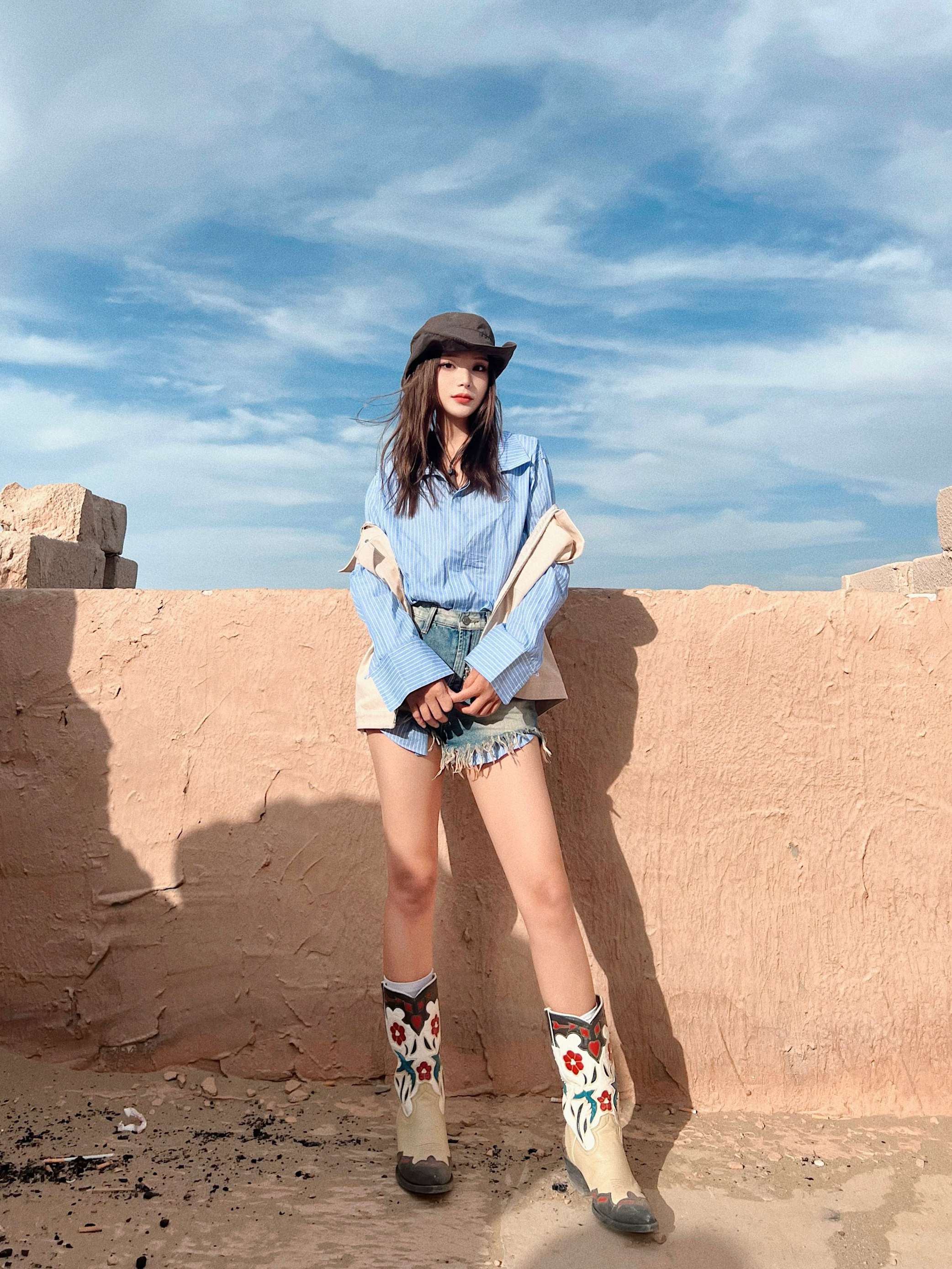 显瘦显腿长还得是热辣超短裤🔥 - 💡穿搭灵感: 🏜️沙漠穿搭少不了牛仔和西部靴 超热短裤➕复古靴yyds!显腿长又显瘦✌🏻 蓝条纹衬衫➕卡其色马甲 沙漠配色拿捏 还可以增加层次感 🥷🏻宽沿帽去沙漠必备啊啊啊啊!太显脸咯~ - 👔:OPICLOTH 👕:OPICLOTH 👢:Vintage