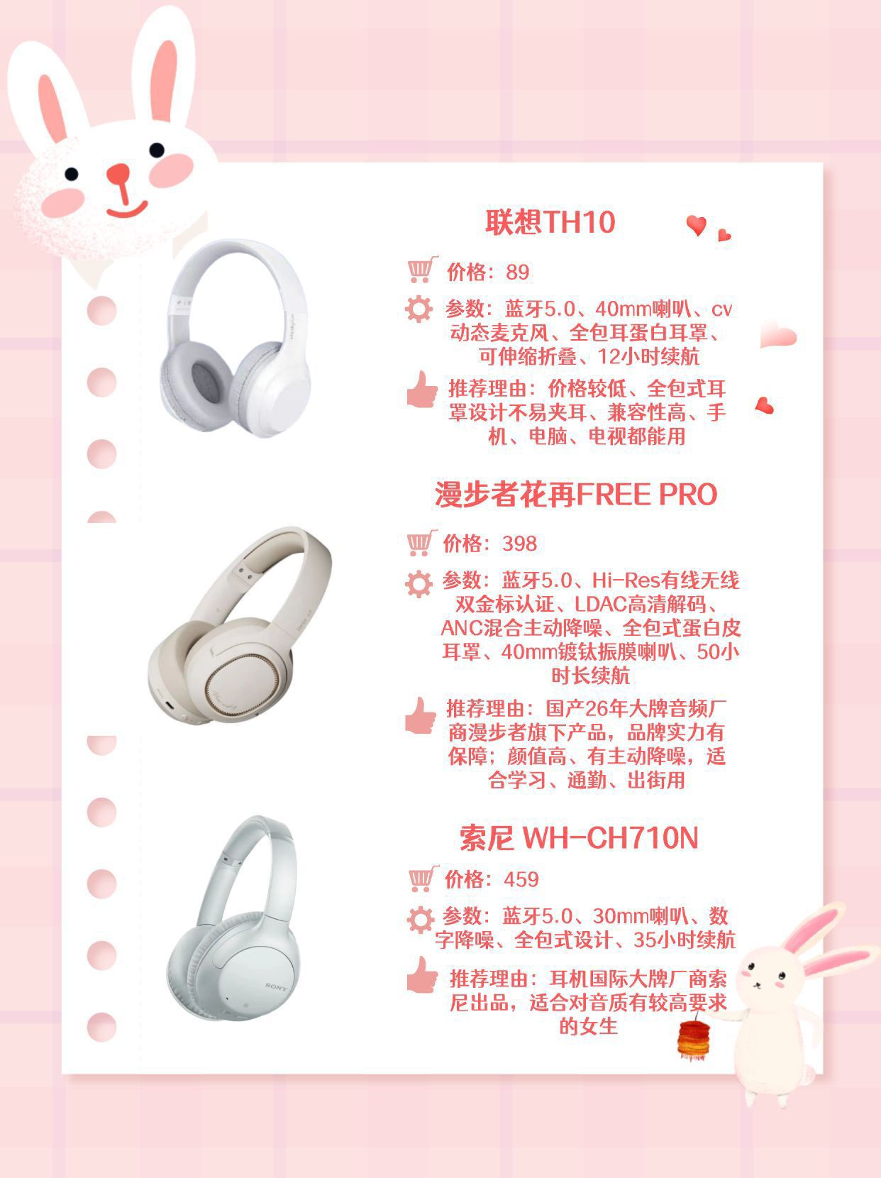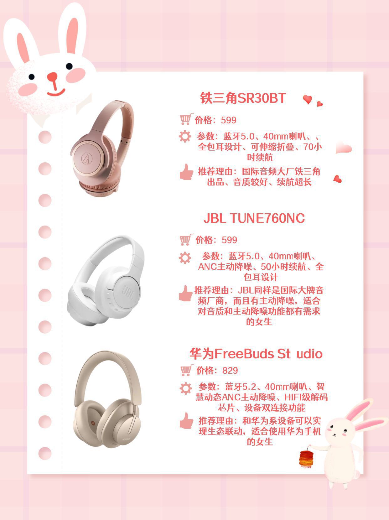 头戴式耳机以其佩戴的舒适性和不错的音质一直以来受到许多人的喜爱 同时,作为出街必备的颜值担当,一款高颜值的头戴式耳机也是每位女生出门时不可缺少的百搭神器 那么今天,仙女就来给大家带来一期适合女生的仙女风高颜值头戴式耳机的合集,覆盖了0-1000价位段,小仙女们可以根据自身需求进行挑选哦~ 在选购头戴式耳机时,主要需要考虑以下几个方面的问题: 1⃣️明确预算:头戴式耳机基本可以以500元作...