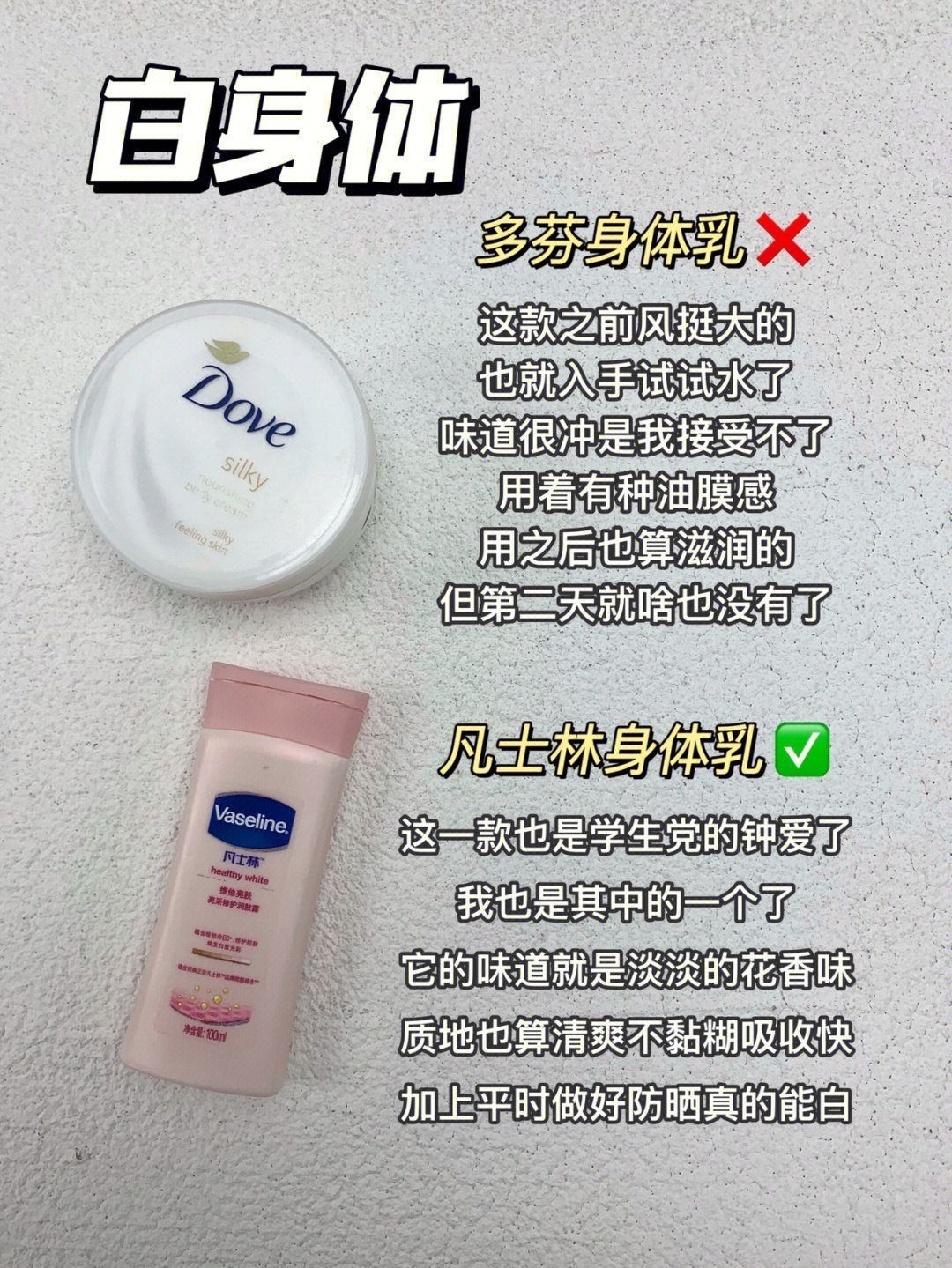 本篇笔记关联了ANESSA/安热沙 小金瓶高倍防晒霜 成膜快不闷不油 干皮版SPF50+/PA++++、Vaseline/凡士林 烟酰胺焕亮修护美白身体乳 清爽保湿提亮持久留香 【针对暗哑干燥肌】焕亮保湿等商品,为用户提供真实的使用体验和购买参考。