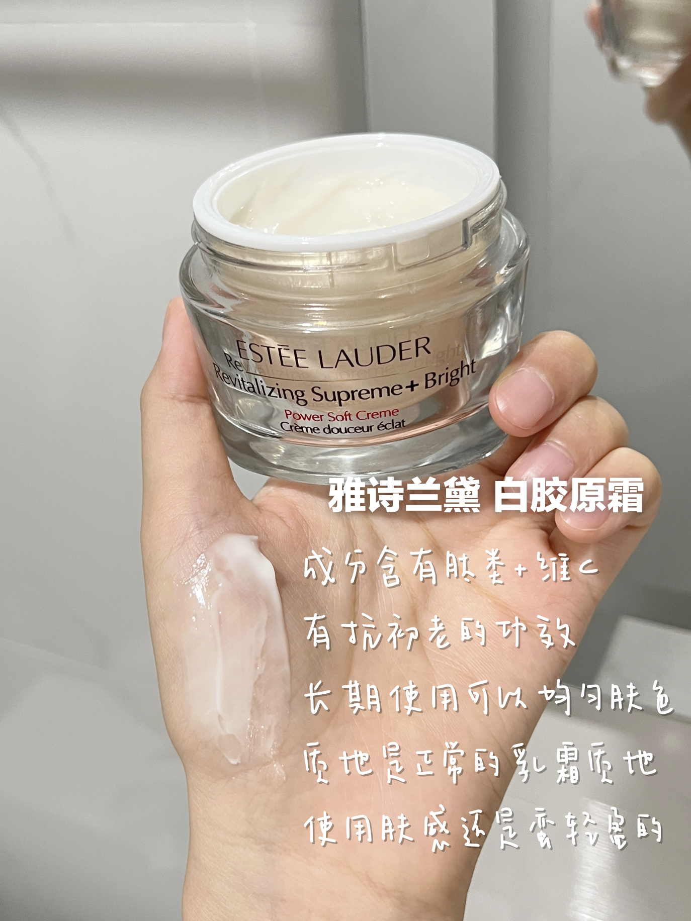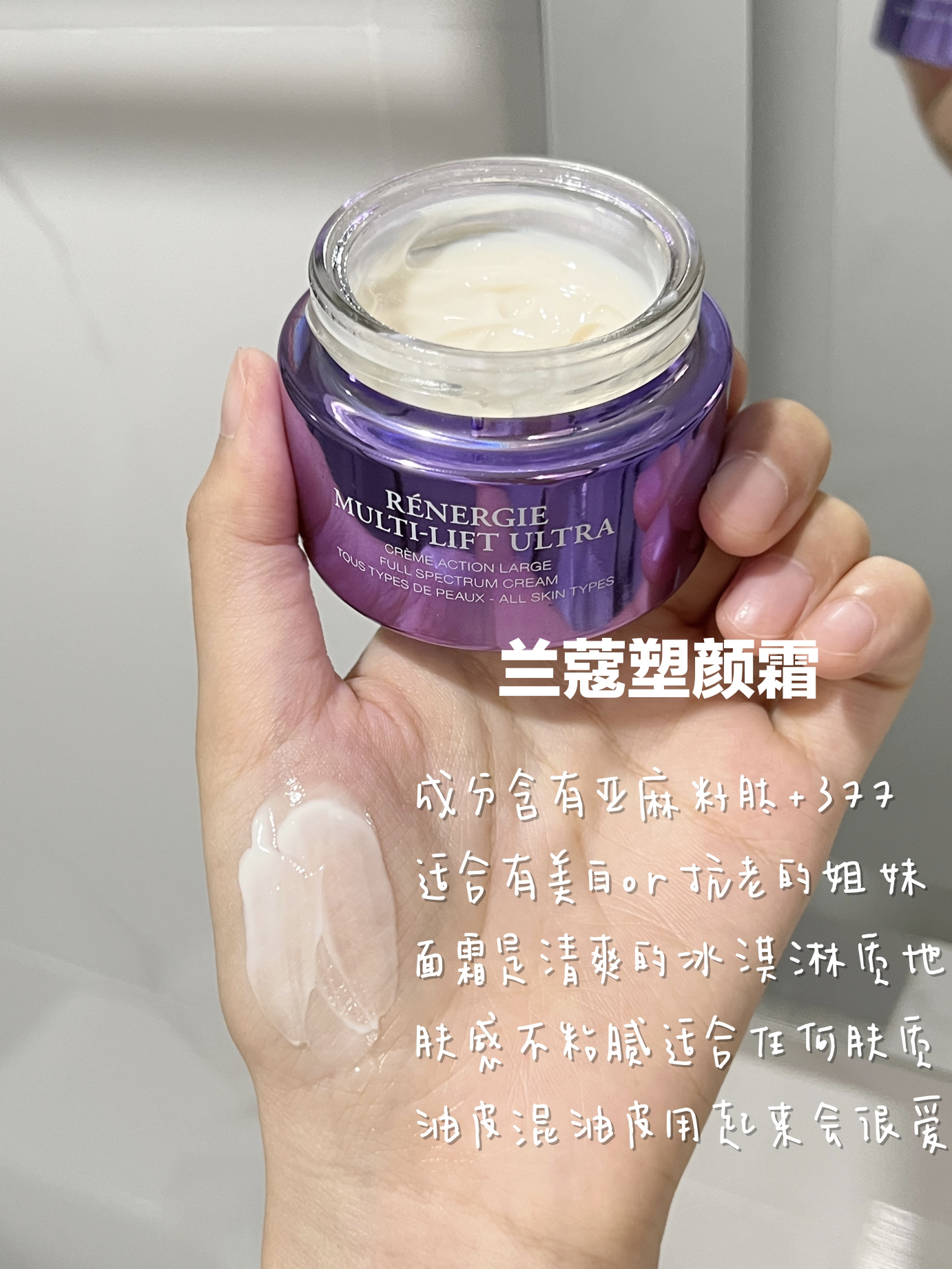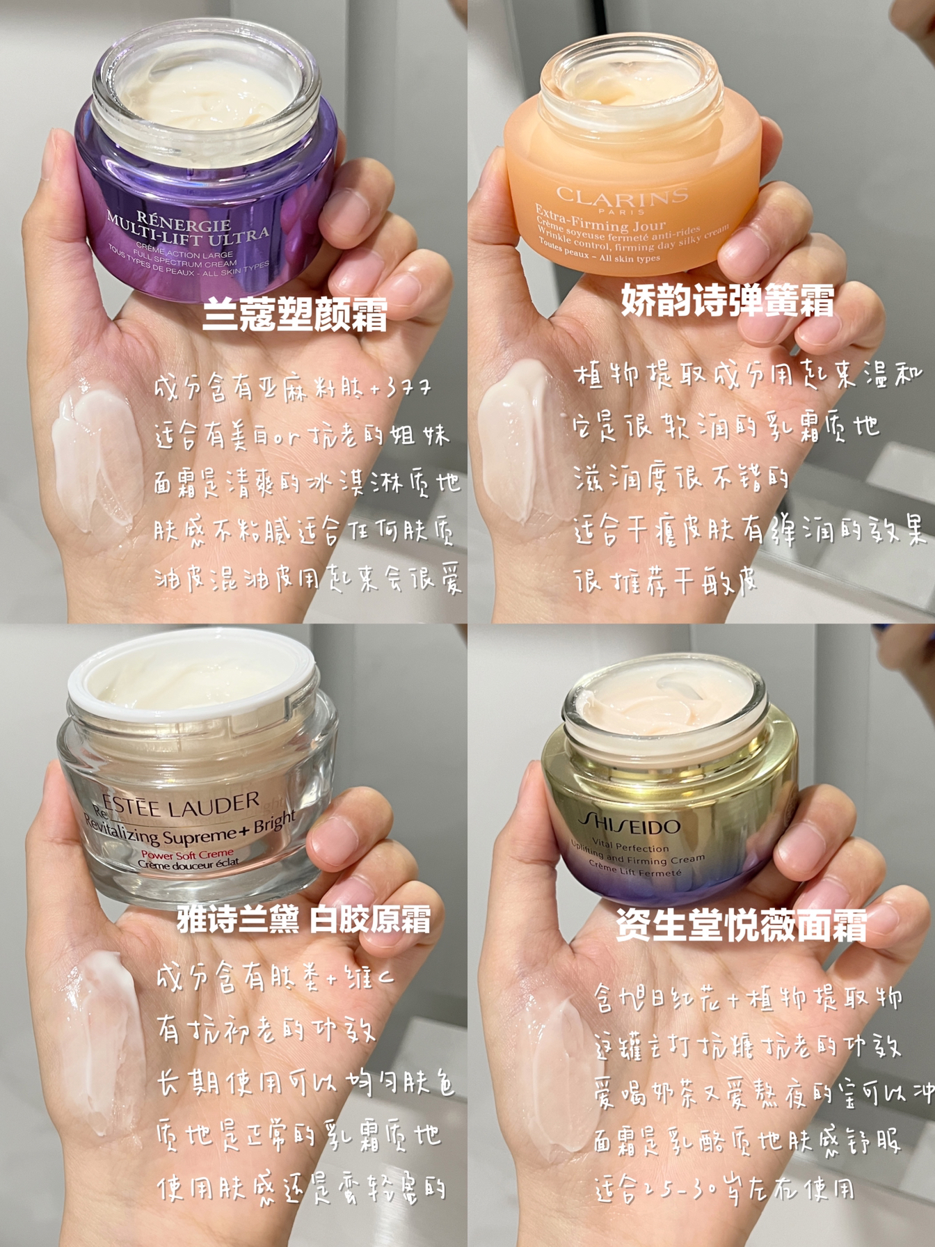 🌟兰蔻塑颜霜 这款面霜是清爽的冰淇淋质地 成分:含有亚麻籽肽+377 它上脸忒舒服了!润润弹弹的一抹就吸收了 咱就是说不粘腻的肤感谁不爱呀 我是618大促入手的 价格很nice~ 也是从6月份一直用到现在了 美白和抗老这方面是真不错 熬夜之后第二天气色也能依旧完全不垮脸!真的栓Q!! 换季用它刚刚好 大牌面霜里性价比是真的很高了 谢谢你拯救垮脸塑颜霜! 🌟雅诗兰黛白胶原霜 白胶原...