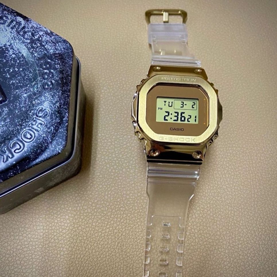 🕐手表名称:【白敬亭同款】Casio/卡西欧 G-SHOCK 制胜金石英手表 GM-5600SG 💥外观设计:透明的表带加上金色的手表,外壳真的是超级不一样的搭配,好看又经典,很让人眼前一亮,手表的外观感觉有两种颜色的结合 💰推荐价格:820 🎉日常搭配:休闲搭配 商务搭配 图片来自网络侵删