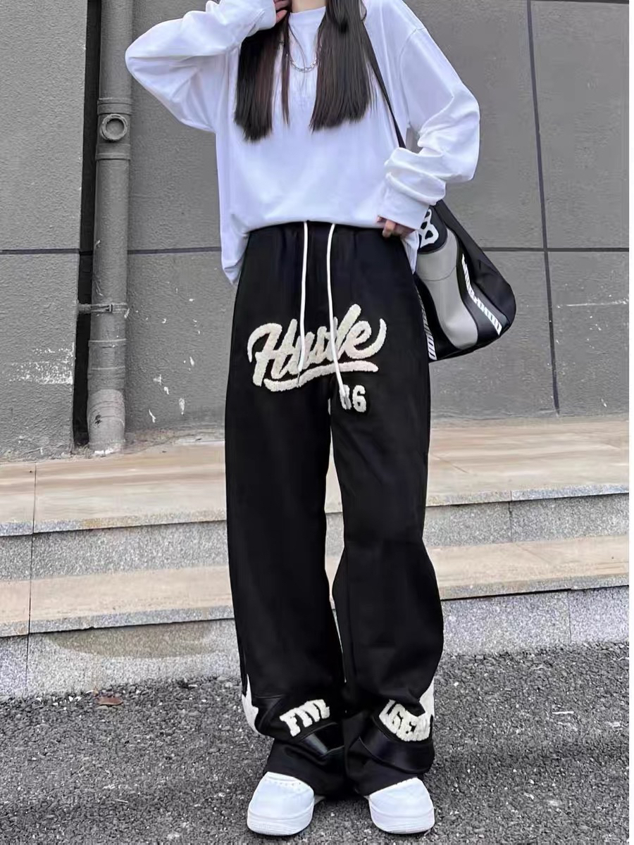 这种经典黑色的款式和设计真的永远不会过时,黑色的宽松款长裤上一些好看的 印花设计,就不会那么单调了 可以像图中小姐姐一样搭配一件简单的白色短上衣,有种简约优酷的感觉 而且这款休闲风的设计很适合喜欢运动的小哥哥、小姐姐和学生党们哦 (图源来自网络)