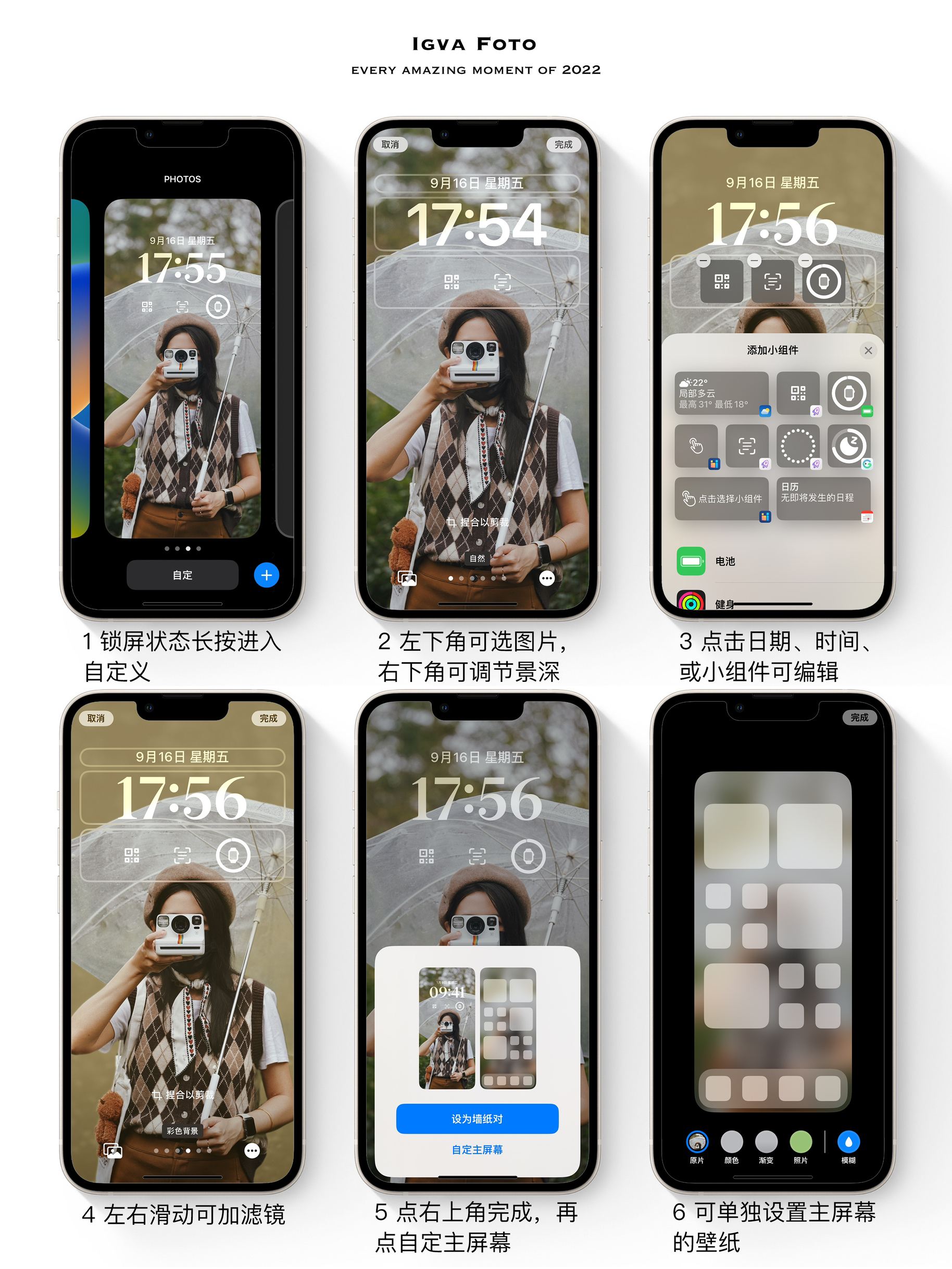前几天升级了iOS16的系统,目前还在适应中,不过功能上属实真香。那关于它的分享,就从锁屏壁纸与小组件开始吧。 📱锁屏壁纸与小组件的添加方法(图2): ➊ 在锁屏状态下长按屏幕,会进入自定义界面 ➋ 左下角可选图片作为壁纸,右下角可调节景深 ➌ 点日期、时间、或小组件,可分别编辑、更改颜色或添加内容 ➍ 自定义界面下左右滑动,可为壁纸添加滤镜 ➎ 点右上角的【完成】,会出现【设为墙纸对】和【自定...
