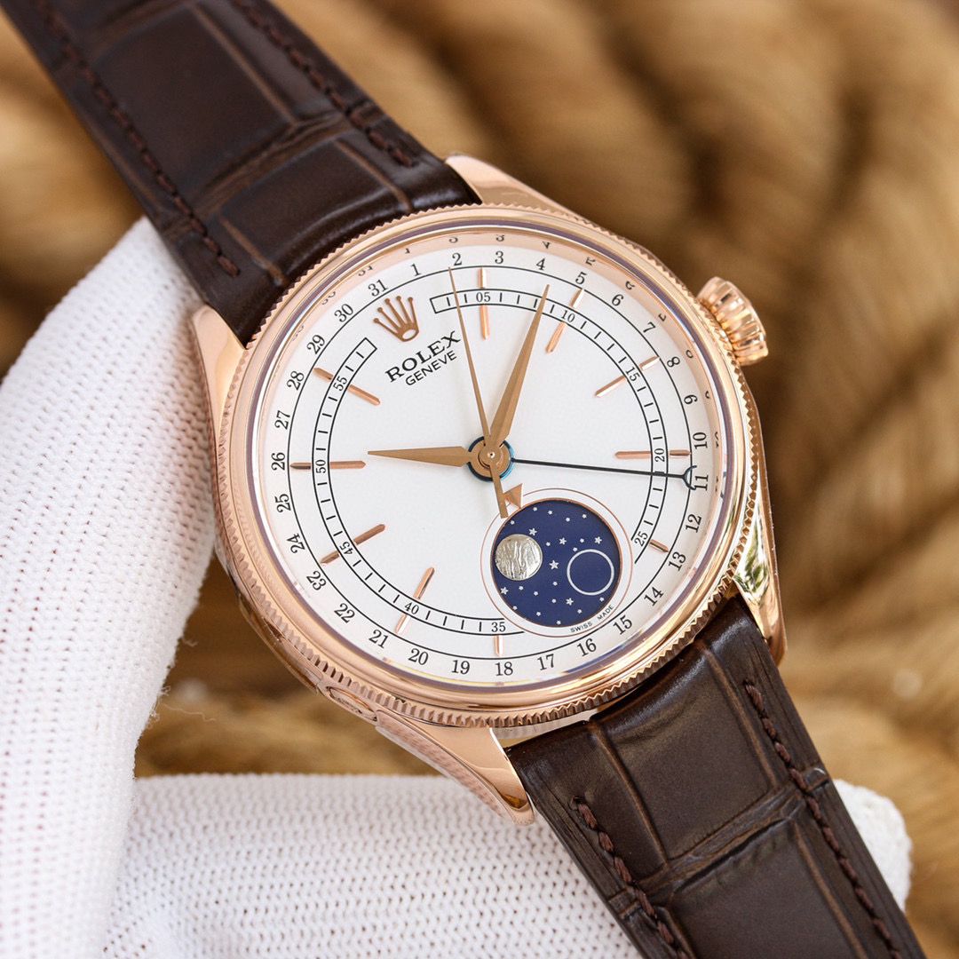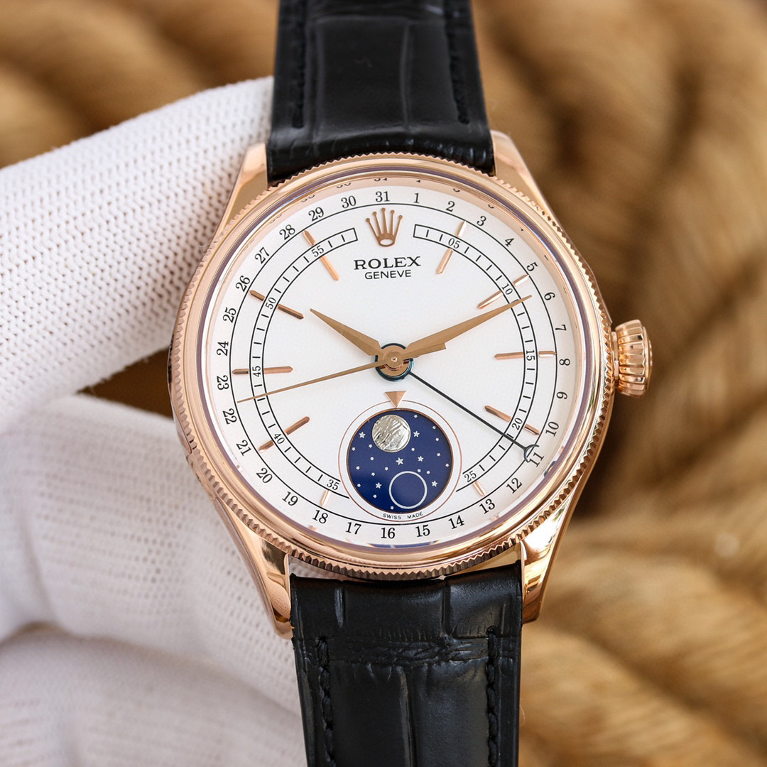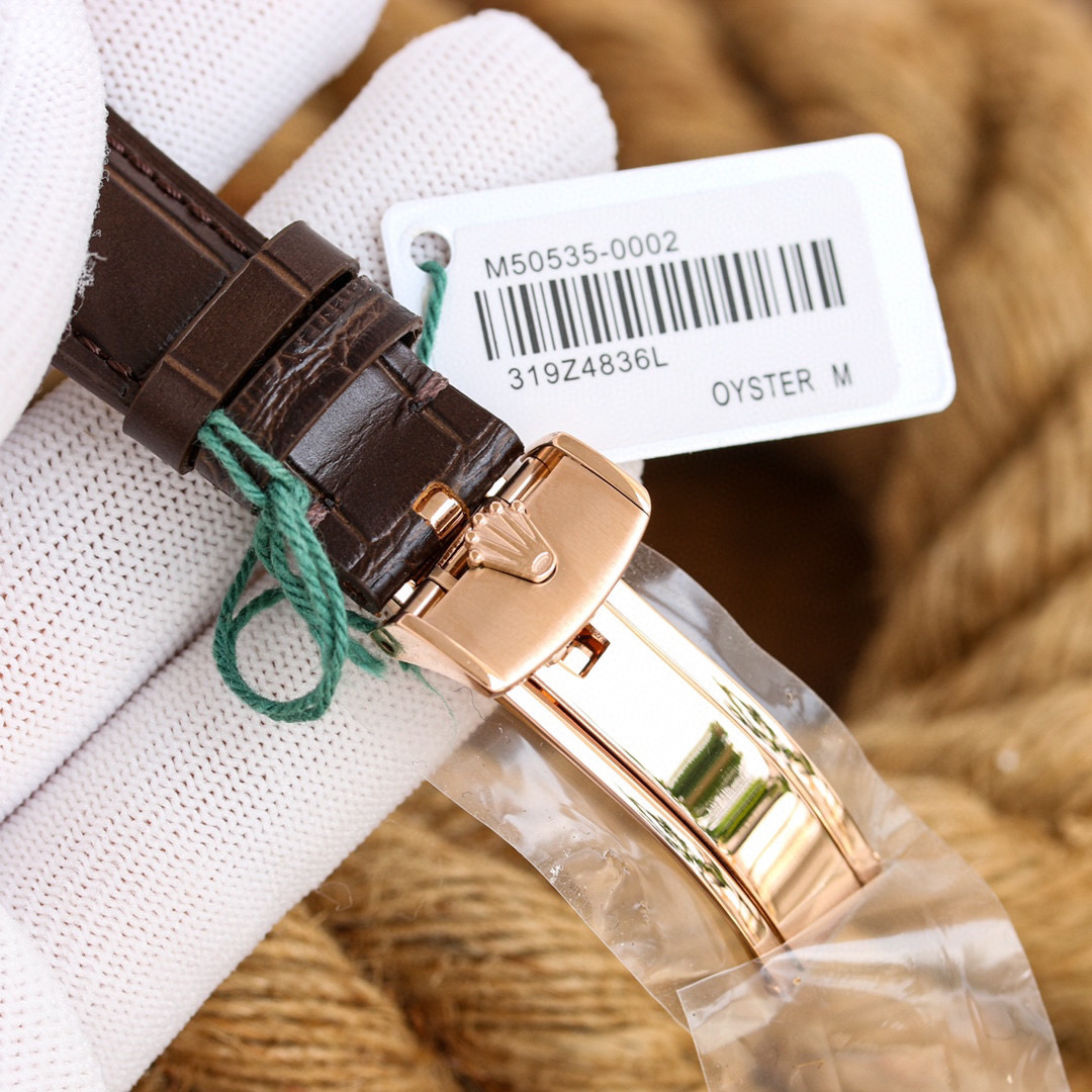 m50535-0002劳力士切利尼系列50535 39mm 多功能真月相【尺寸】:39mm【机芯】:『指针日历/月相』【表壳】:316L精钢 顶级电镀厚金+抗氧化保护,着重强调此电镀工艺比一般电镀更加耐磨,抗氧化,不用担心几个月就变色的情况。喇叭形旋入式上链表冠 上有劳力士标志【表盘】:白色高档漆面表盘【指针】:顶级批花工艺+蓝钢月牙指针【月相陨石材质,其天然不规则纹路清晰可见,呈现一致的效果,配...