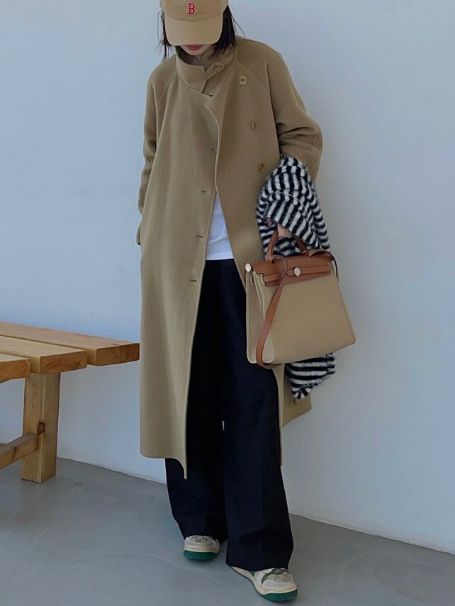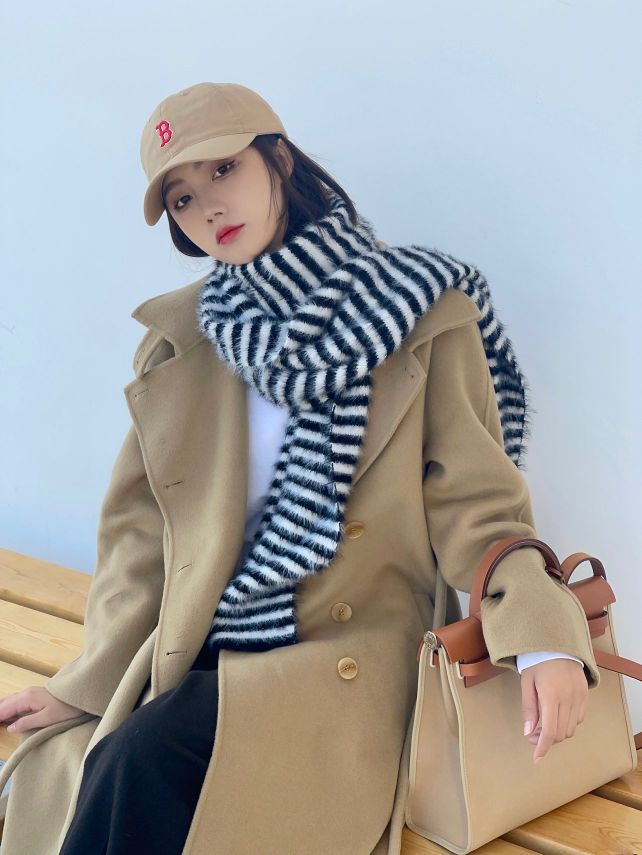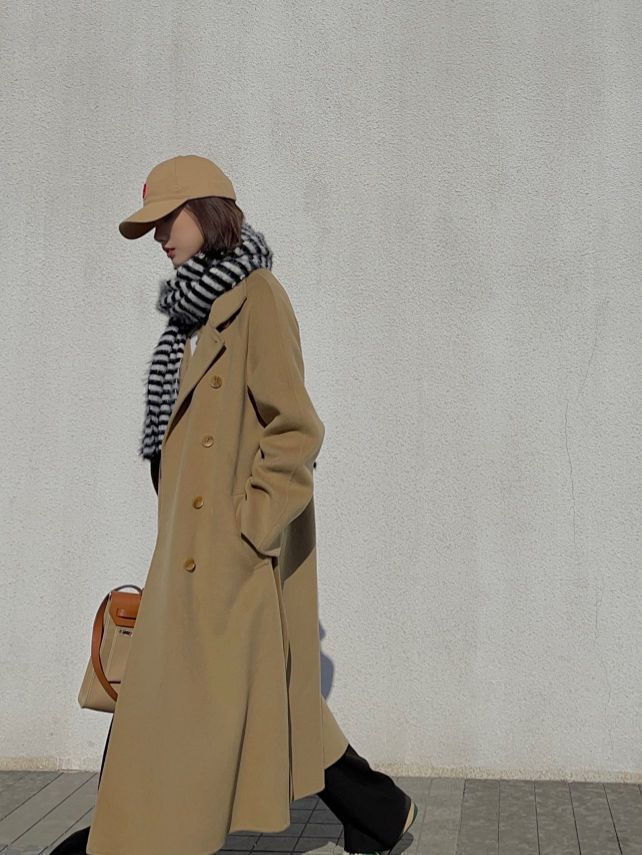 hihi✨友友们 感觉每年过冬都会入手一件驼色呢大衣🧥 百搭又温柔~~ 今天穿搭整体走休闲慵懒挂 再搭条条纹围巾🧣今日份穿搭的小亮点啦~ ——— 大衣:INSIS 裤子:RandomPiece 围巾:Oink 帽子:MLB