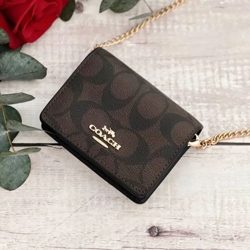 🍋以前总喜欢用长款钱包,随着现在小包的兴起背小包,都容纳不下长钱包了,终于入手了这款coach经典链条钱包,小巧便携方便携带。 🍋这个款式简约大方,棕色老花又百搭,毕竟经典不过时且耐脏,而且设计实用,材质真的是100个放心,容量大间隔多,重点是超级薄! 🍋小资女孩想买轻奢款,可以入手这款钱包,价格也便宜,爱了爱了