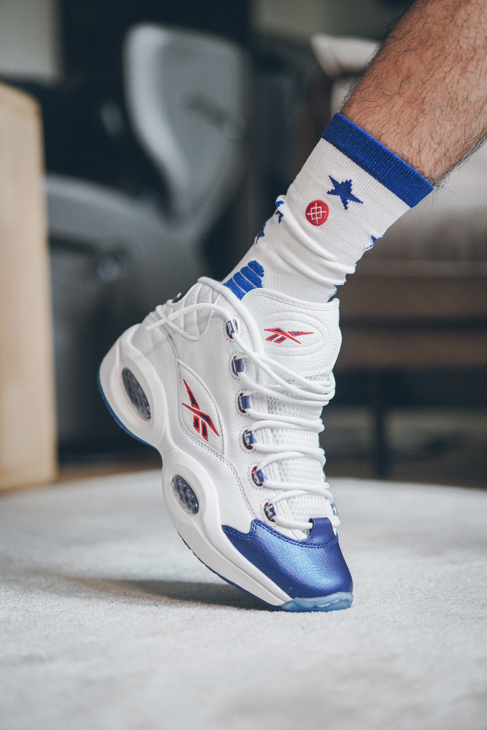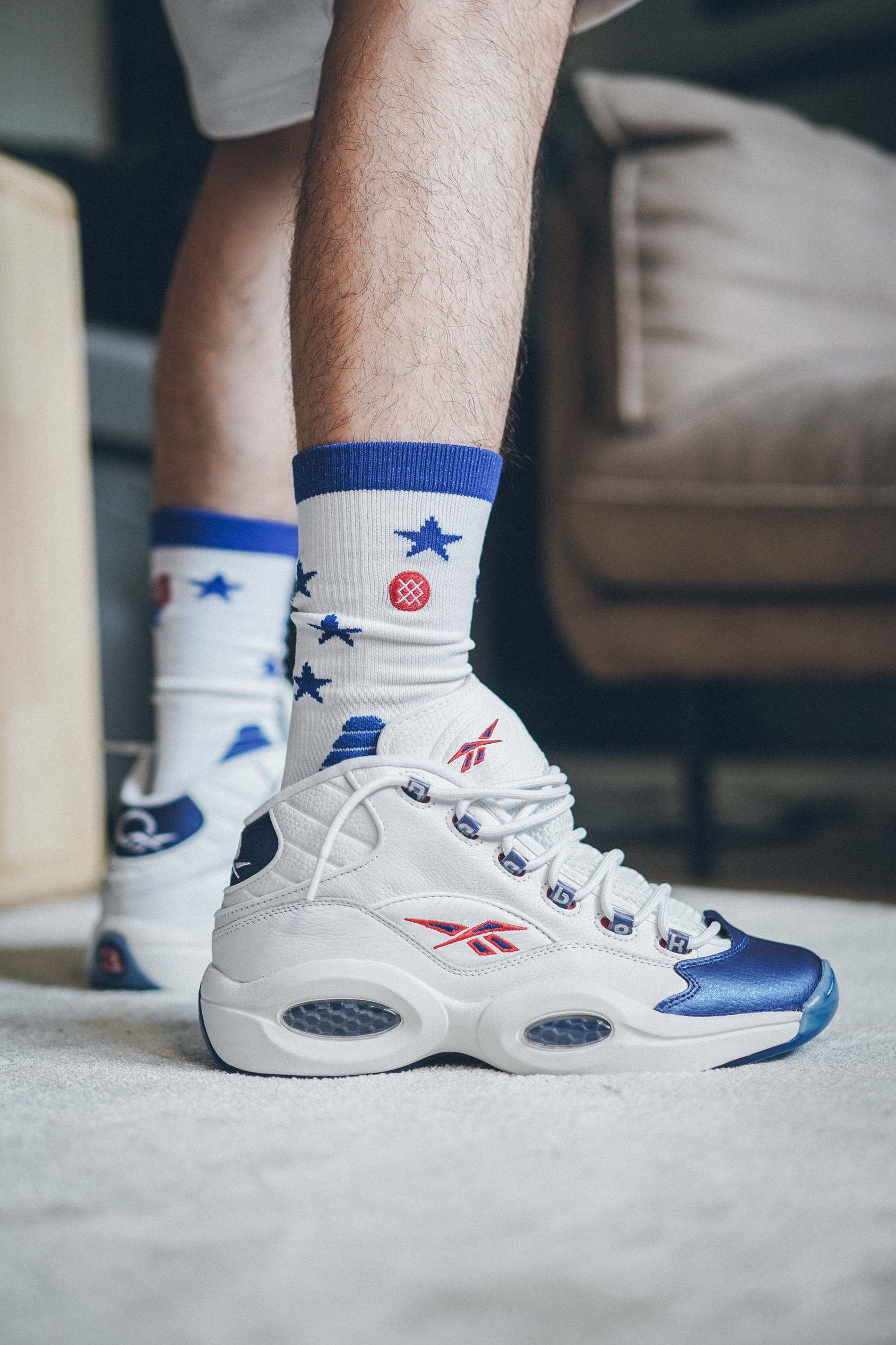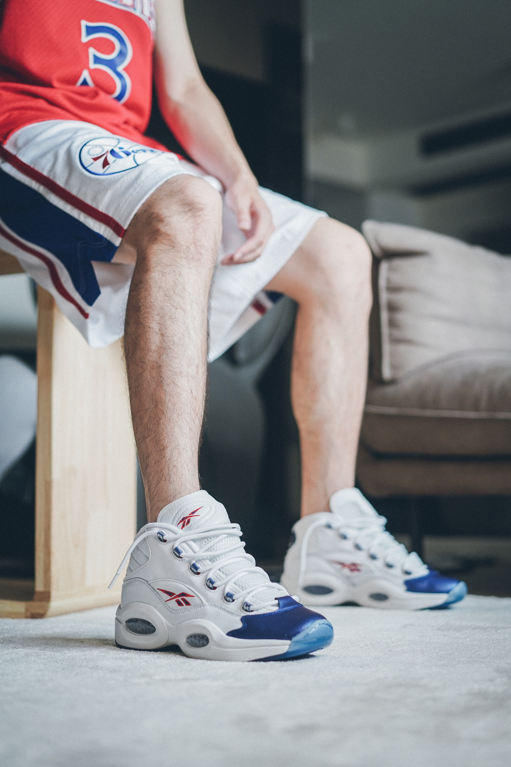 又到了我最爱的cosplay环节,这双蓝头Q1也是想拍挺久了。 今年复刻的这个Q1是真的品质上乘,鞋型,材质,质感都很到位(不敢说是不是还原,因为我也没摸过原年的)上脚效果不出所料的好看的一批。为了凑一套也特意穿了双76人的袜子,不过按照AI当年的习惯,应该还是穿船袜更帅一些吧?