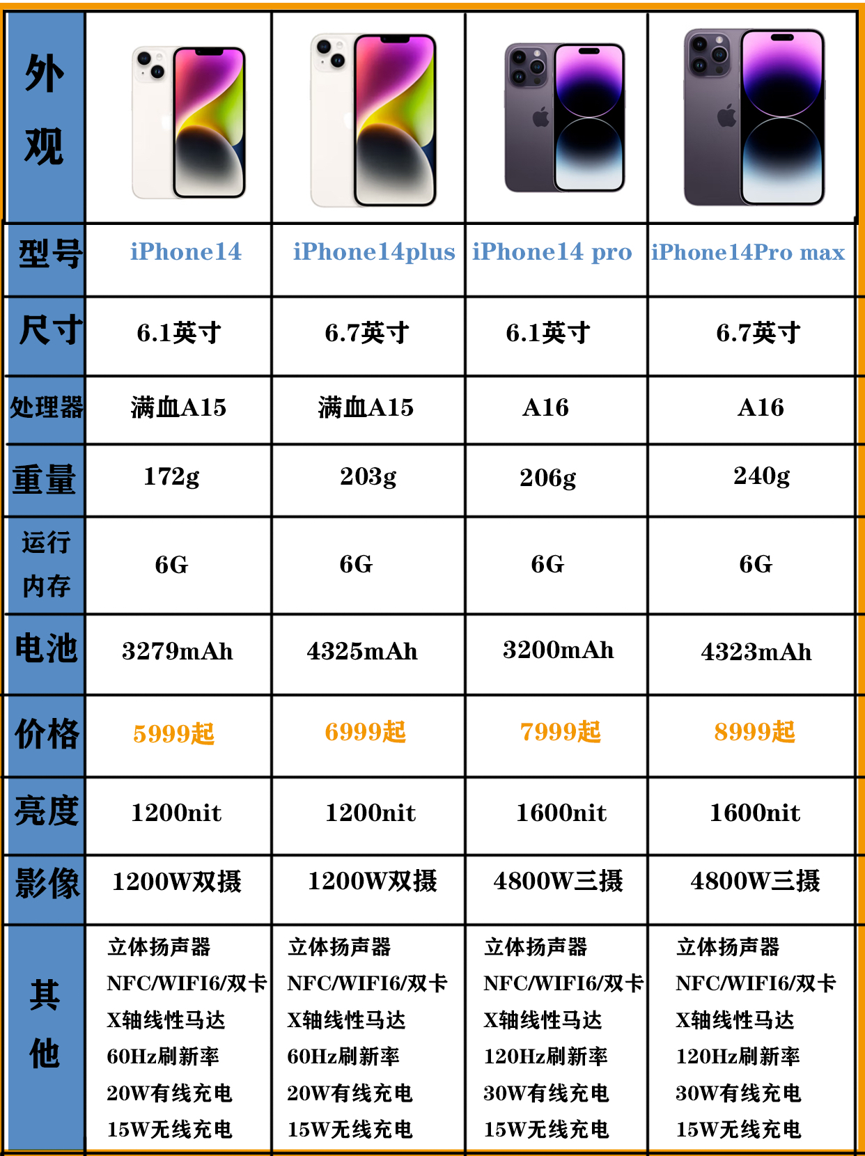 苹果14机型发布后,很多小伙伴看着满天的参数头晕转向,不知道如何选择今天教你告别选择困难症,选择合适自己的机型! 以下均为个人观点,仅提供参考! iPhone14 相比于iPhone13的4G运行,iPhone14的运行内存提升到了6G,搭载了A15处理器(增强版),实际相比A15提升不大,我的建议是,除非是特别想换新机型,其余的地方相比于上一代提升不大,再加上13价格跳水,综合考虑下来我觉得...