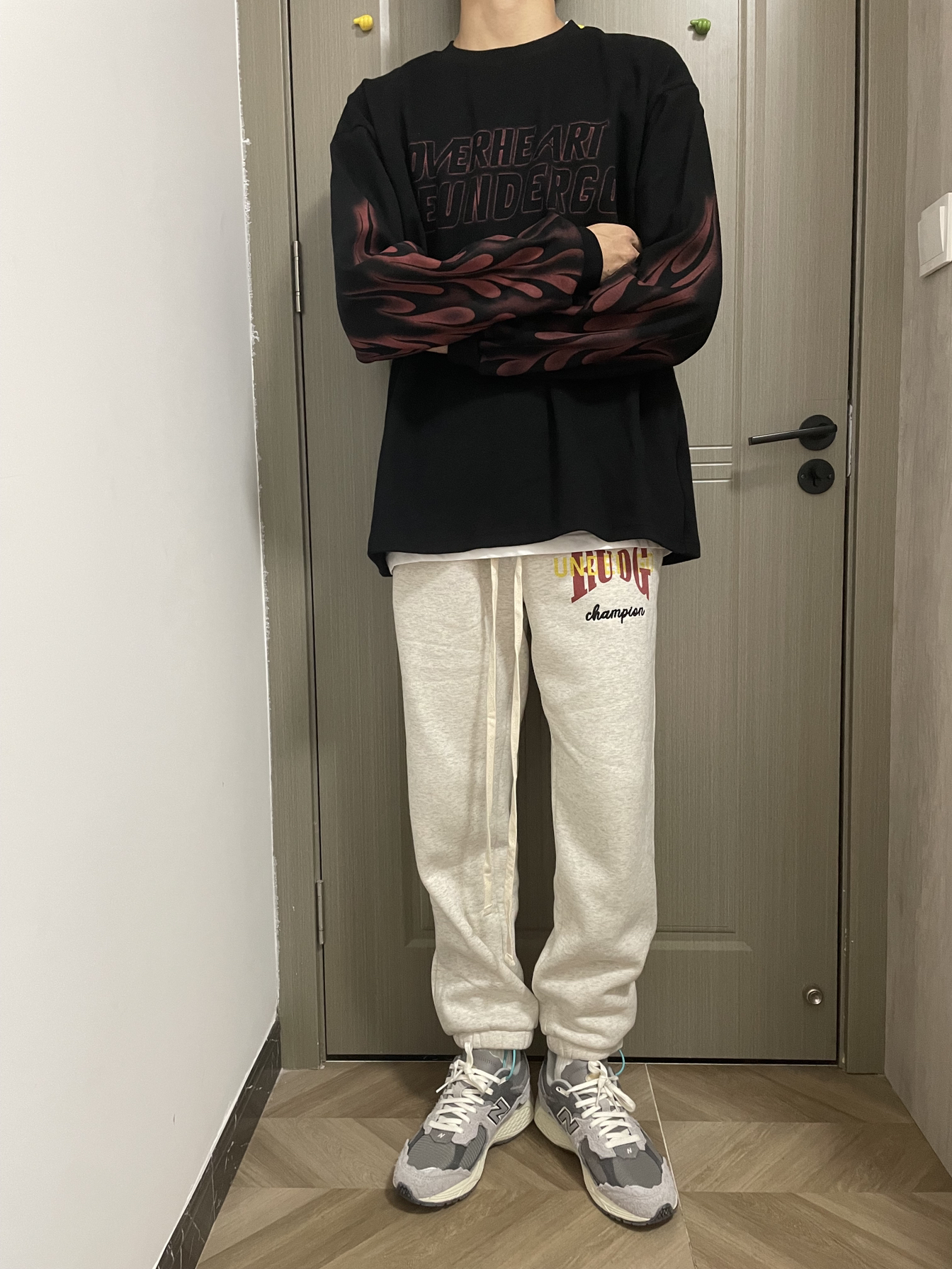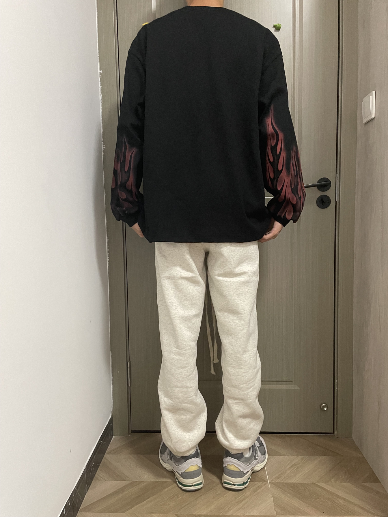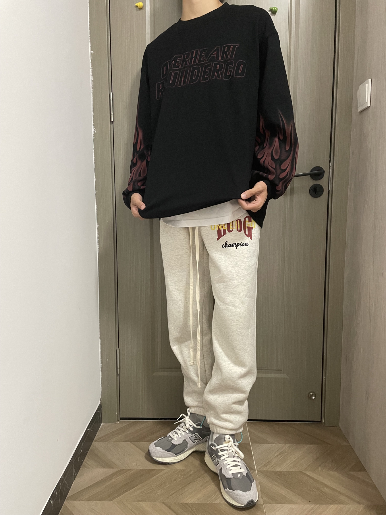 🏄秋季当然也要运动起来,运动风百搭风 ♻️黑白叠穿灰色运动裤,既能保暖还适合运动 · 👉上身是一款黑色火焰袖薄绒卫衣,白色打底 👉下身是一款灰色运动裤,内有薄绒 · ✅整体感受:版型宽松,面料舒适 · ——————————————————— 衣服👔:黑色火焰袖卫衣//L · 裤子👖:灰色运动裤//L · 鞋名👟:New Balance 2002R 云雨灰//41 —————————————————...
