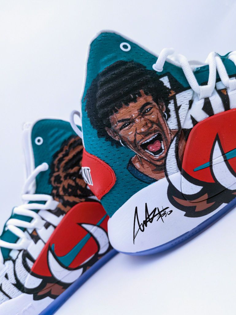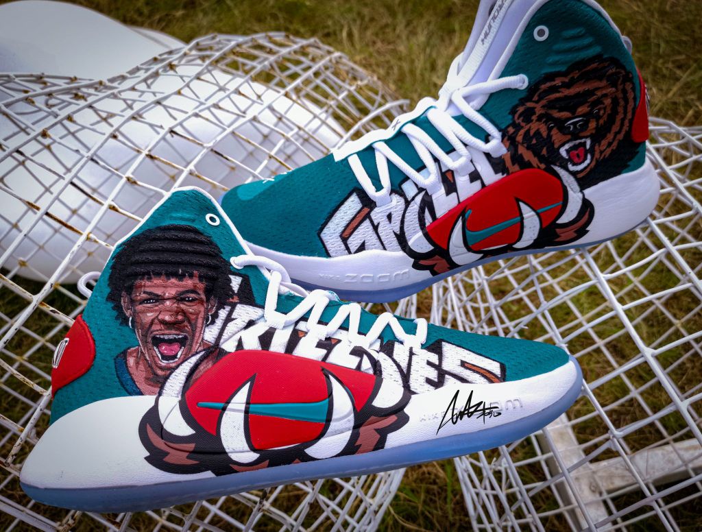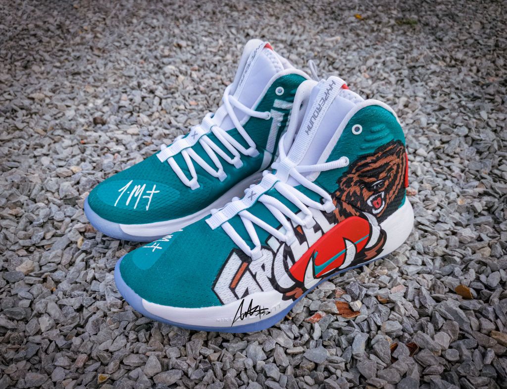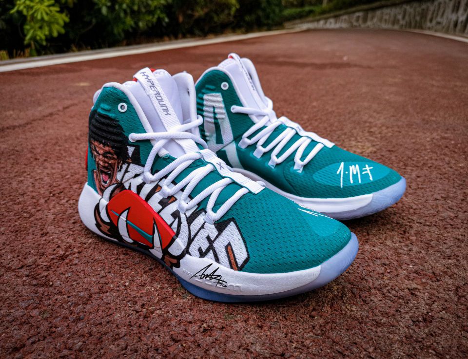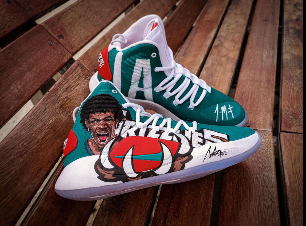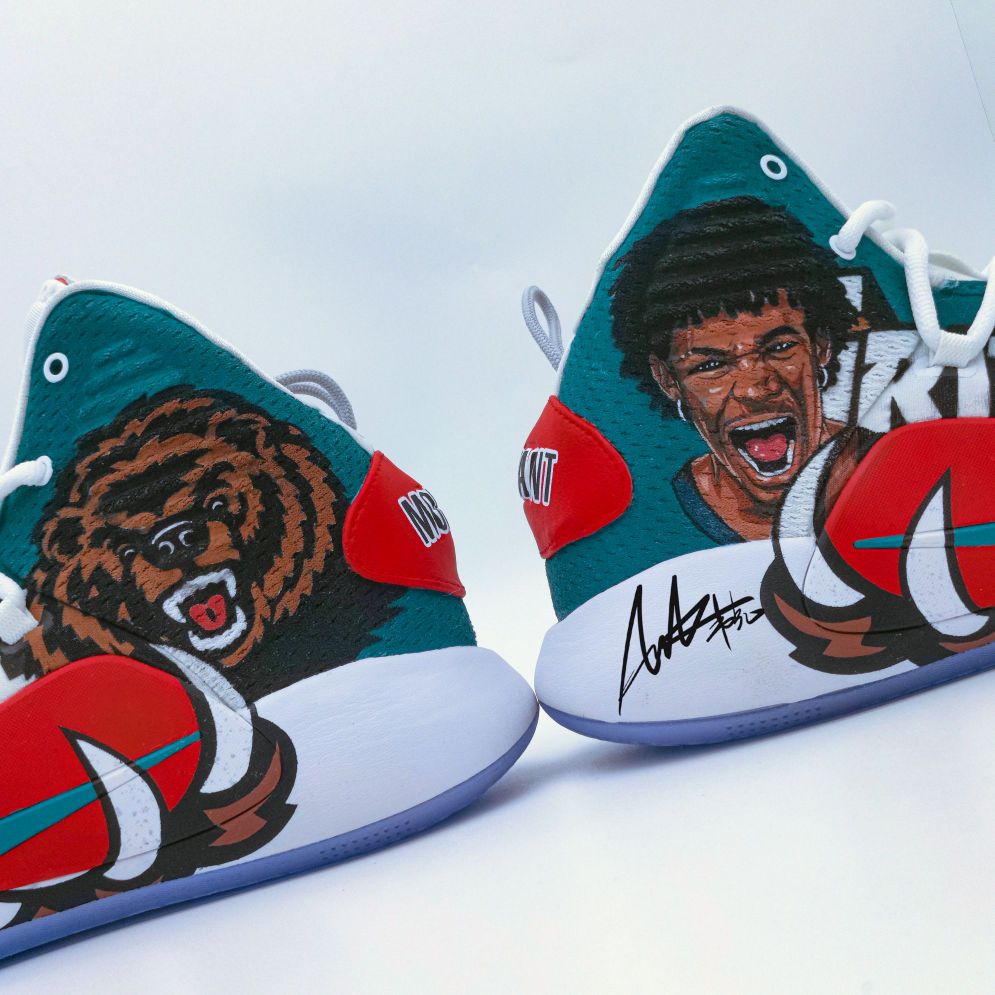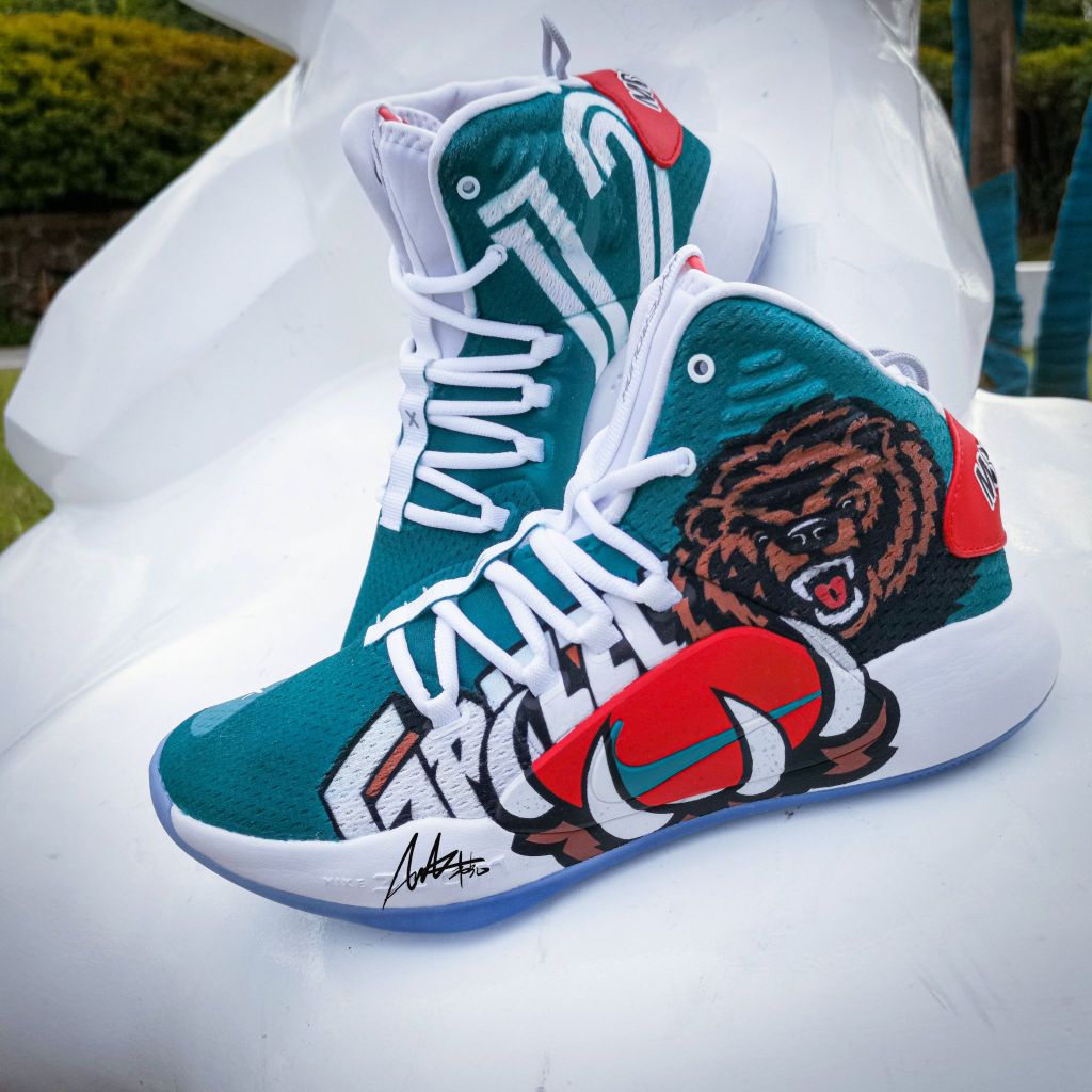 定制原鞋:Nike hyper dunk 2018 X 结合灰熊队复古球衣元素,将灰熊队logo拆解,突出经典的熊爪元素夸张化,握住足弓tpu位置。在鞋身,呼应灰熊队logo咆哮的熊头,另一只脚也同样是咆哮的莫兰特。正当时,意气风发,如猛兽,狂放且无所畏惧。 作者:AWAKER 韦克