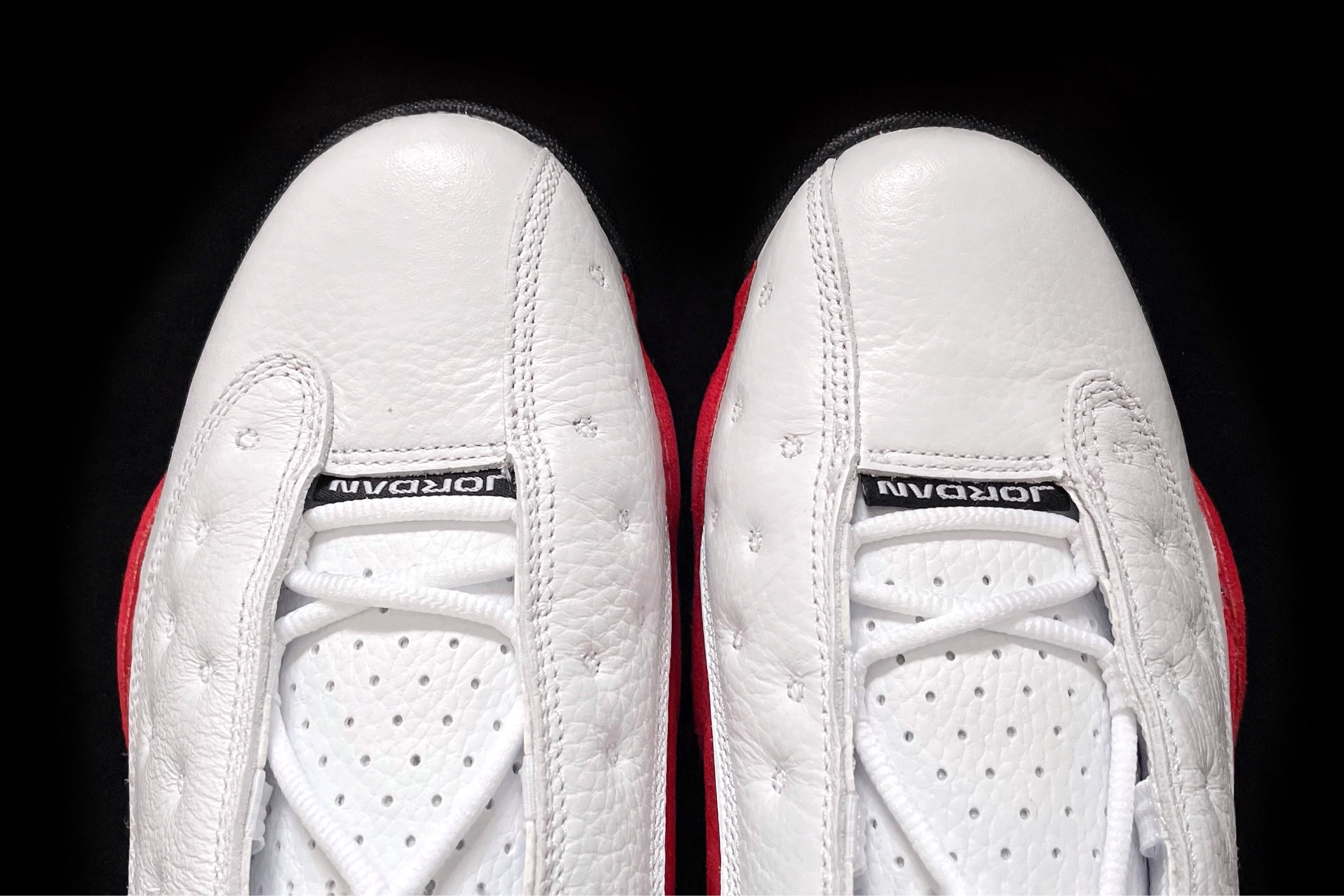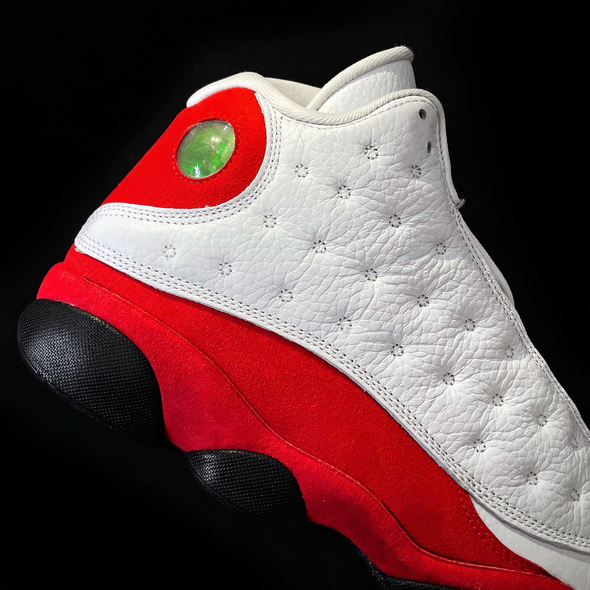 【AJ13 “Chicago” 亮上细节📸】 详细的介绍在上一个文案里已经发过了,值得一提到是:各位可以从图二看出来鞋头和鞋身内侧皮子的切线基本上是一条线下来的,而真正的OG款是呈“༼ ”这种样子的,等之后出一期对比再和给我解释一下。 另外这双鞋的“猫眼”还是挺亮的,毕竟才刚过3年,可能因为角度不好让它显得非常浑浊吧! 爱不释手,爱不释手😆😆