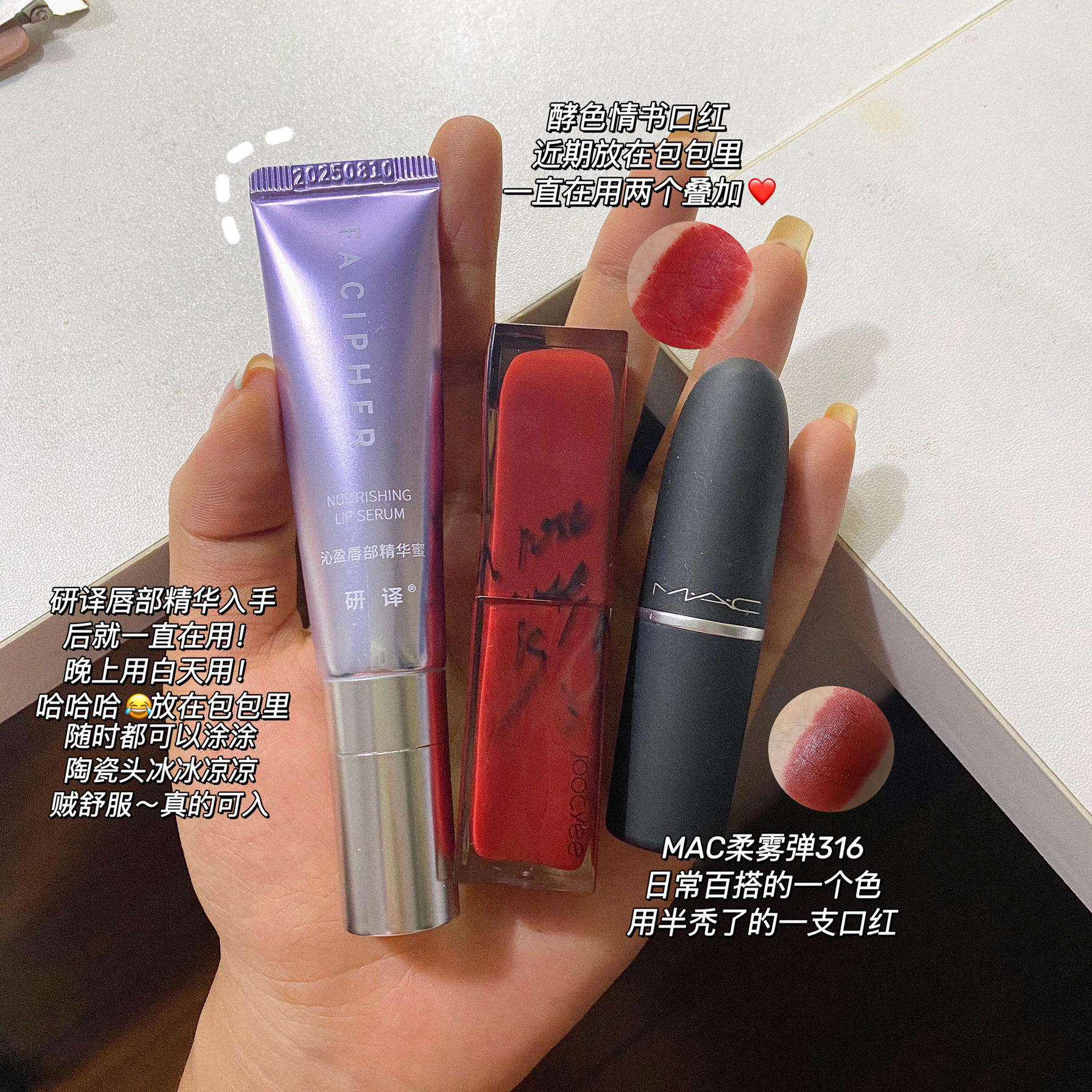 本篇笔记关联了MAC/魅可 尤雾弹丝缎柔雾子弹头口红 雾面显白哑光 3g 316柔雾小辣椒DEVOTED TO CHILI、酵色 奶茶眼影盘 持色 9g 焦糖盘、安野屋 铝管经典植萃香氛护手霜 烟酰胺亮白水润保湿持久留香 黑檀木与雪松等商品,为用户提供真实的使用体验和购买参考。