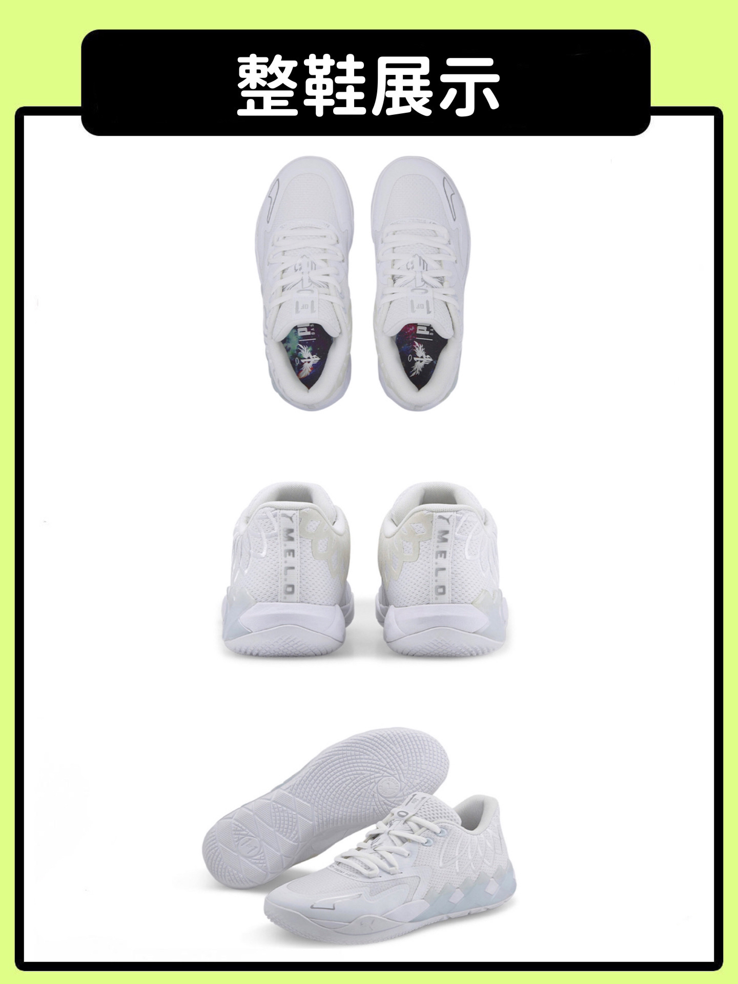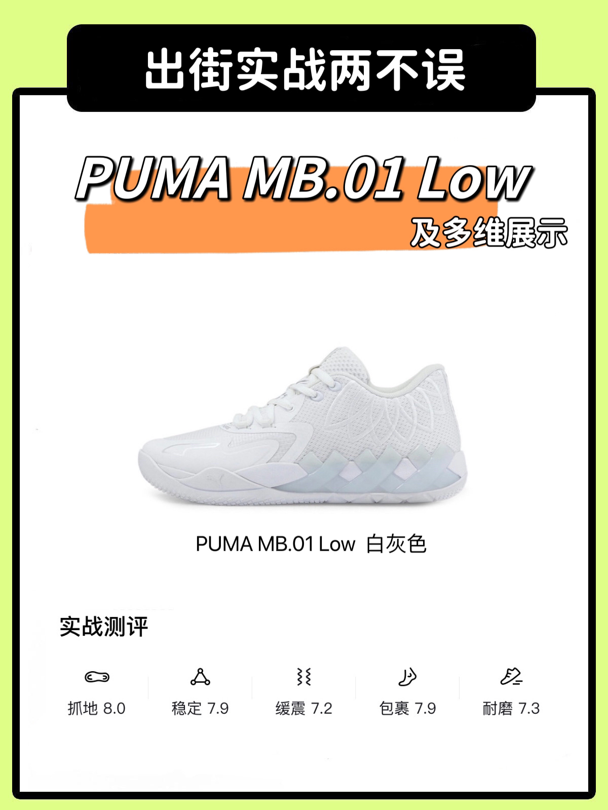 👟球鞋名称: PUMA MB.01 Low 白灰色 拉梅洛鲍尔一代 MB.01是PUMA自18年回归篮球市场后发布的第一双球鞋签名鞋,PUMA携手NBA新秀Lamelp Ball 拉梅洛鲍尔(三球)开启新的纪元发。此前发售的三球均已极为吸睛的配色为主,而在最近,万众期待的纯白低帮它来了! 🔍设计亮点: 纯白MB.01一改之前的花哨风格,向经典与百搭靠齐,鞋帮侧面呼应“Melo”小腿火箭图案的翅膀...