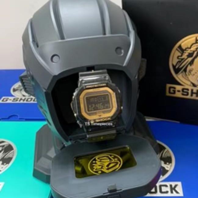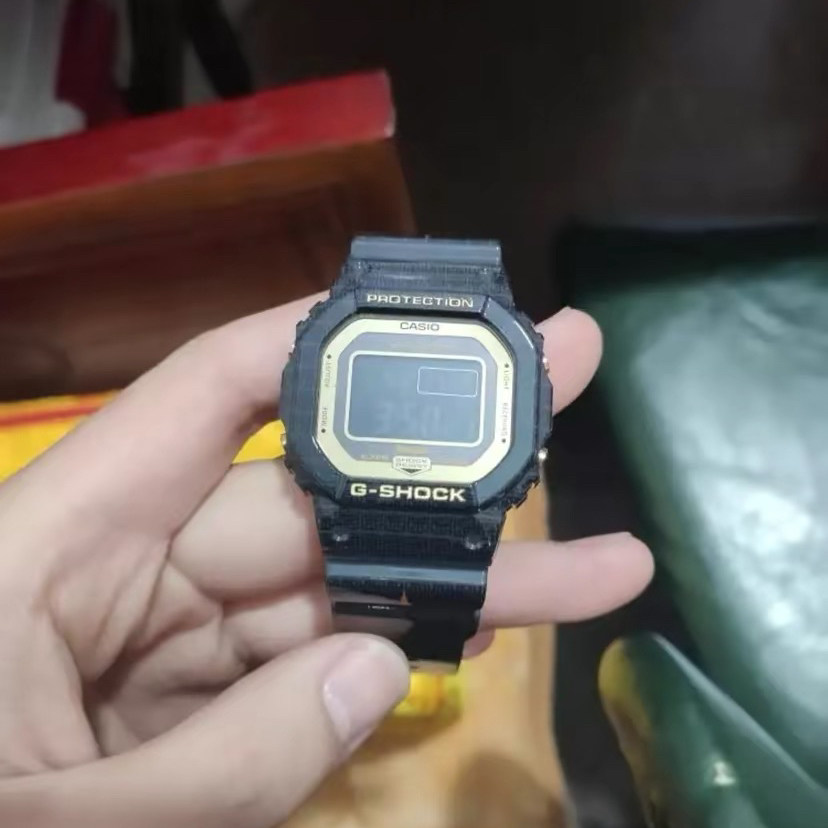 款式名称:【三国五虎将联名】Casio/卡西欧 G-SHOCK 马超虎头湛金太阳能蓝牙小方块运动男表 GW-B5600SGM 颜色:树脂材质低调的黑金配色表带和表身,反显表盘,小方砖版型 细节:黑色的表带和表的外框都有暗纹,在光线充足的情况下会明显一些,这样显得黑色的手表不那么沉闷。 功能:可以蓝牙调整时间和设定闹钟以及时区等。太阳能电池,石英机芯。200防水。对于日常佩戴这些功能是足够用了...