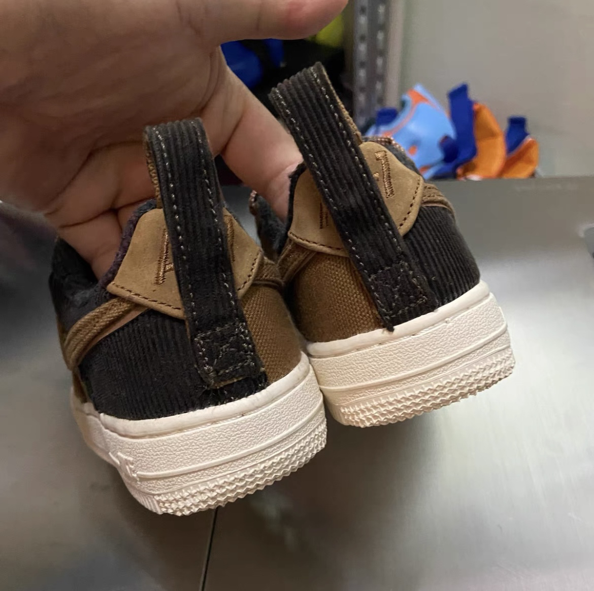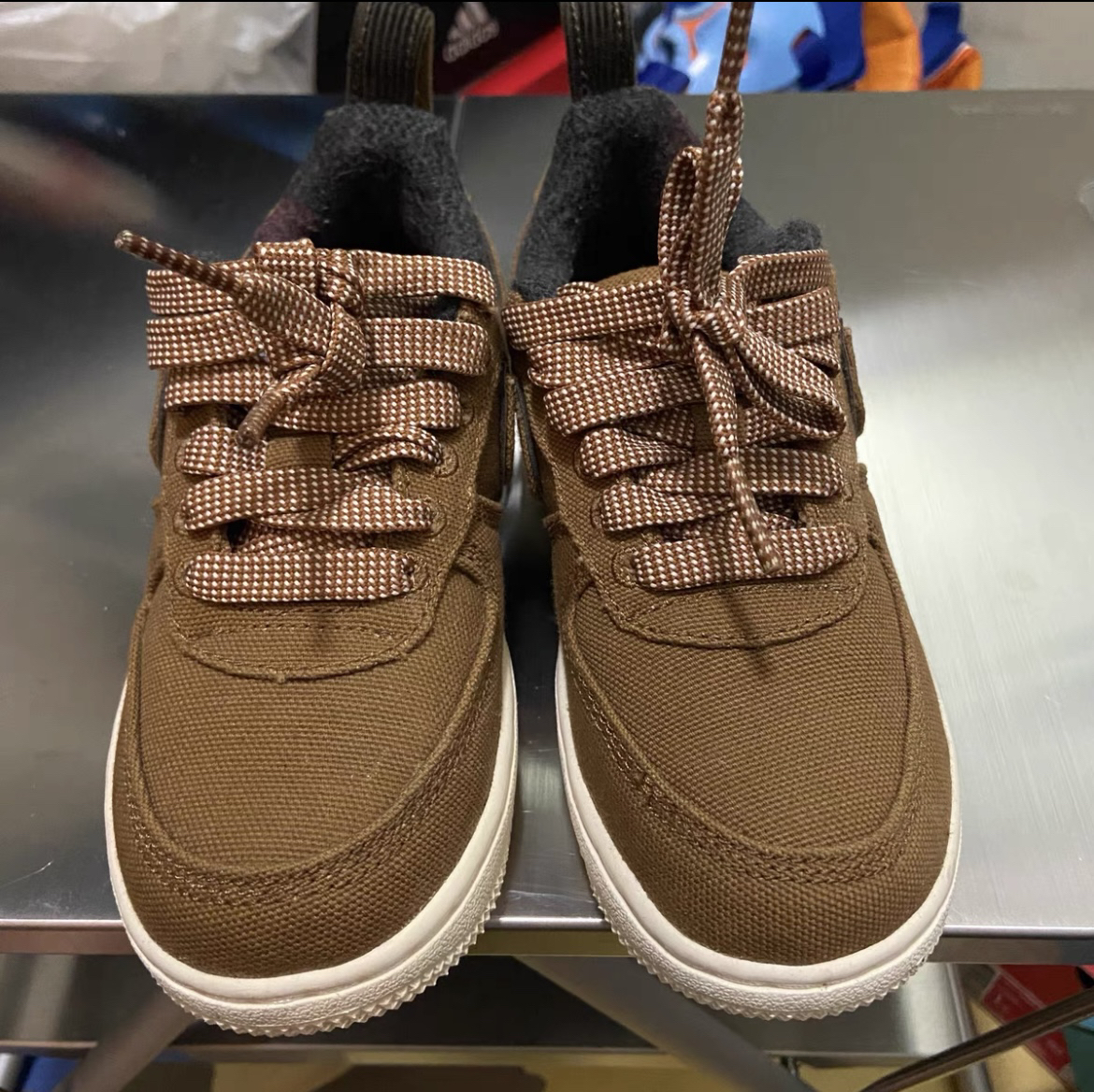 价格便宜适合学生党必备 颜值百搭在学校方便穿搭 脚感无敌平常压马路没问题!!! 🔥🔥🔥 实物虽然如同预想图般采用 Air Force1 作基调,同样的 Carhartt WIP 招牌棕色调,但最终设计却带来些微变化,鞋跟部分采用了黑色撞色,而后跟则额外添加抽带。