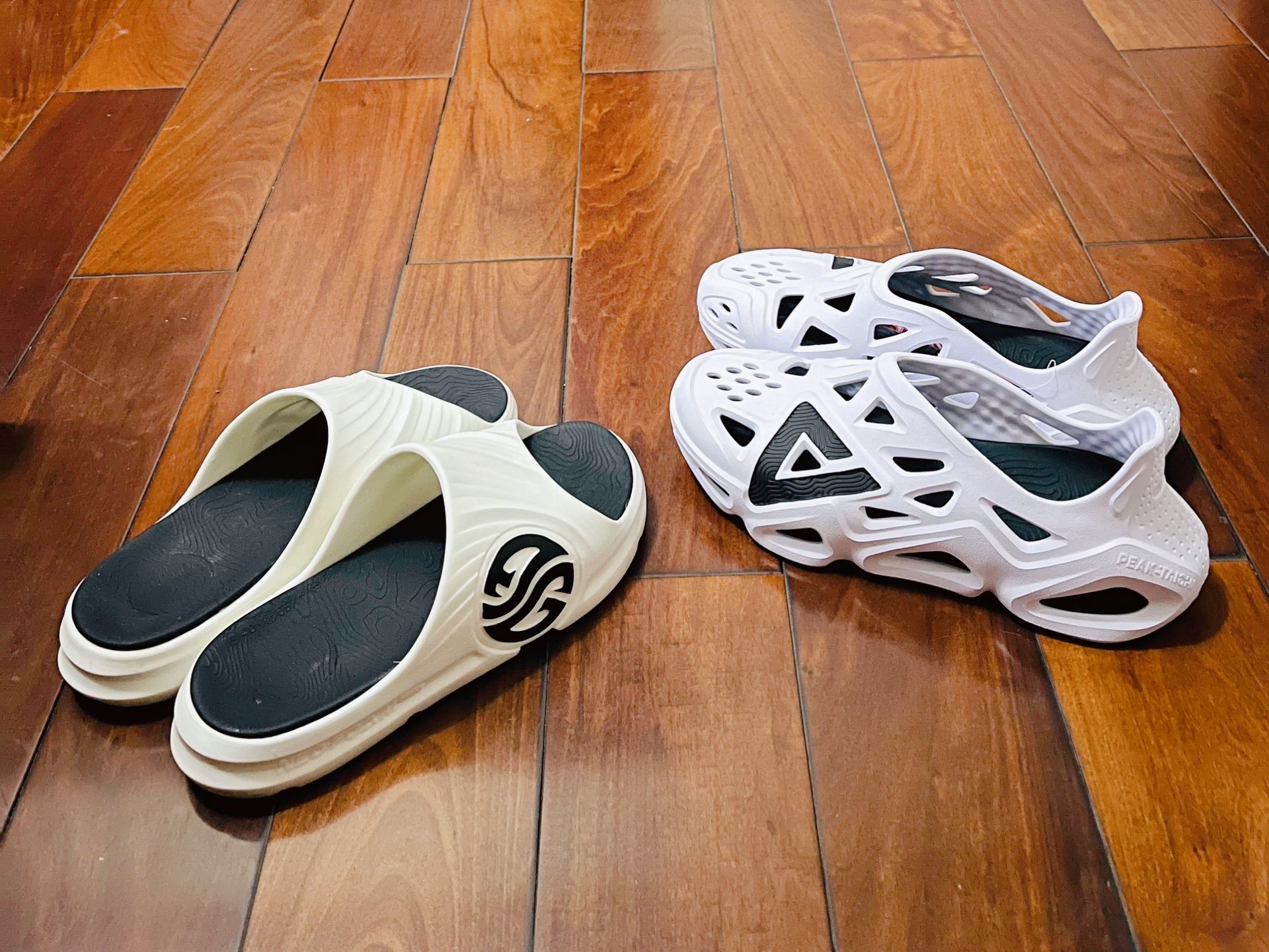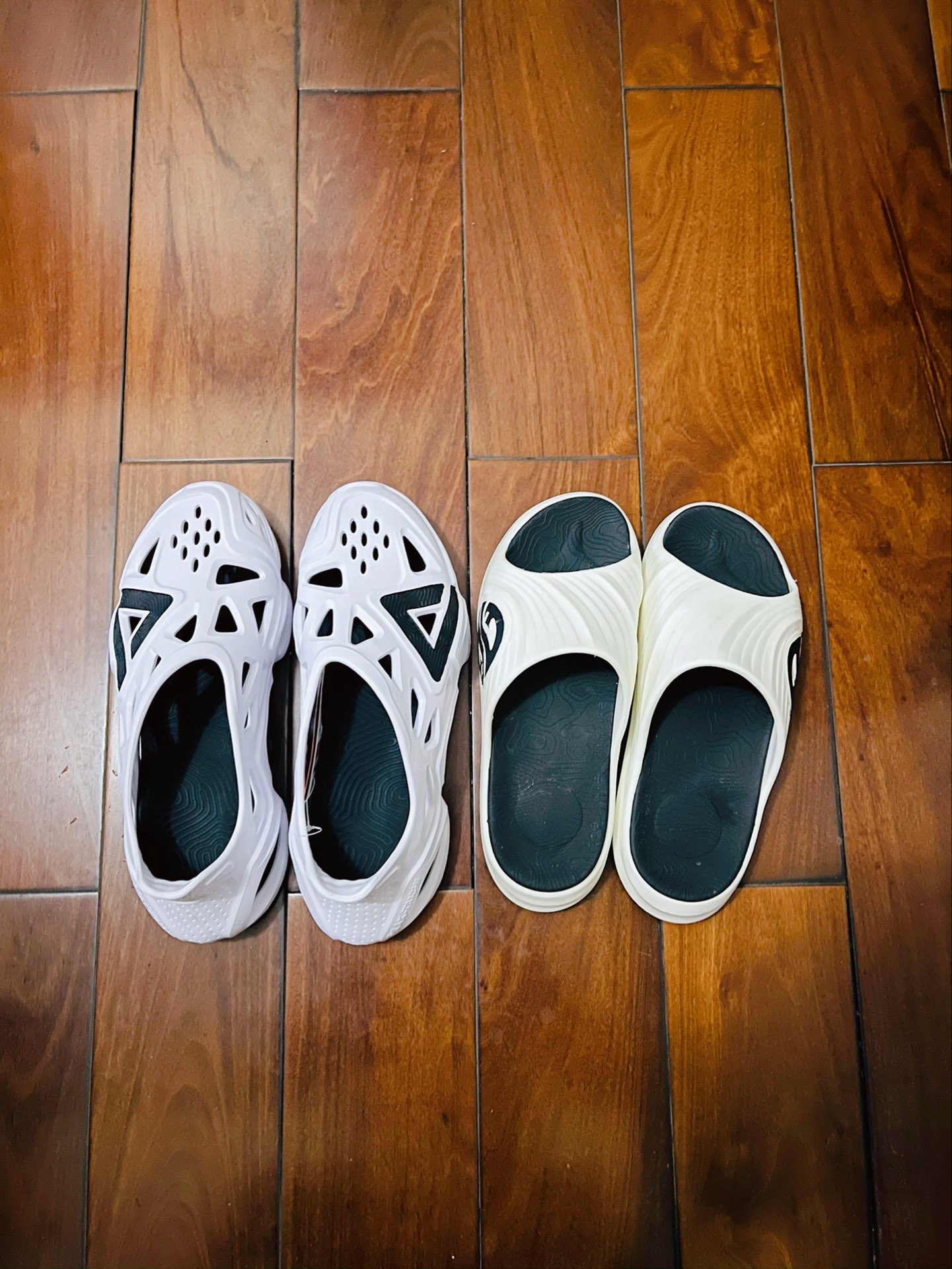 #匹克 #361° 夏天来了你会选择一双拖鞋还是一双很酷的凉鞋呢? 361的白色是类似于米白色,而匹克是纯白色。 匹克中底运用了态极科技,361则是NFO,在脚感上可以说是旗鼓相当,都十分软弹! 最关键的是两双都可以下水,也是十分棒了。 最后说一下尺码问题,图中两双都是同样尺码,可以看出来匹克更大一码,所以买的时候匹克一定要按小一码买!