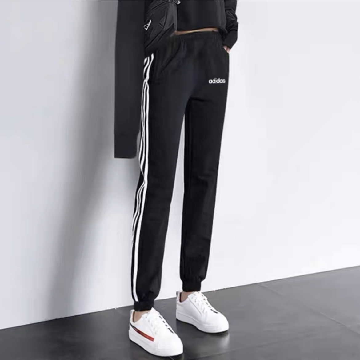自从运动风的热潮刮不停,我也陆续入了好几条条纹运动裤。说说这条~ BUT这条是男款,可以穿高腰也可以当低腰裤,因为女款实在太紧身~怎么能显腰线?那最重要的就是搭配一件高腰的上衣咯,上衣尽量我不选择花哨的,因为裤子的白色条纹已经很抢眼了。如果想再性感一点上衣就选择紧身哒~ (图片来自网络,侵删)
