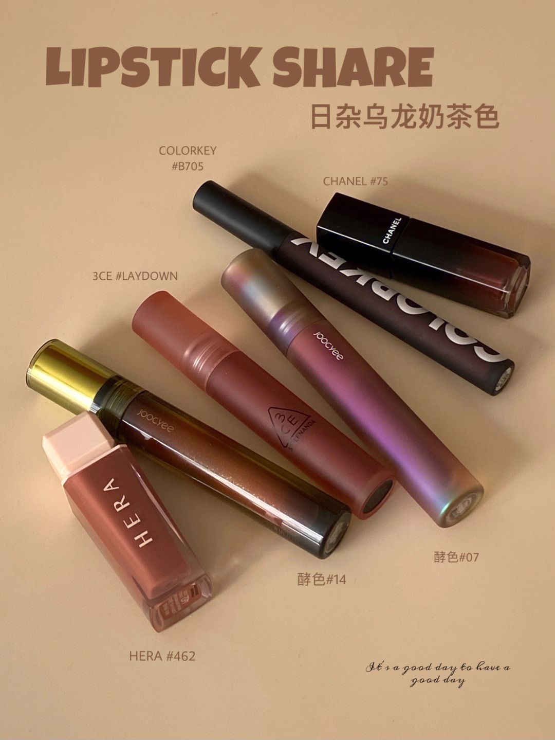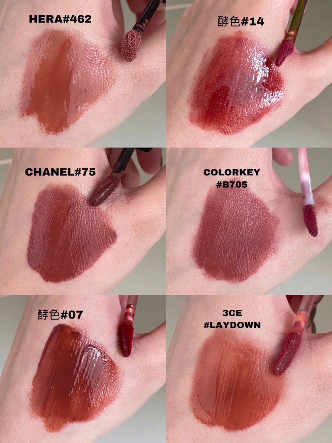 给大家分享一波最近涂的几个镜面唇釉!清透感的唇釉不能缺席啊! 🔸hera 462 妥妥的奶咖色,上嘴特别清透,很日杂哦! 🔸酵色14 杏梨乌龙 木质调乌龙,自带清冷感的裸棕茶,还带一些碎闪,又仙又欲! 🔸香奈儿75 日杂风满满的焦糖红棕奶茶,好驾驭,温柔又高级! 🔸3ce laydown 乌龙奶茶色,清透低饱和色调,上嘴很嫩,成膜速度可! 🔸珂拉琪 B705 焦糖奶茶,带点紫调,温柔纯! 🔸酵色...