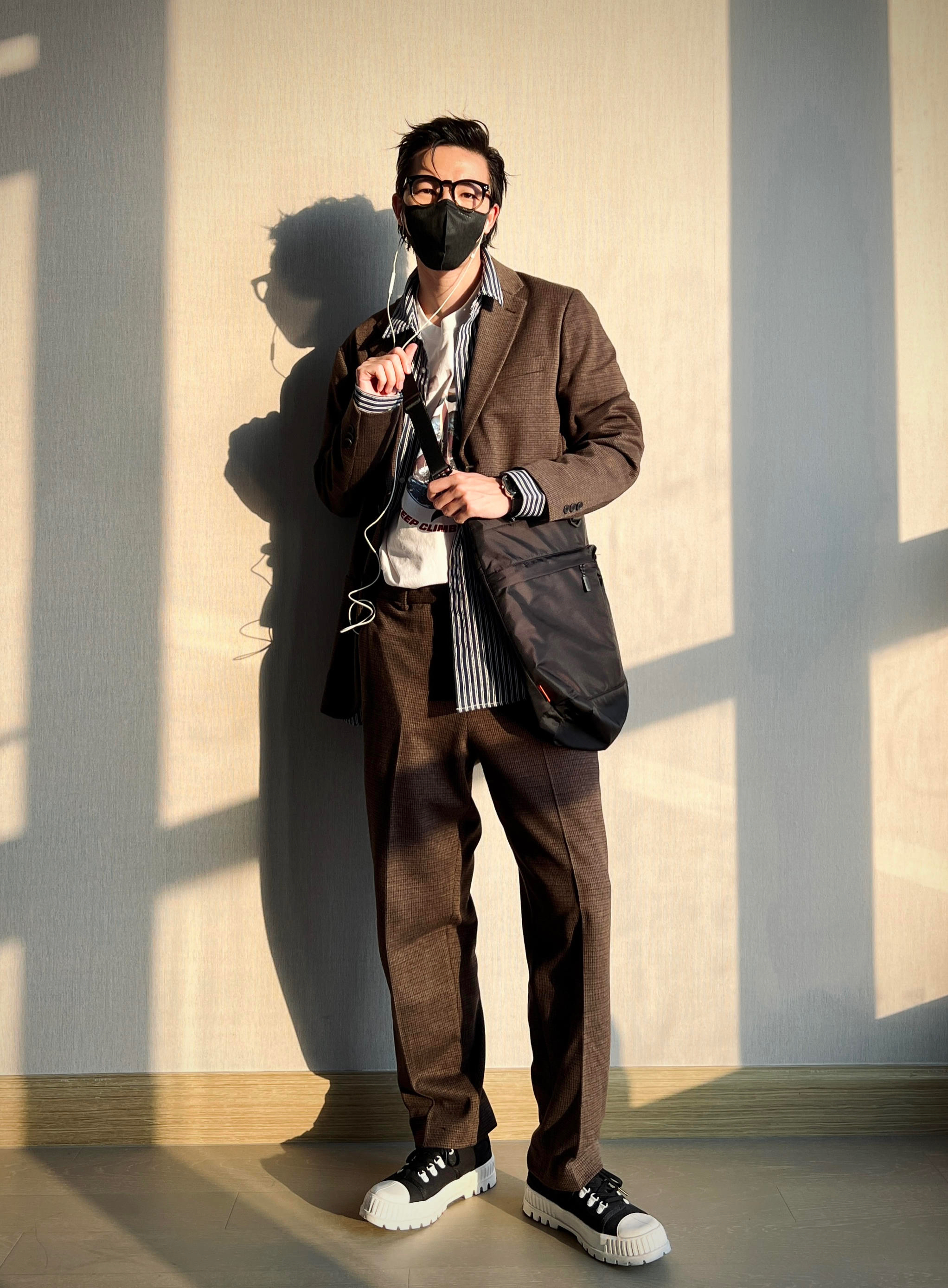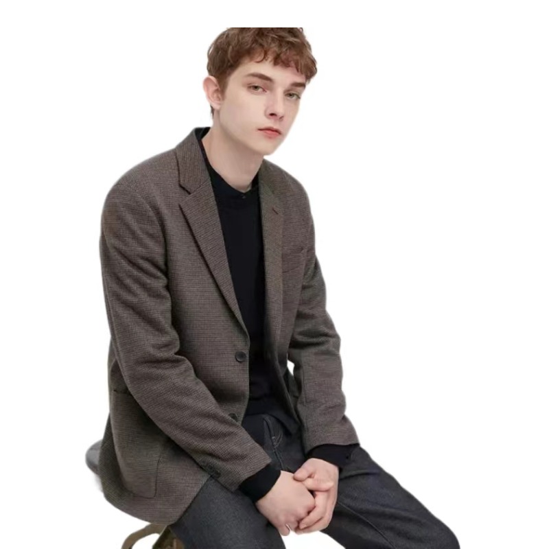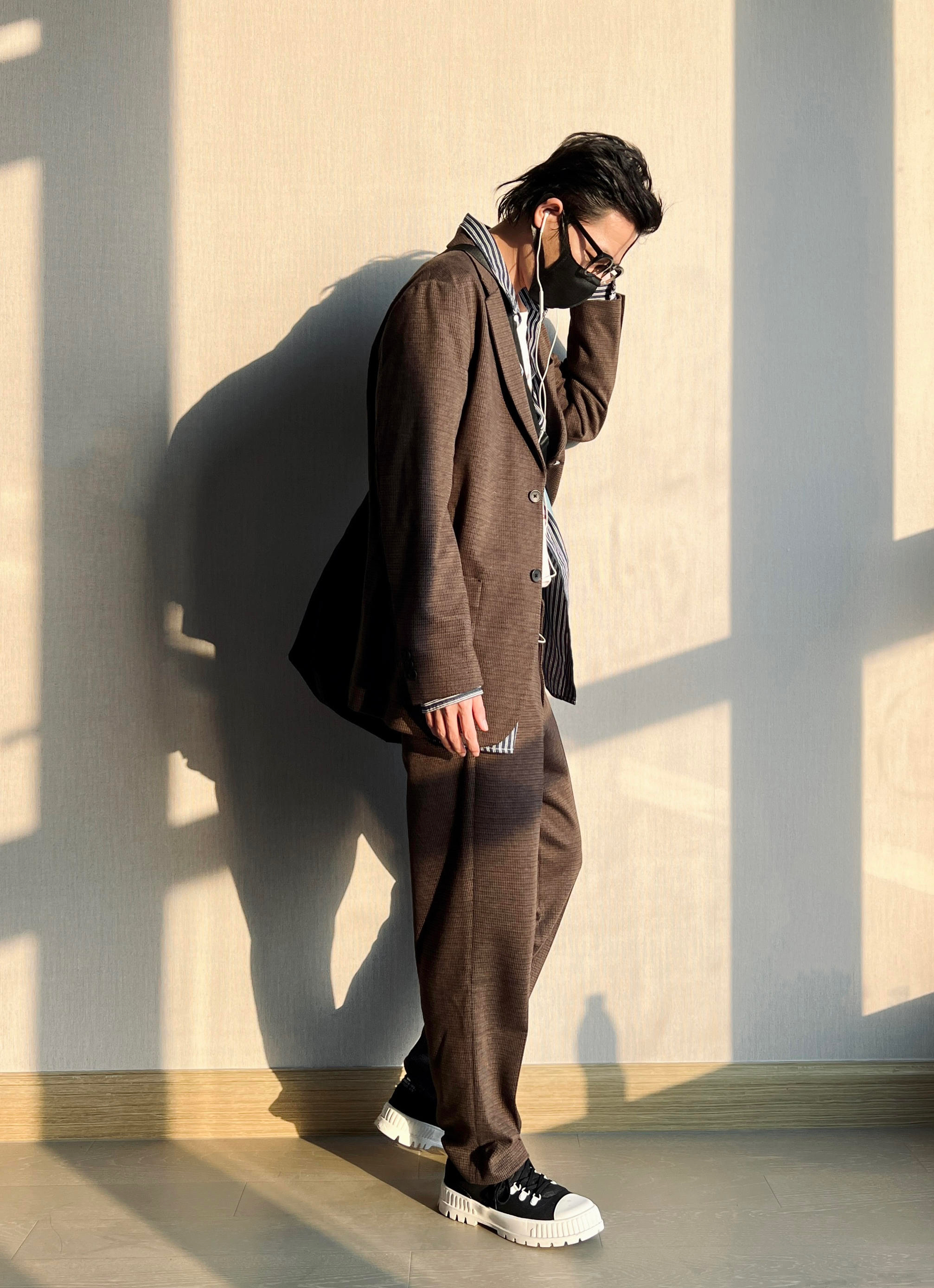 深褐色格纹西装套装 版型偏英伦复古的那种风格 可以选择大一码的size 内搭条纹衬衫穿出另一种style 让整个穿搭更有层次也更具少年感