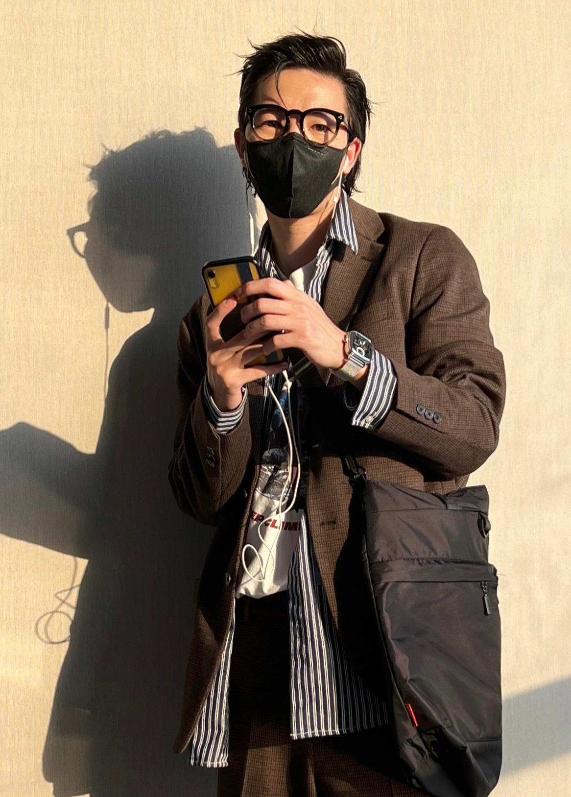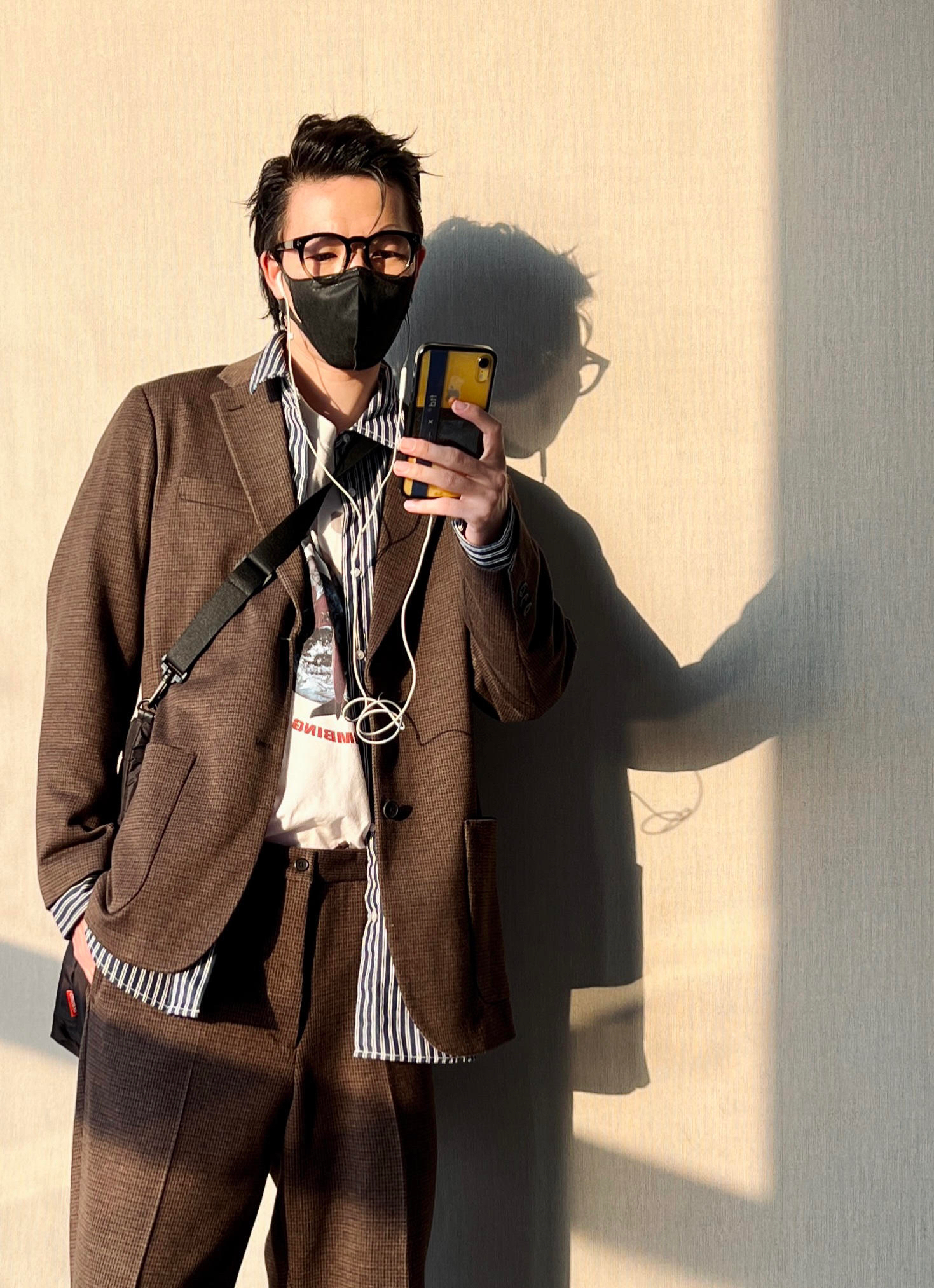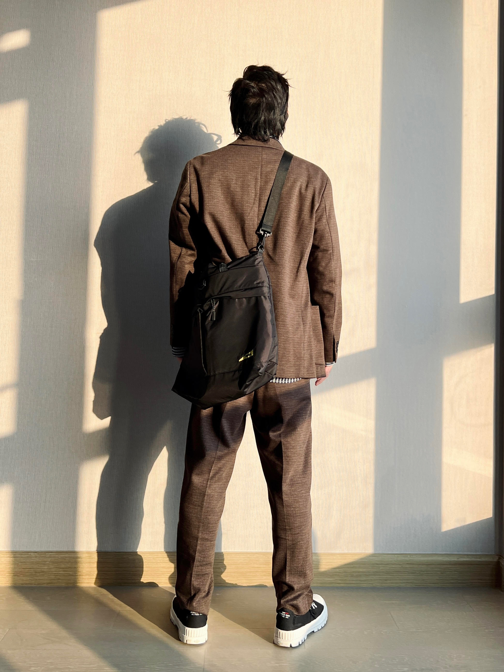 深褐色格纹西装套装 版型偏英伦复古的那种风格 可以选择大一码的size 内搭条纹衬衫穿出另一种style 让整个穿搭更有层次也更具少年感